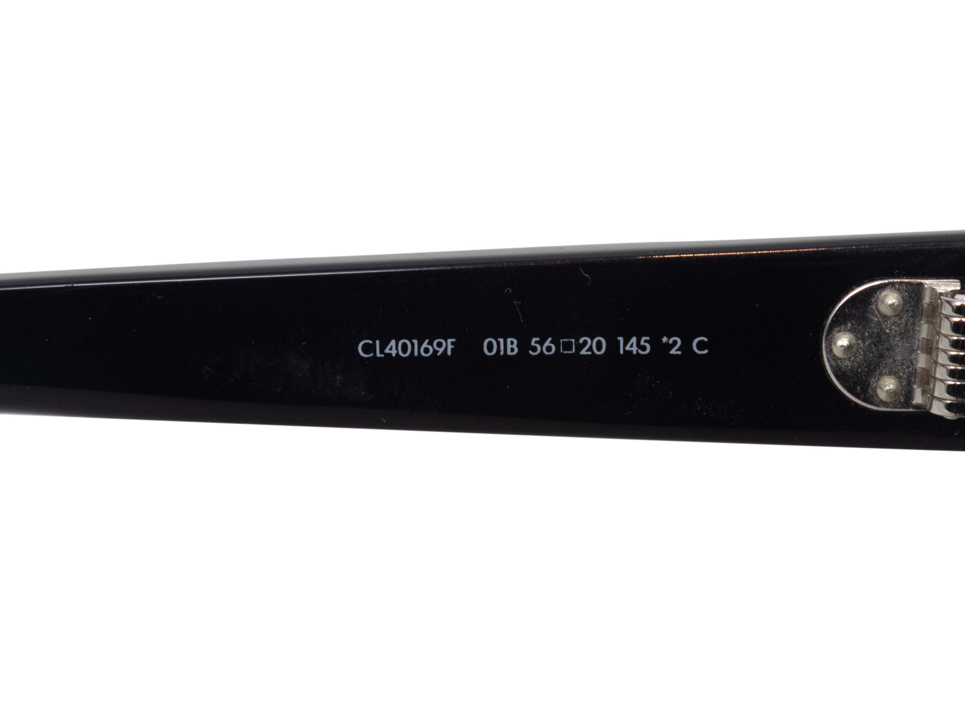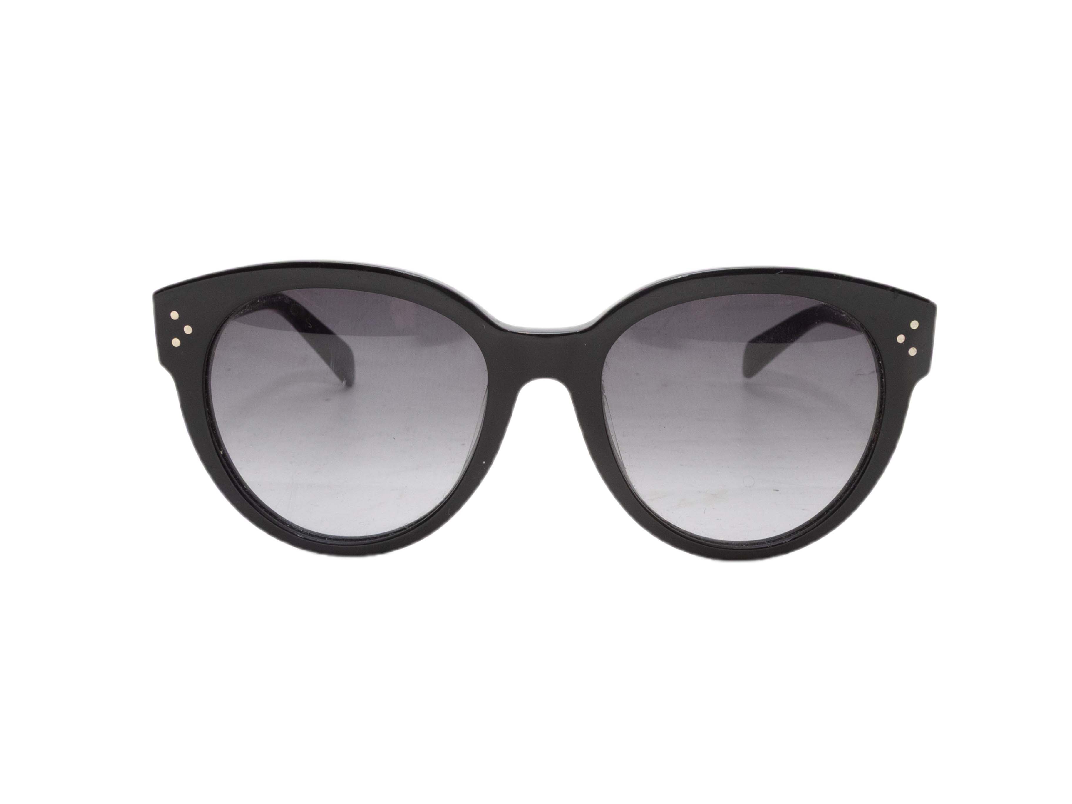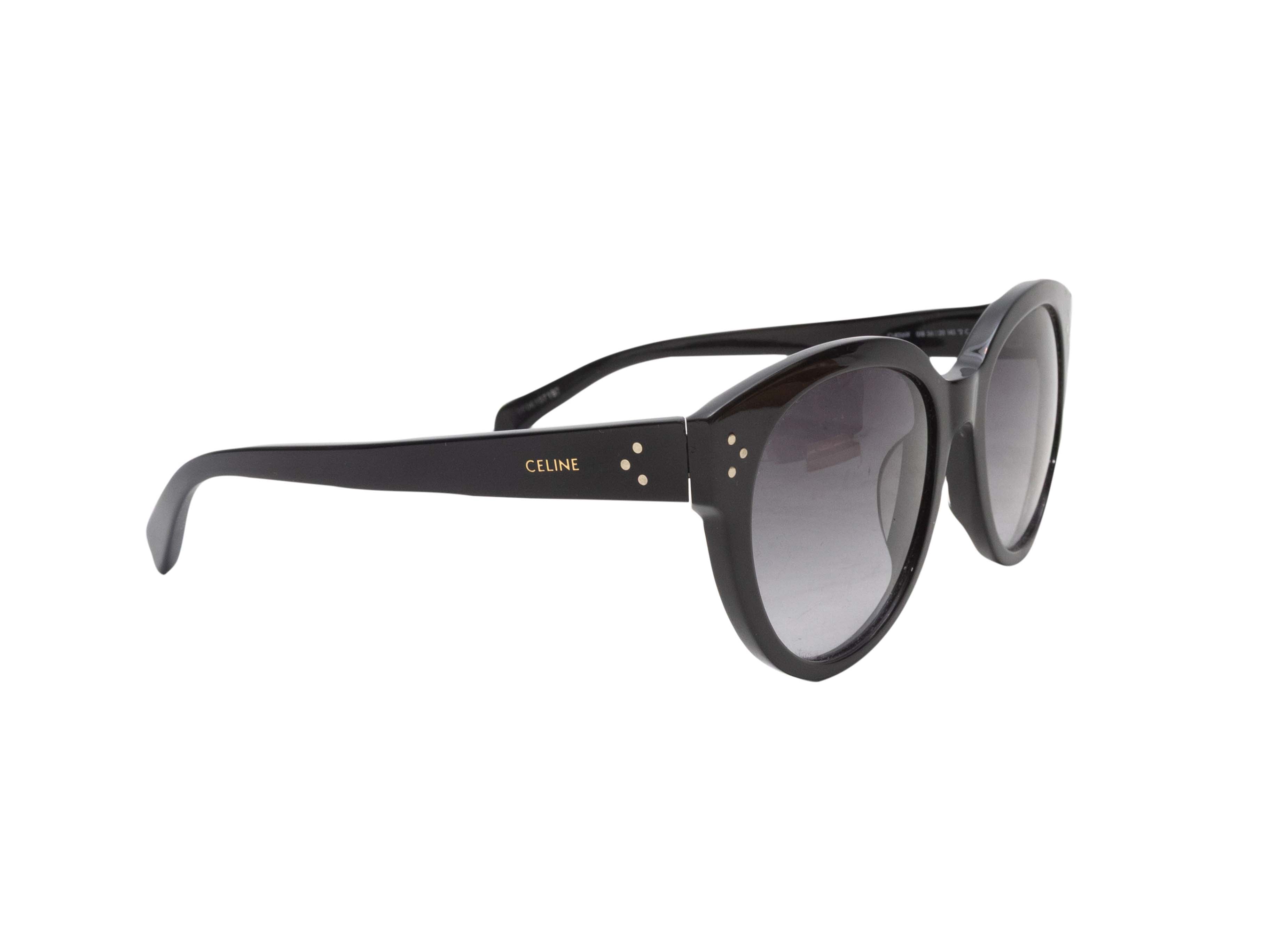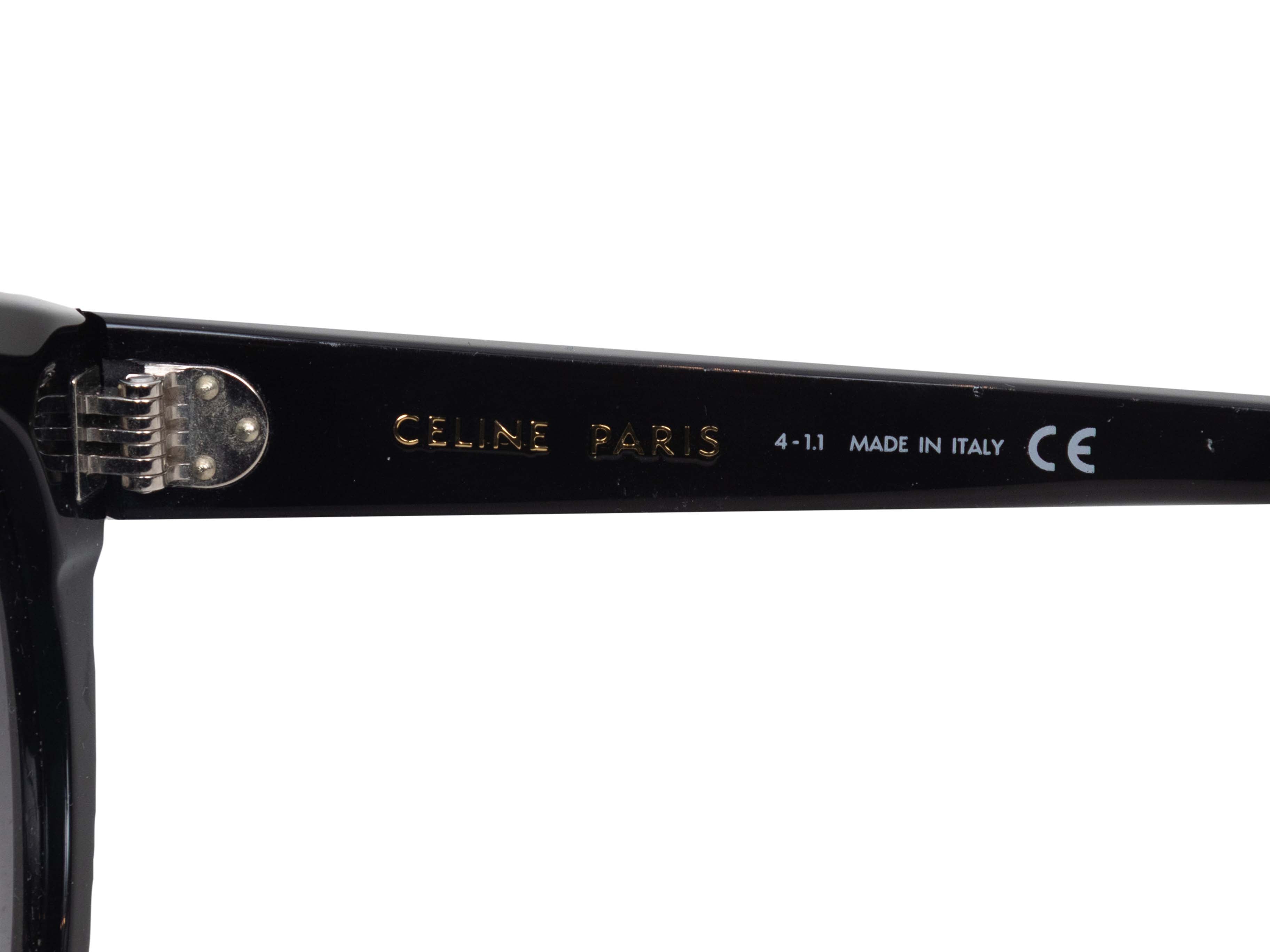 Product Details: Black acetate cat-eye sunglasses by Celine. Grey tinted lenses. 2.25" height, 6" width, 5.75" length.