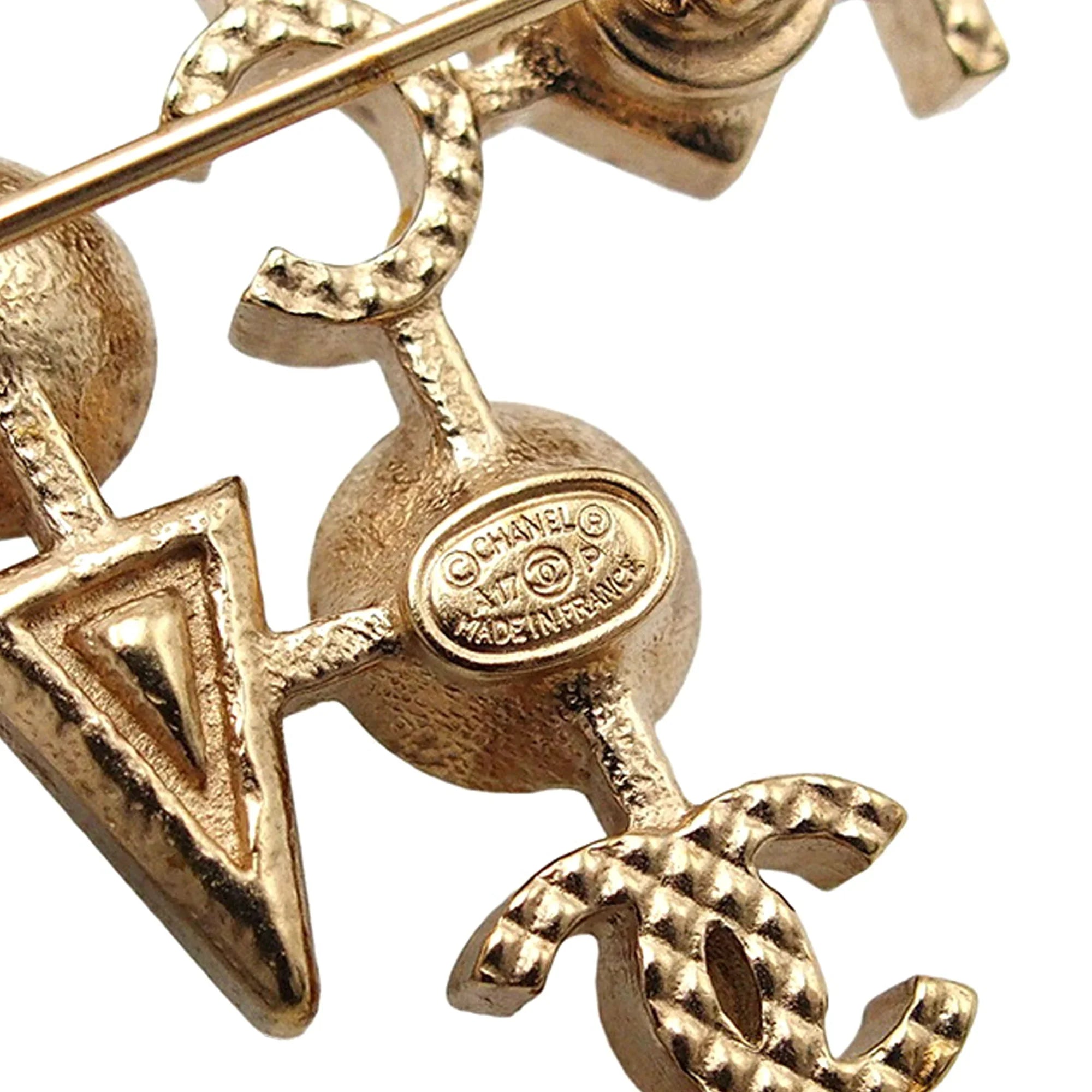 Product Details: Gold Chanel CC Gold Plated Faux Pearl I Heart Coco Brooch. This brooch features a gold-tone metal body, faux pearls embellishments, and a back pin closure. 1.7" L x 1.7" W x 0" D. Serial number A17P.