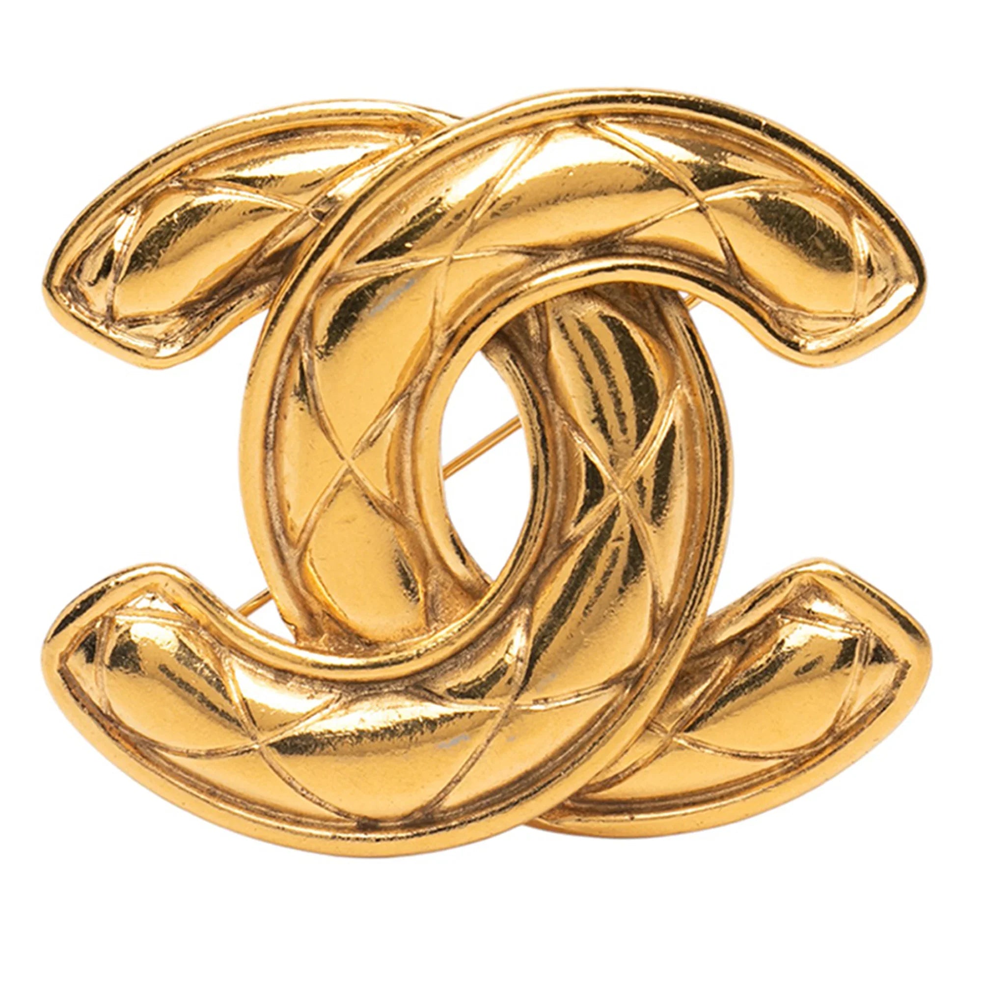 Product Details: Gold Chanel Gold Plated CC Quilted Brooch. This brooch features a gold-tone metal body and a back pin closure. 2" L x 2.2" W x 0" D.