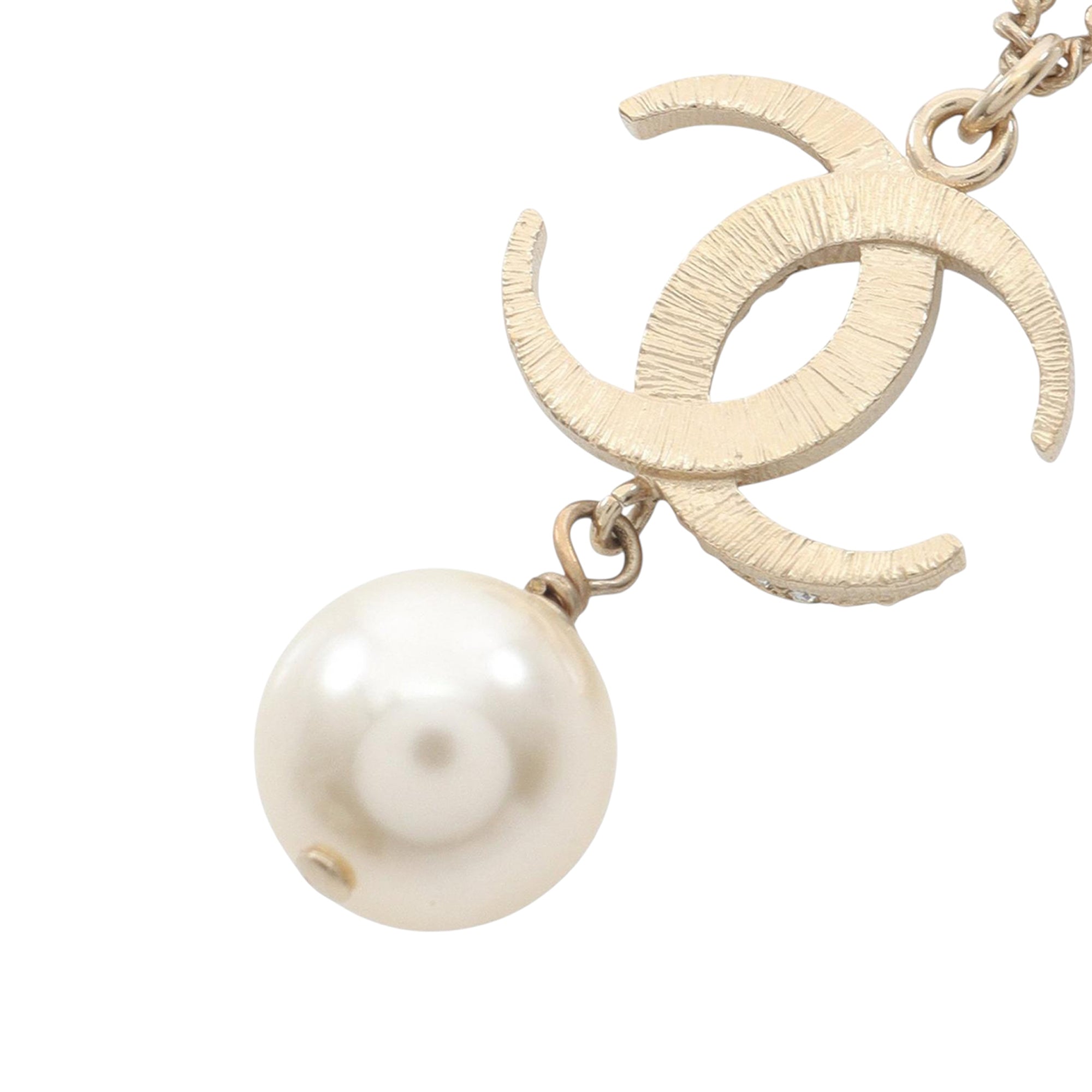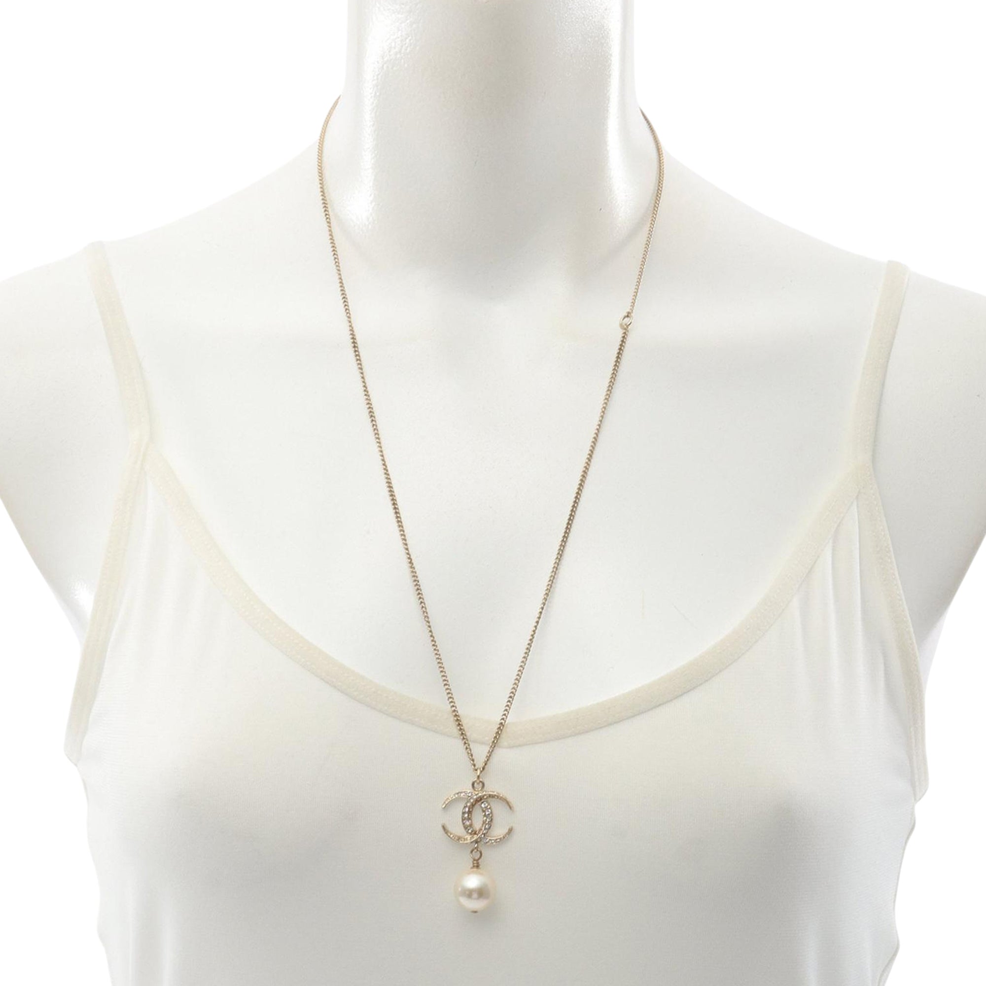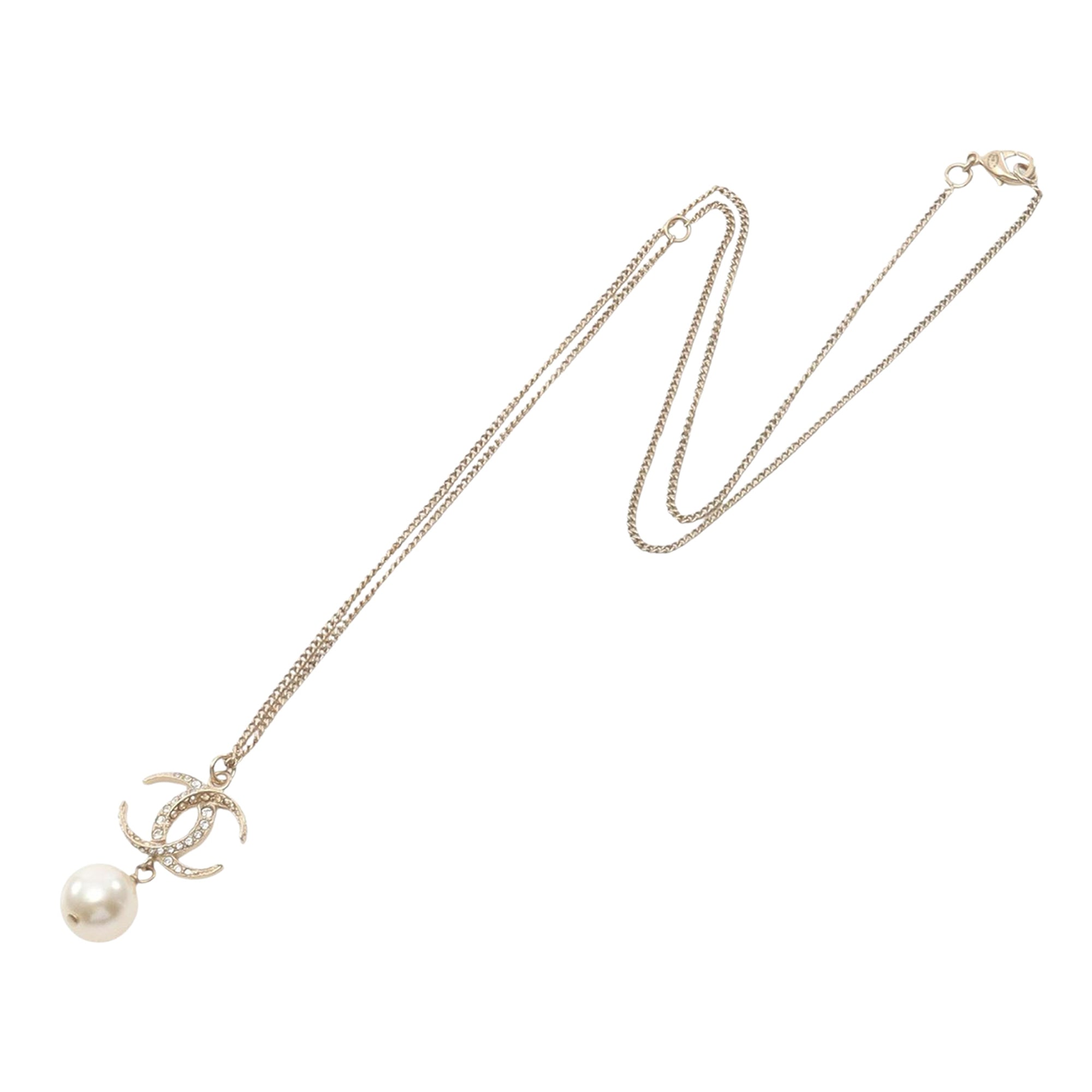 Product Details: Gold Chanel Gold Plated CC Rhinestone Faux Pearl Pendant Necklace. This necklace features a gold-tone chain with a pearl and rhinestone-embellished CC logo pendant, and a lobster clasp closure. 16.5" L x 0.8" W x 0" D. Serial number B15C.