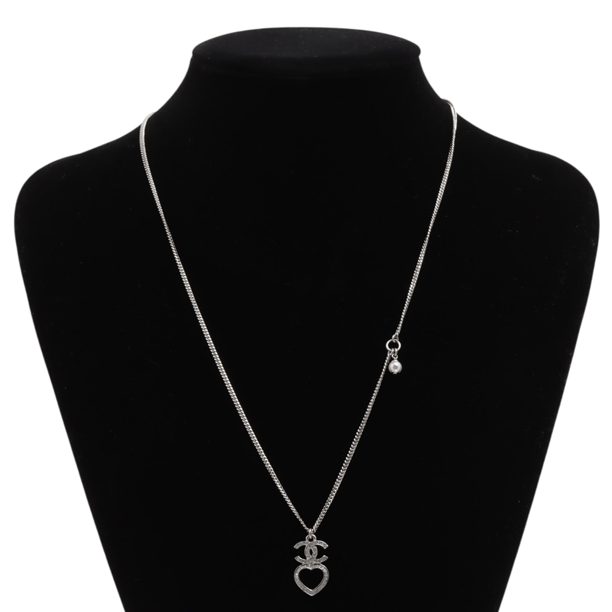 Silver Chanel CC Silver Plated Faux Pearl and Rhinestones Heart Pendant Necklace