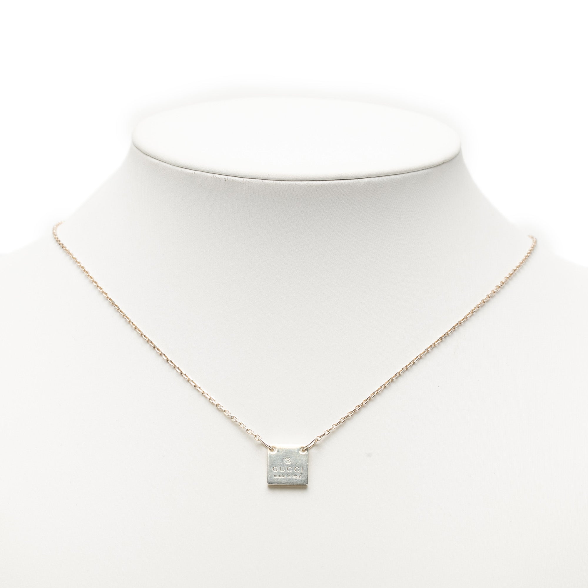 Product Details: Silver Gucci Sterling Silver Square Plate Logo Pendant Necklace. This necklace features a sterling silver body with square plate pendant, and a lobster clasp closure. 18.9" L x 0.4" W x 0" D.