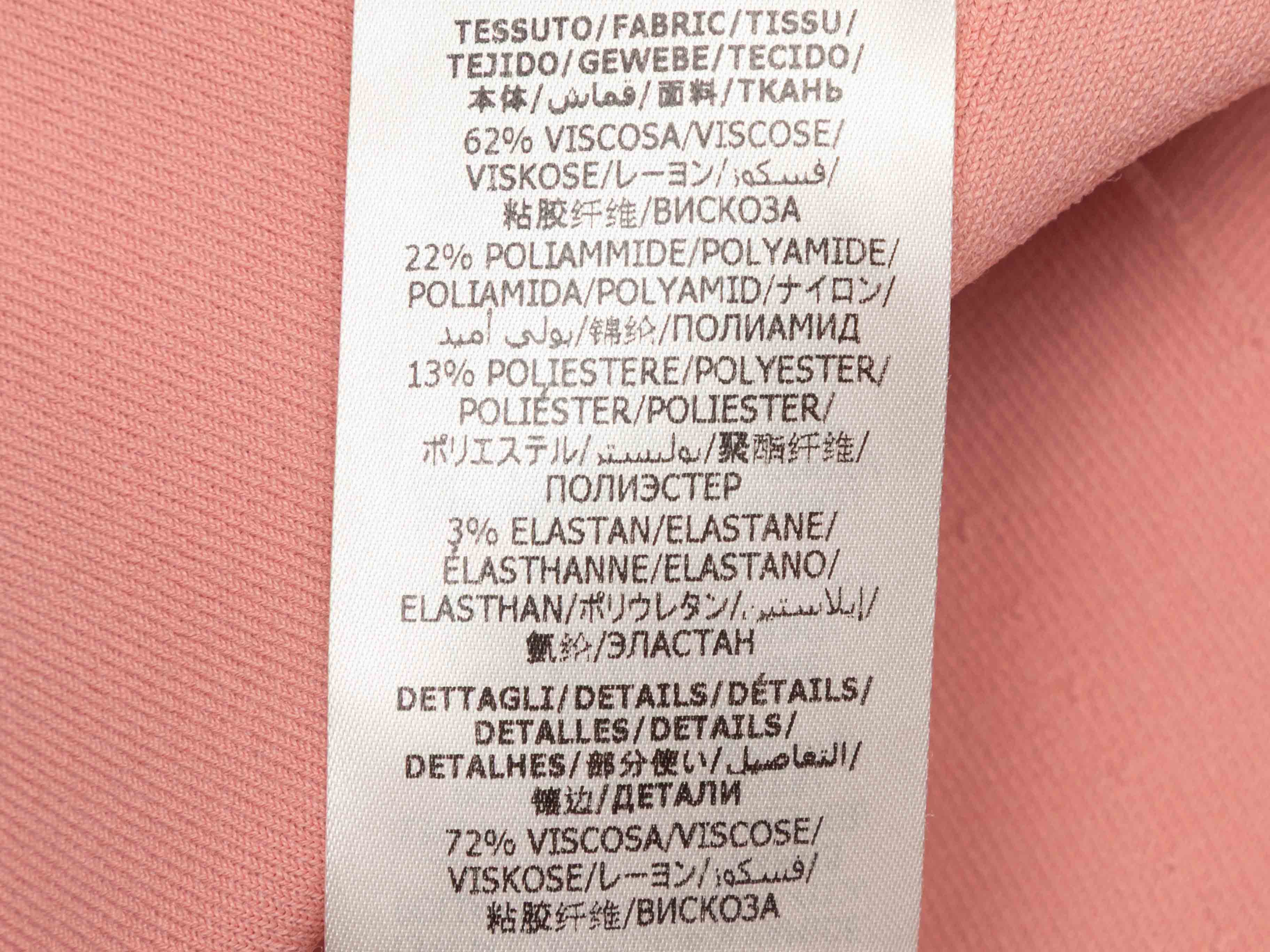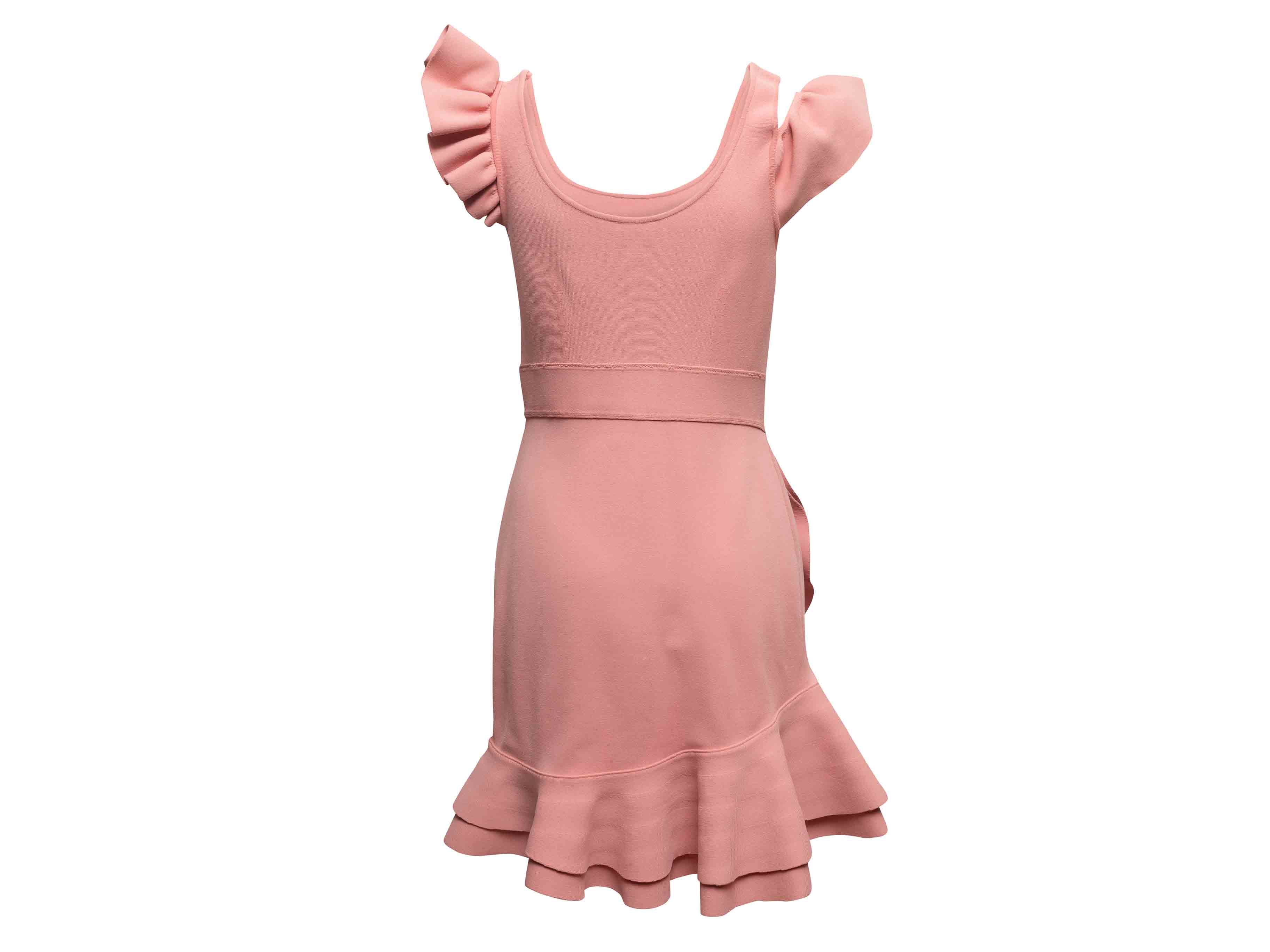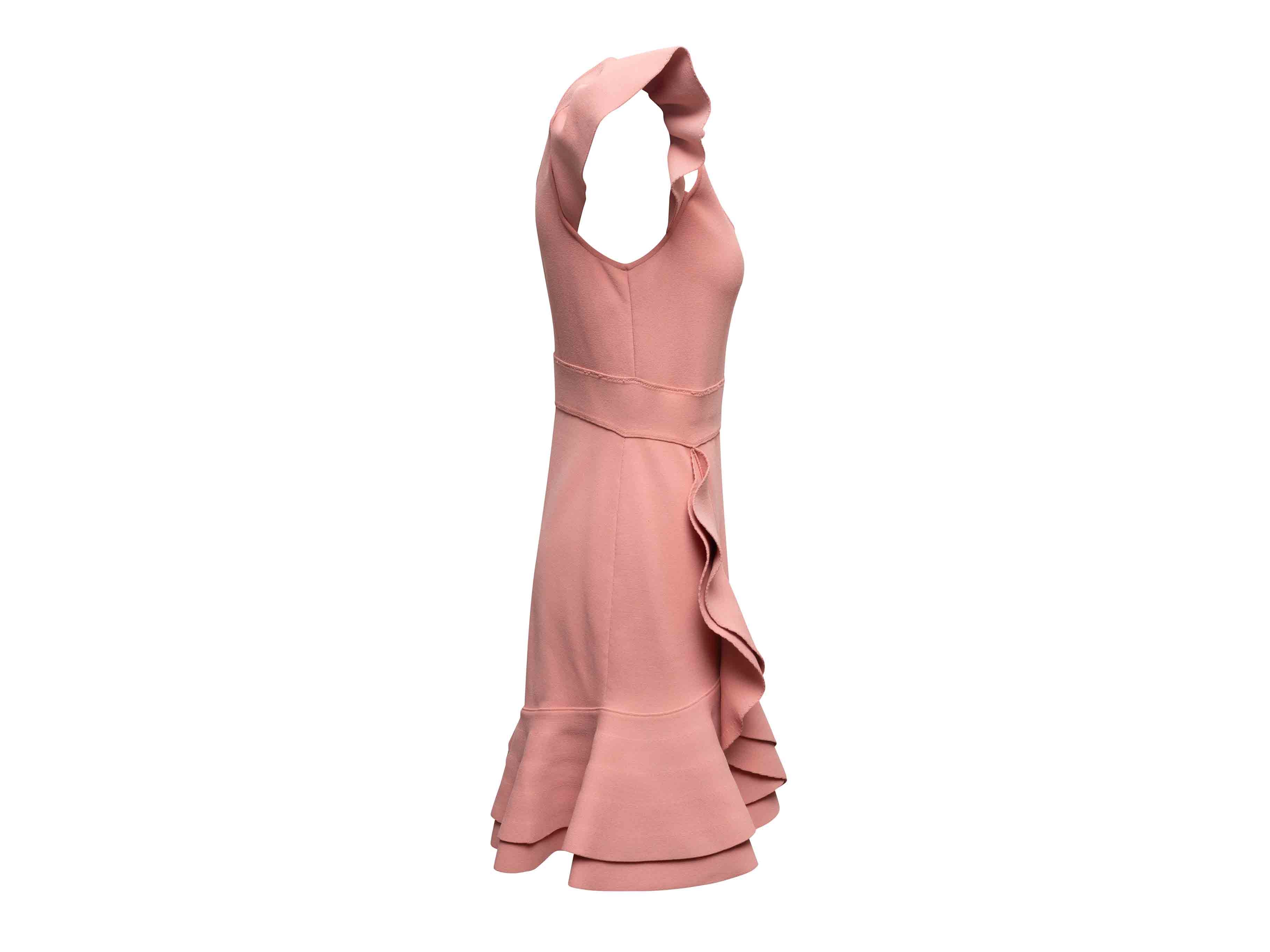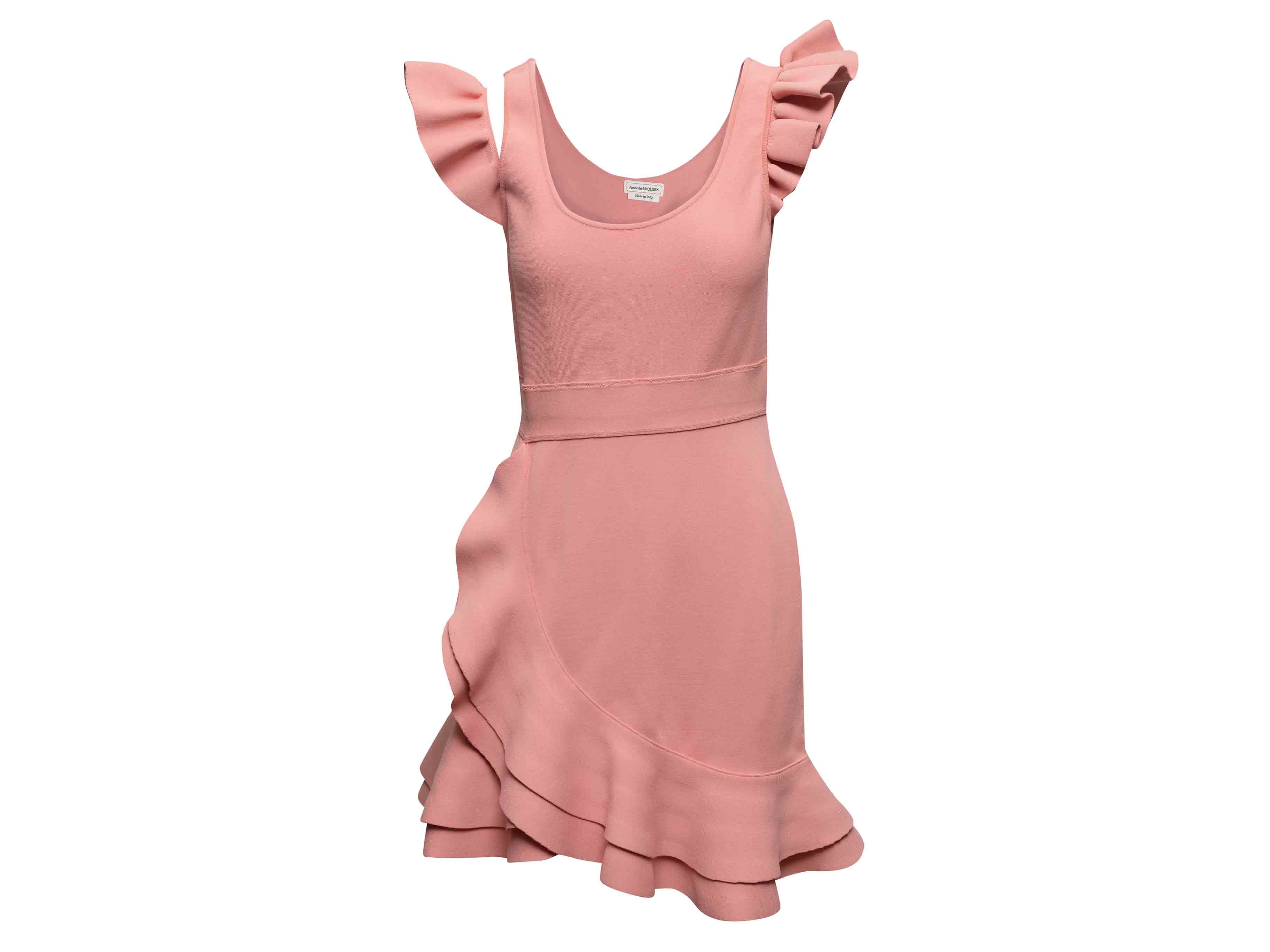 Product Details: Pink ruffle-trimmed mini dress by Alexander McQueen. Scoop neckline. 28" waist, 28" waist, 39" length, 10.5" shoulder width.