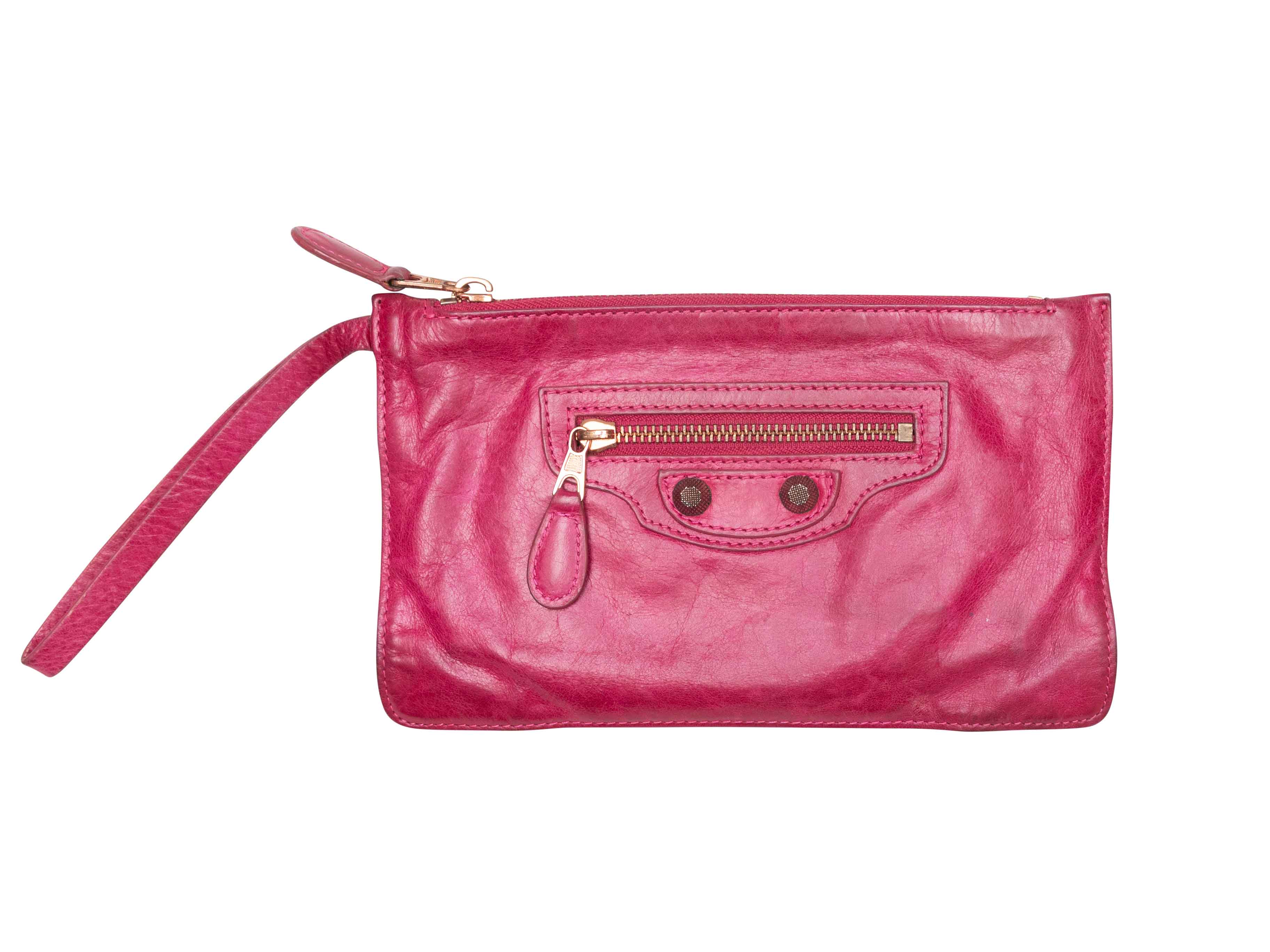 Product Details: Fuchsia Le City zip wallet by Balenciaga. Gold-tone hardware. Front zip pocket. Wristlet strap. Top zip closure. 5.5" height, 9.25" length.