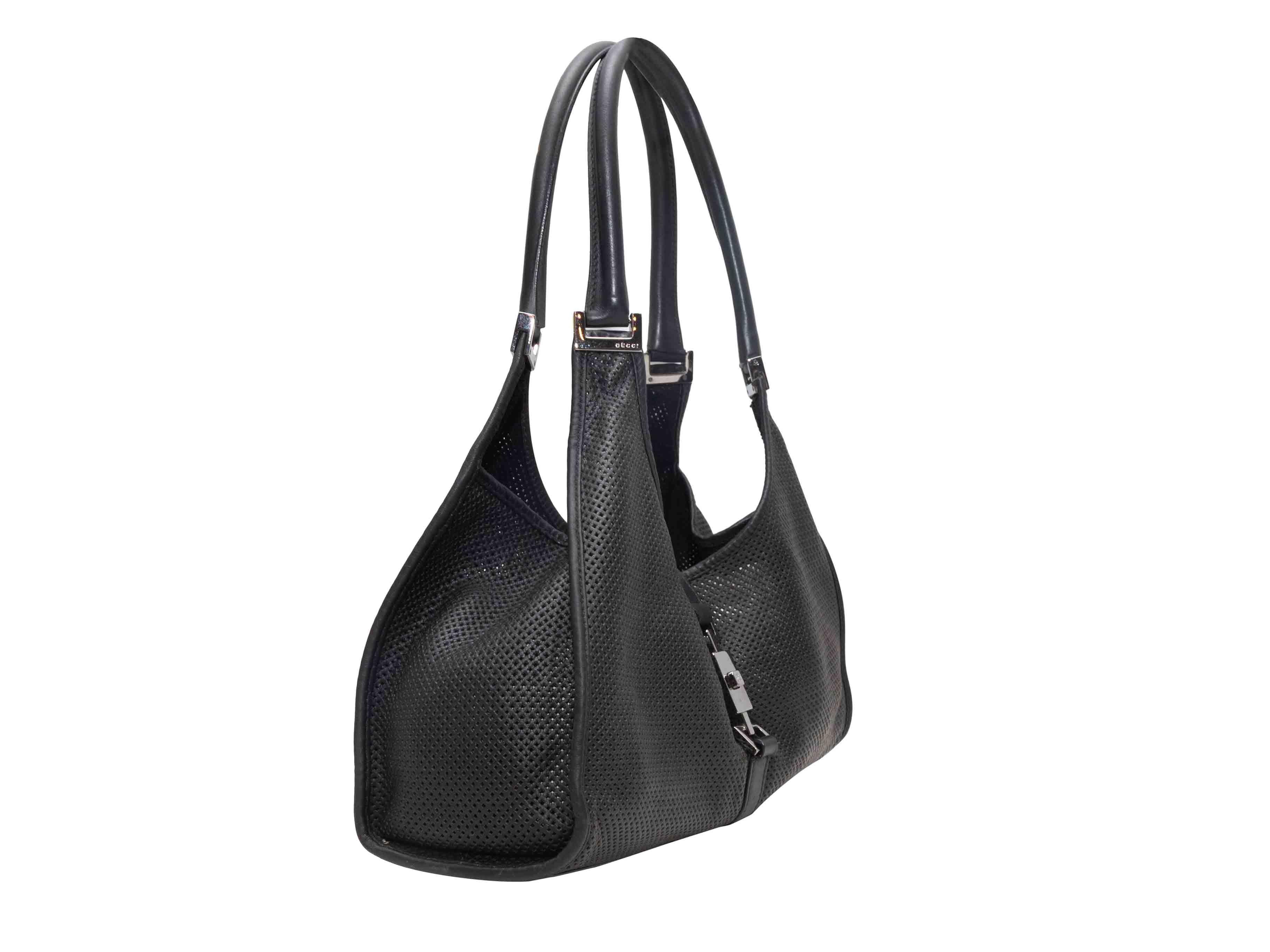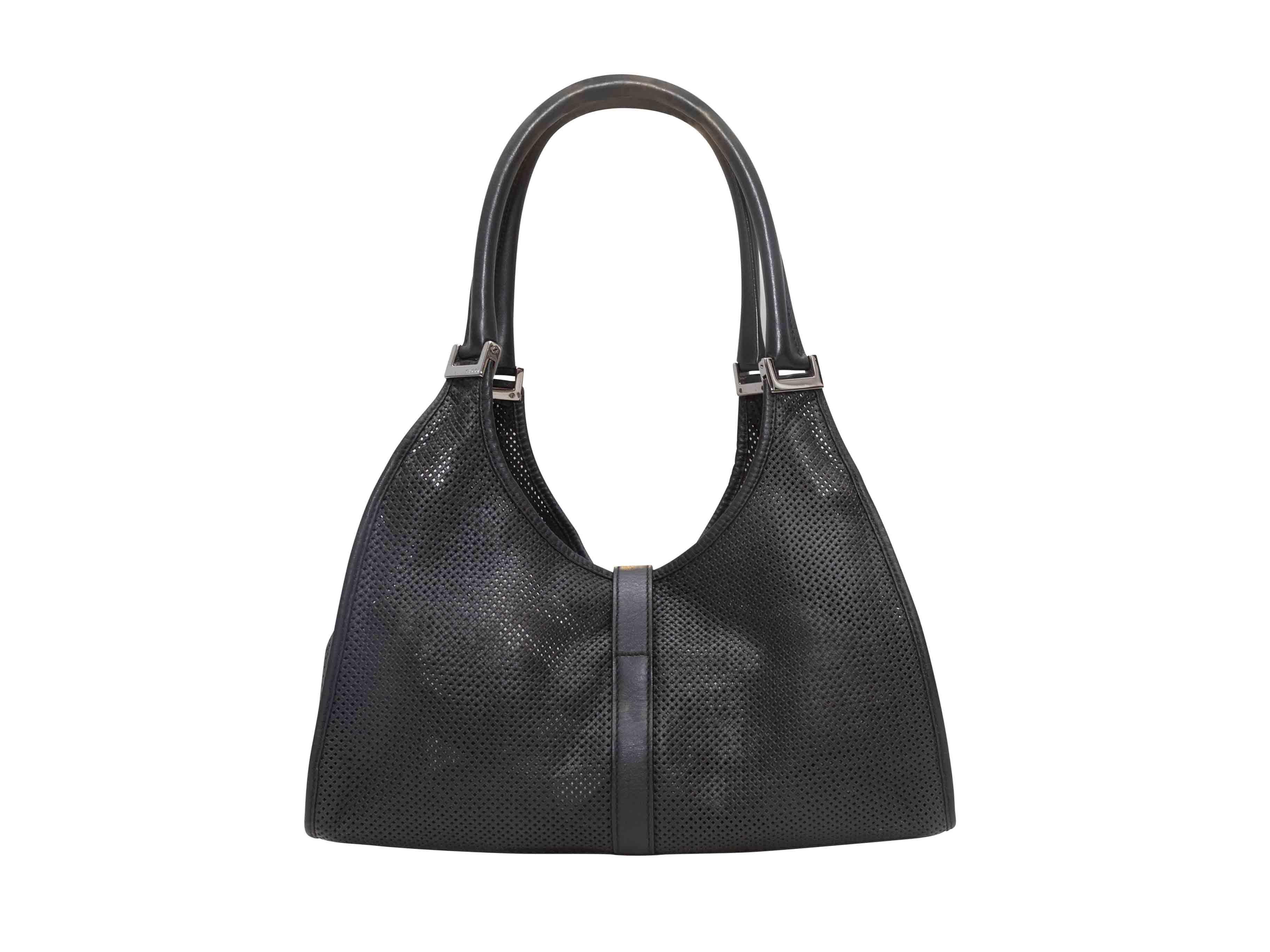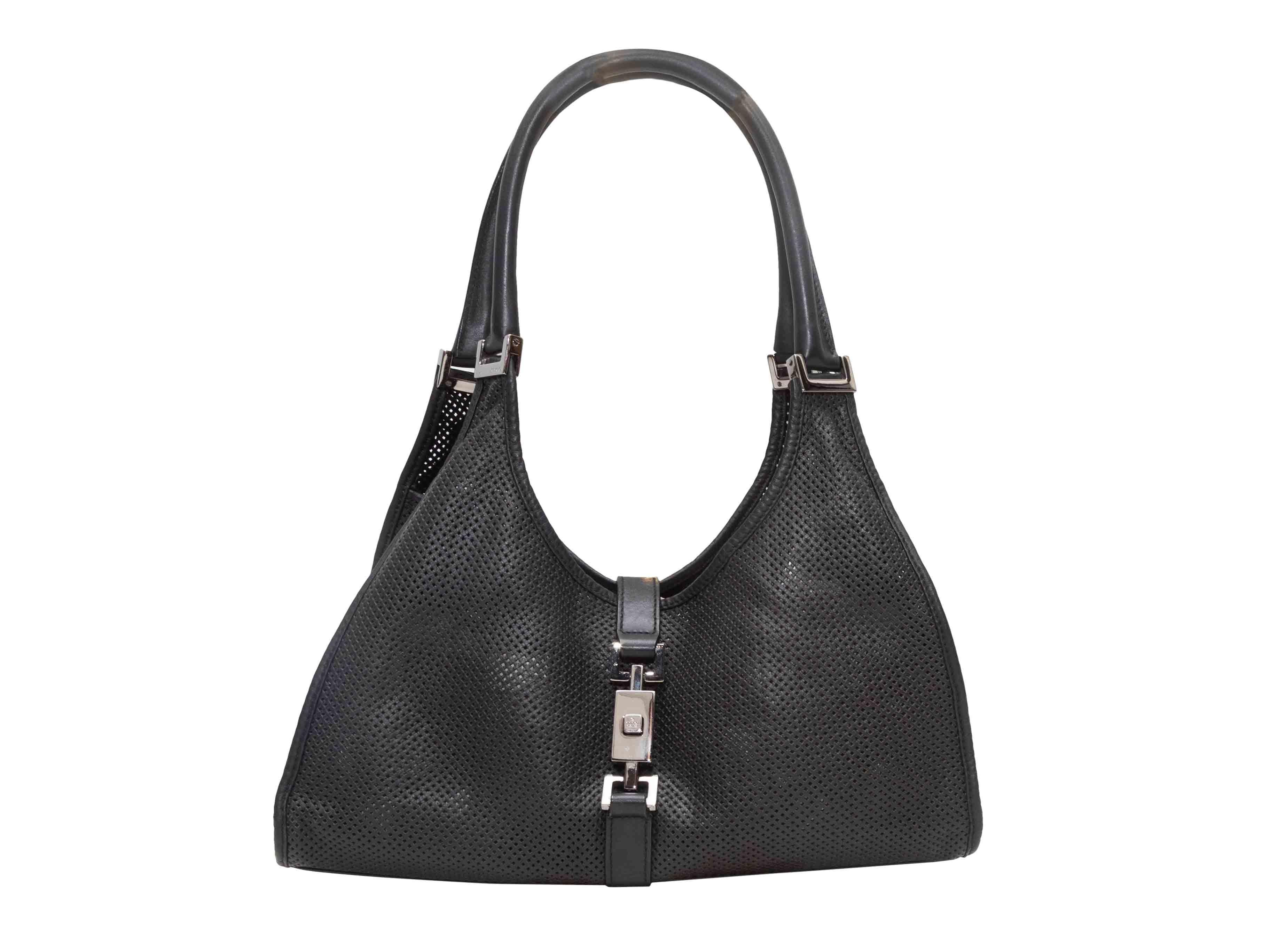 Product Details: Black Gucci Perforated Leather Jackie Bag. The Jackie Bag features a perforated leather body, silver-tone hardware, dual rolled shoulder straps, and a top buckle strap closure. 12" L x 8" H x 5.5" D, 10" shoulder strap drop.