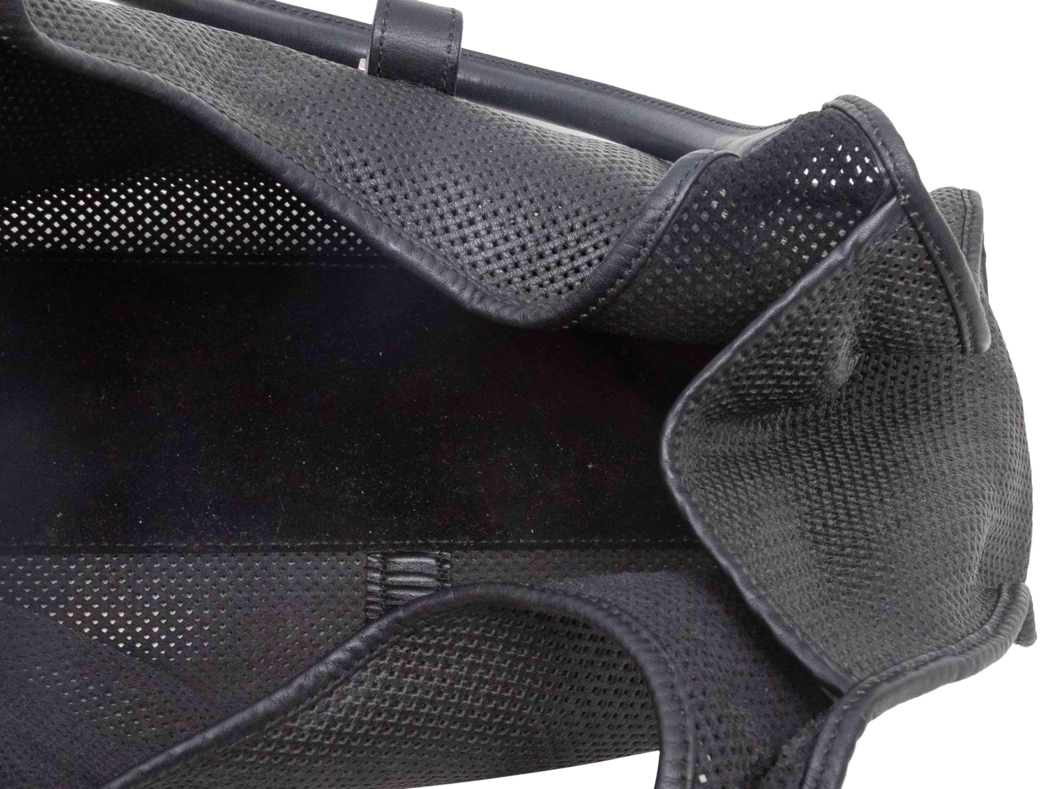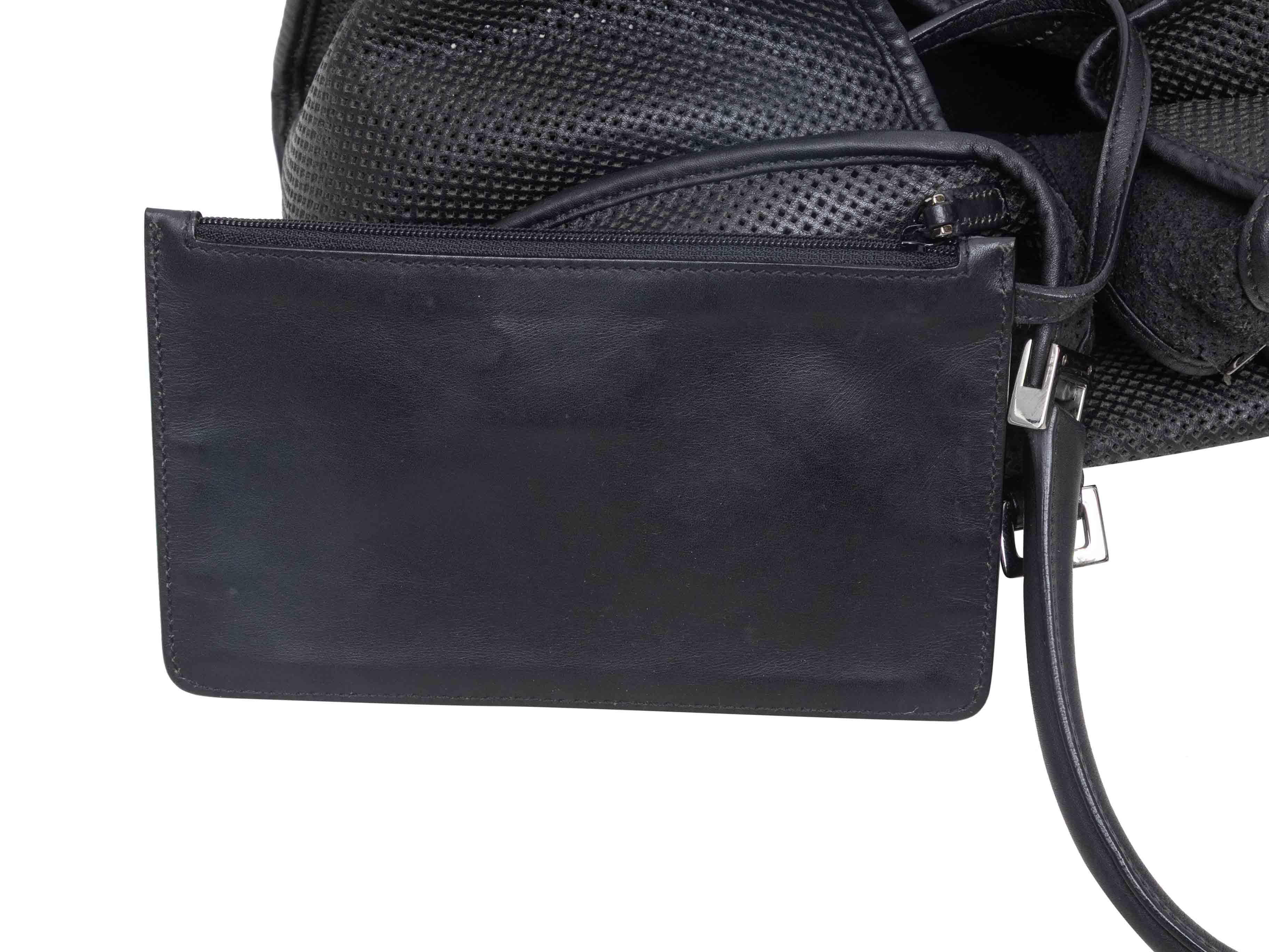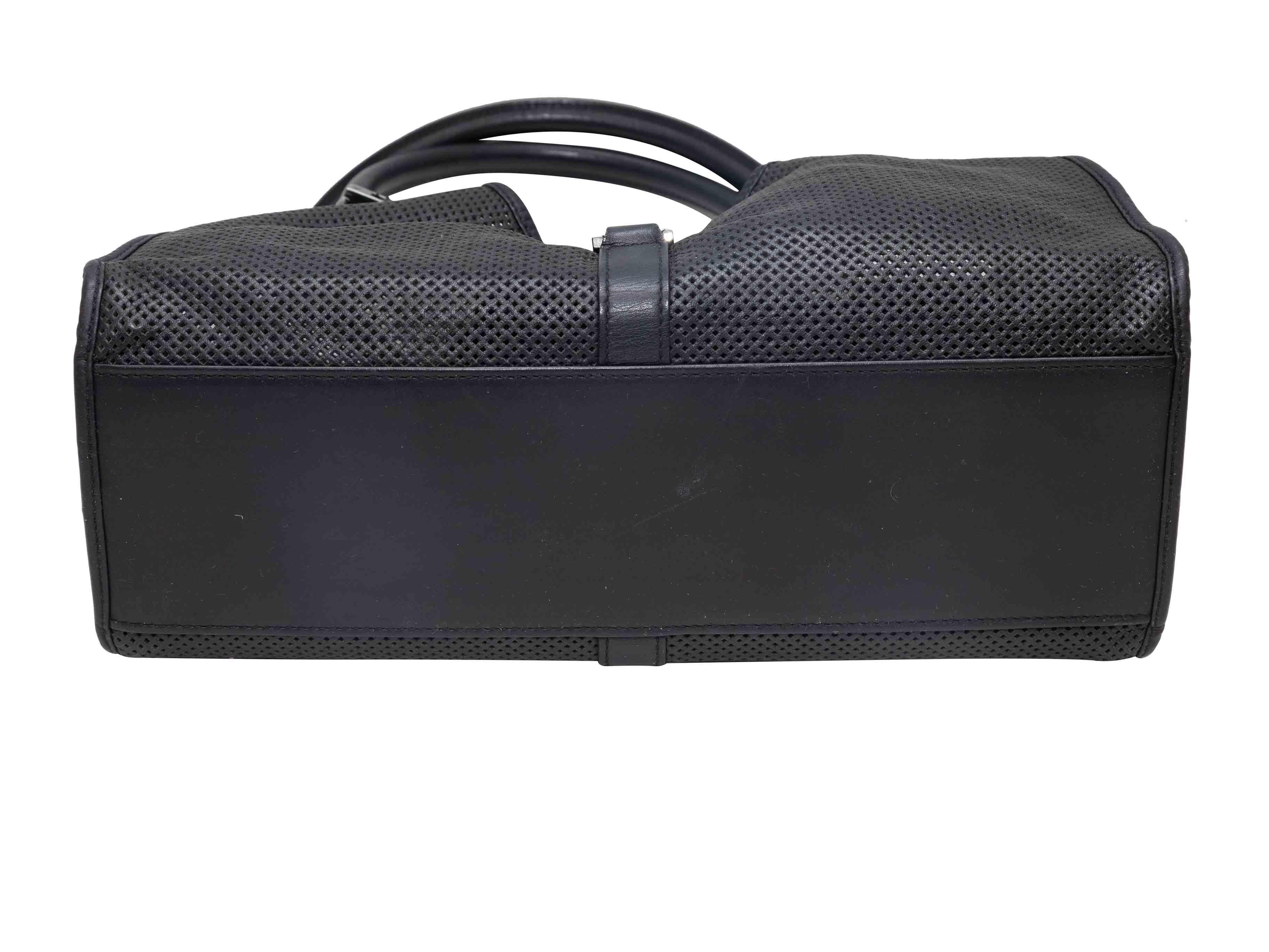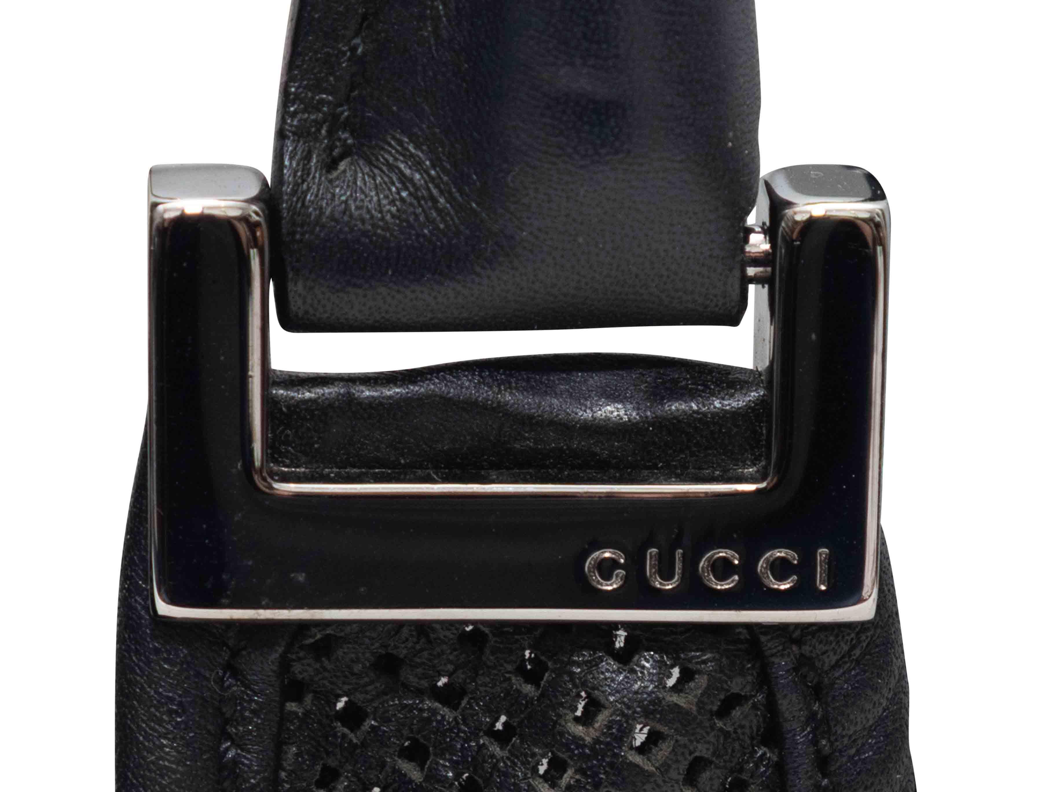 Product Details: Black Gucci Perforated Leather Jackie Bag. The Jackie Bag features a perforated leather body, silver-tone hardware, dual rolled shoulder straps, and a top buckle strap closure. 12" L x 8" H x 5.5" D, 10" shoulder strap drop.