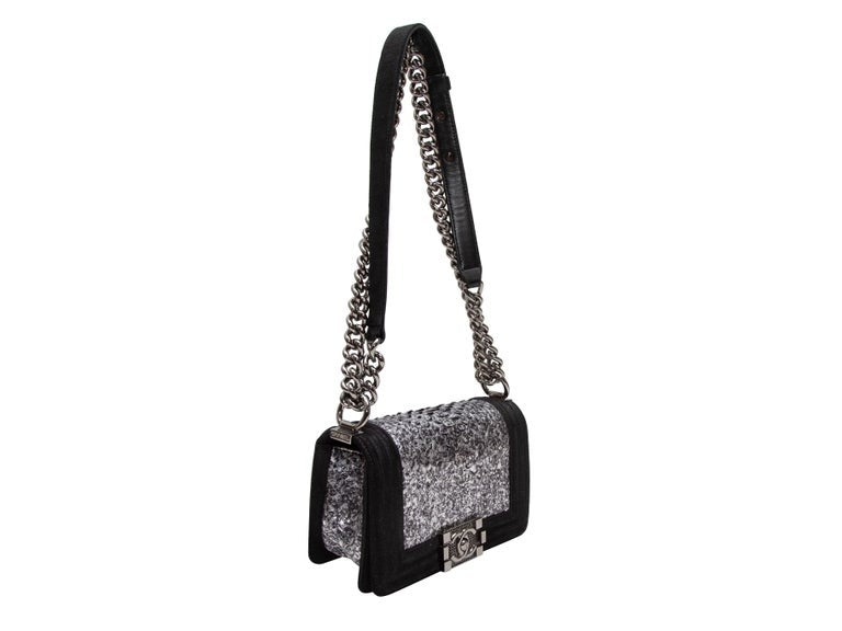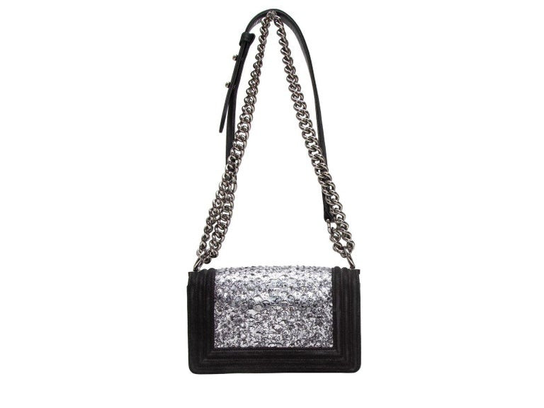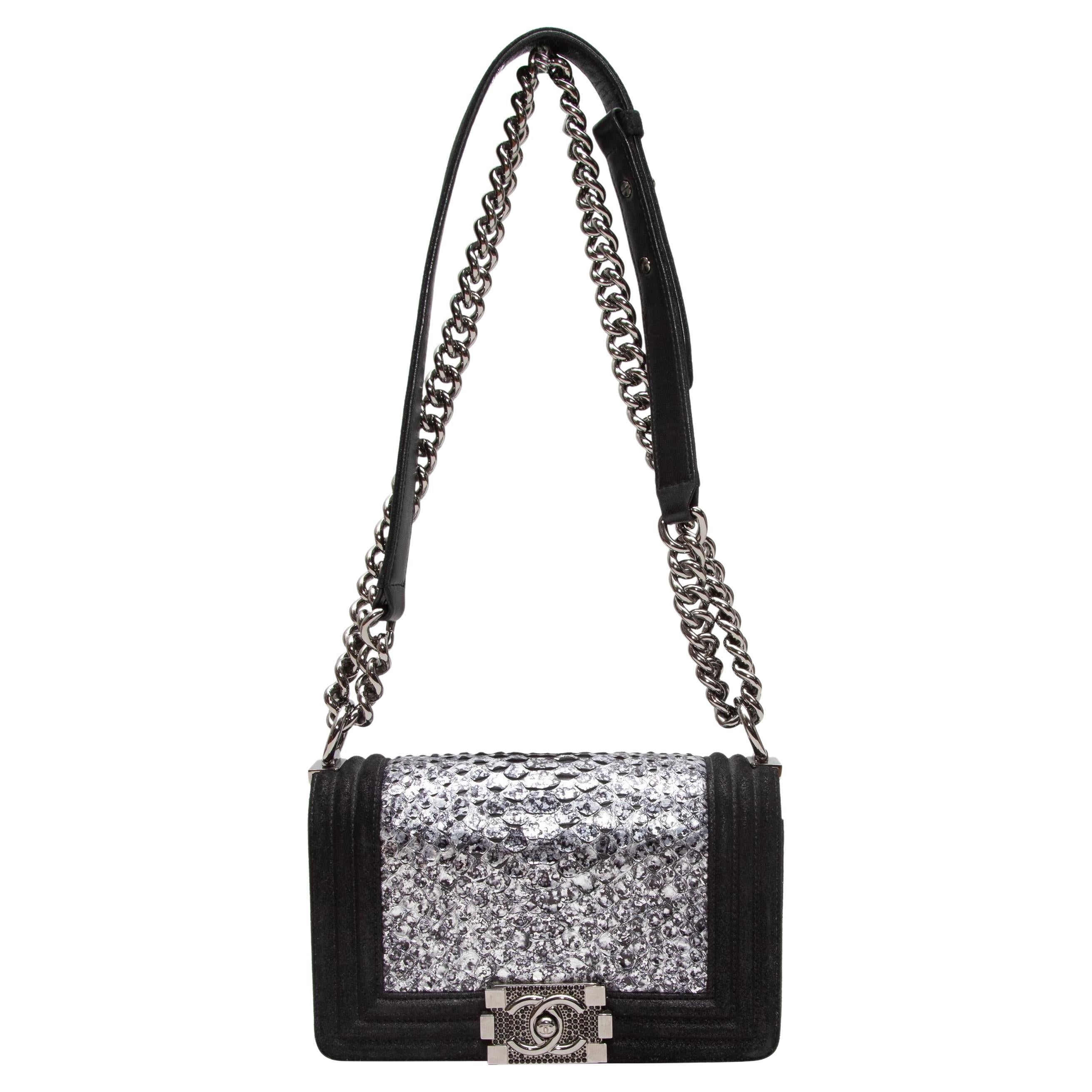 Product Details: Black & Silver Chanel Snakeskin & Leather Small Boy Bag. The Boy Bag features a snakeskin and leather body, silver-tone hardware, dual chain-link and leather shoulder straps, and a front flap push-lock CC closure. 8" L x 5.5" H x 2.5" D, 12" handle drop.