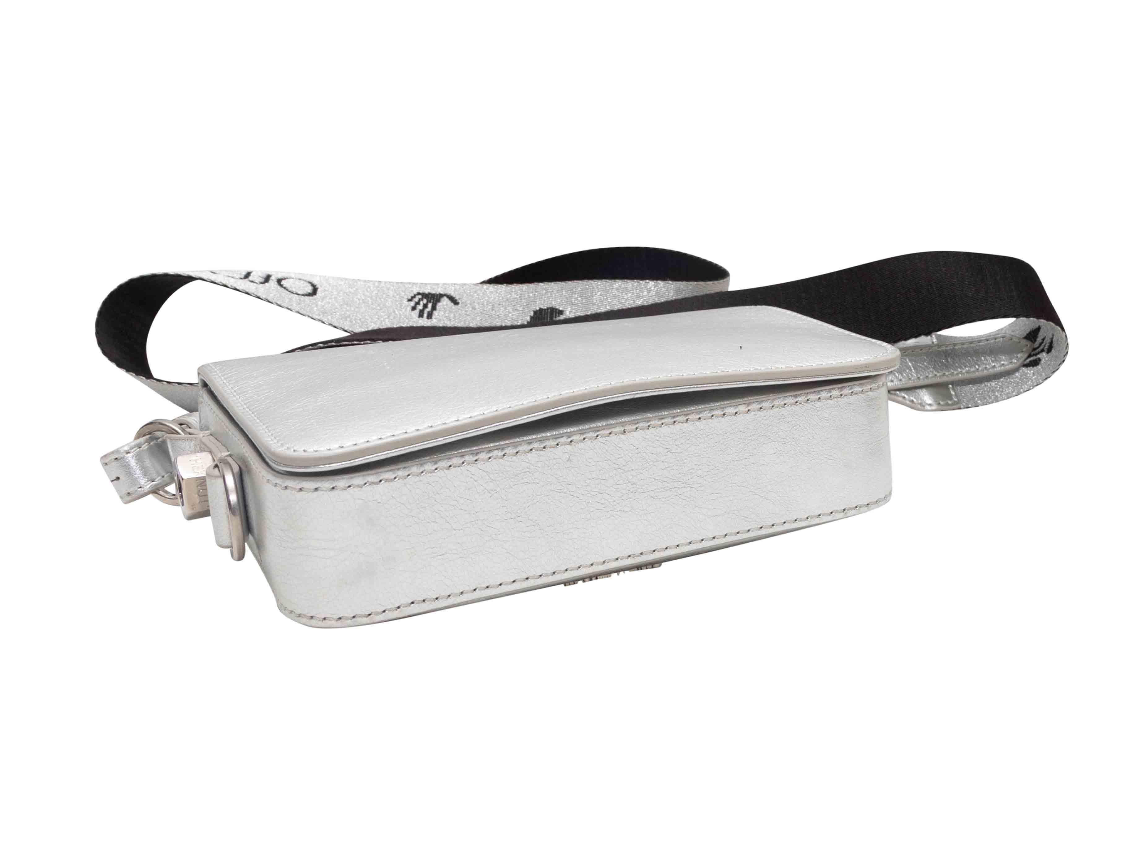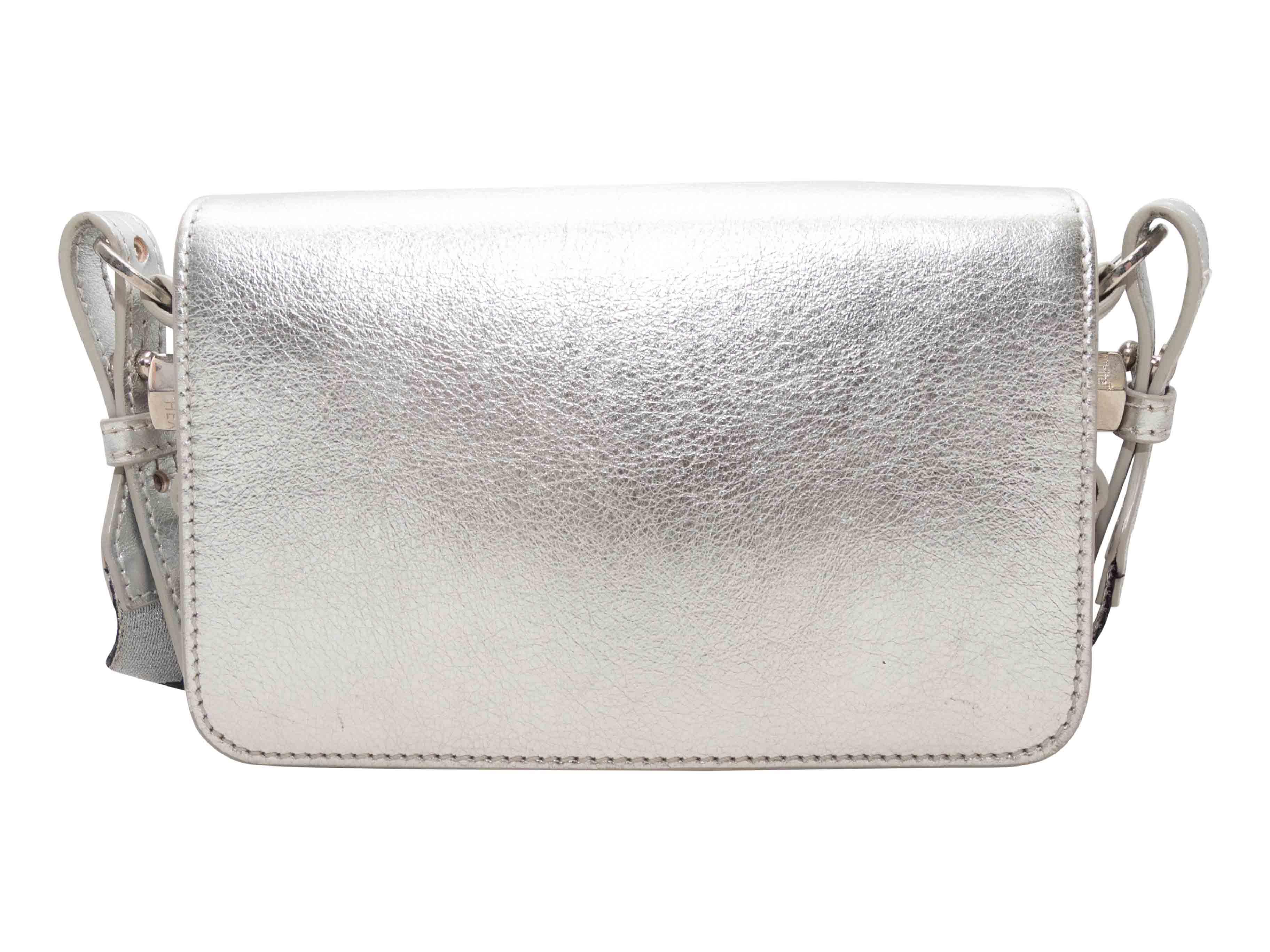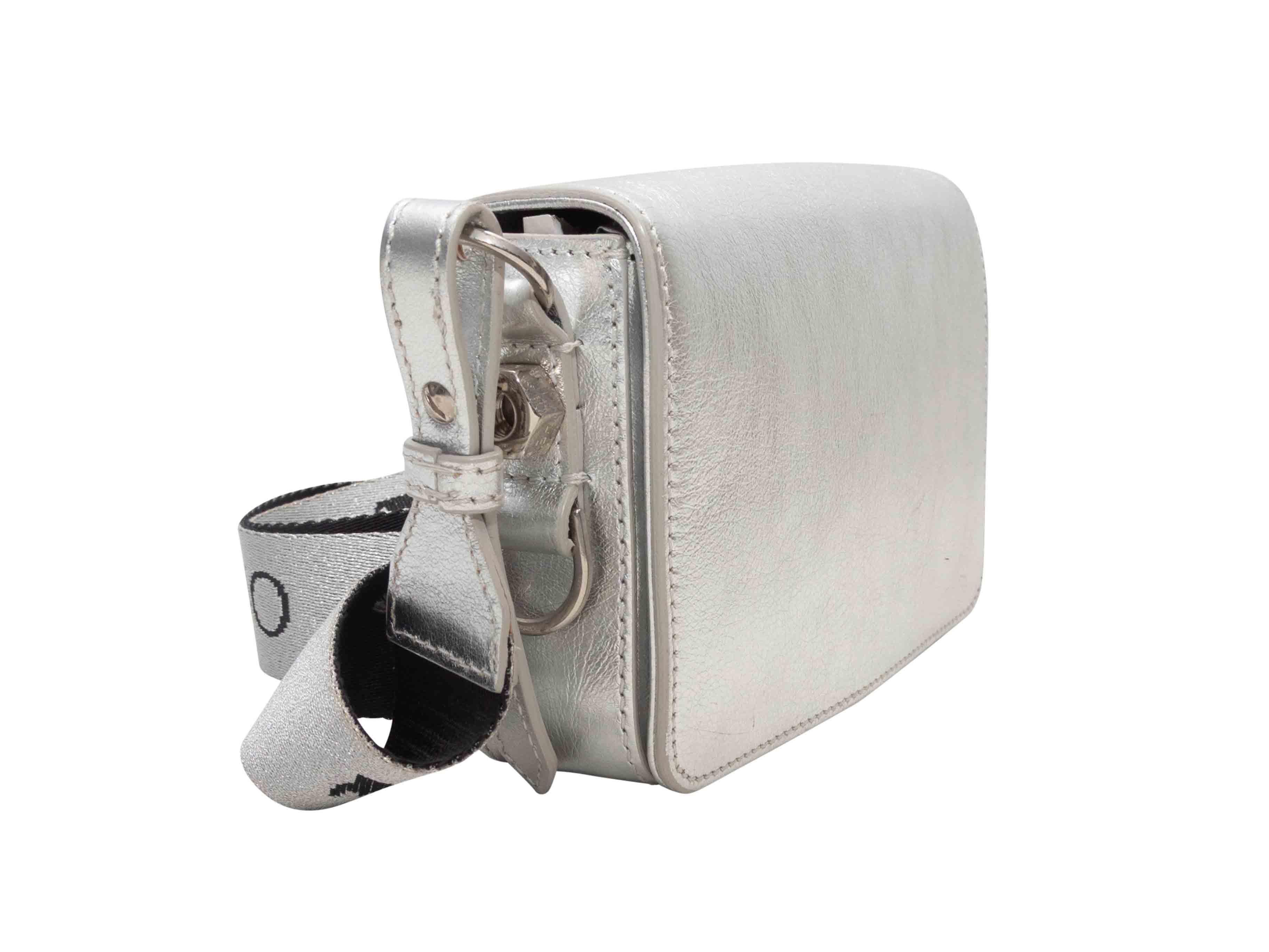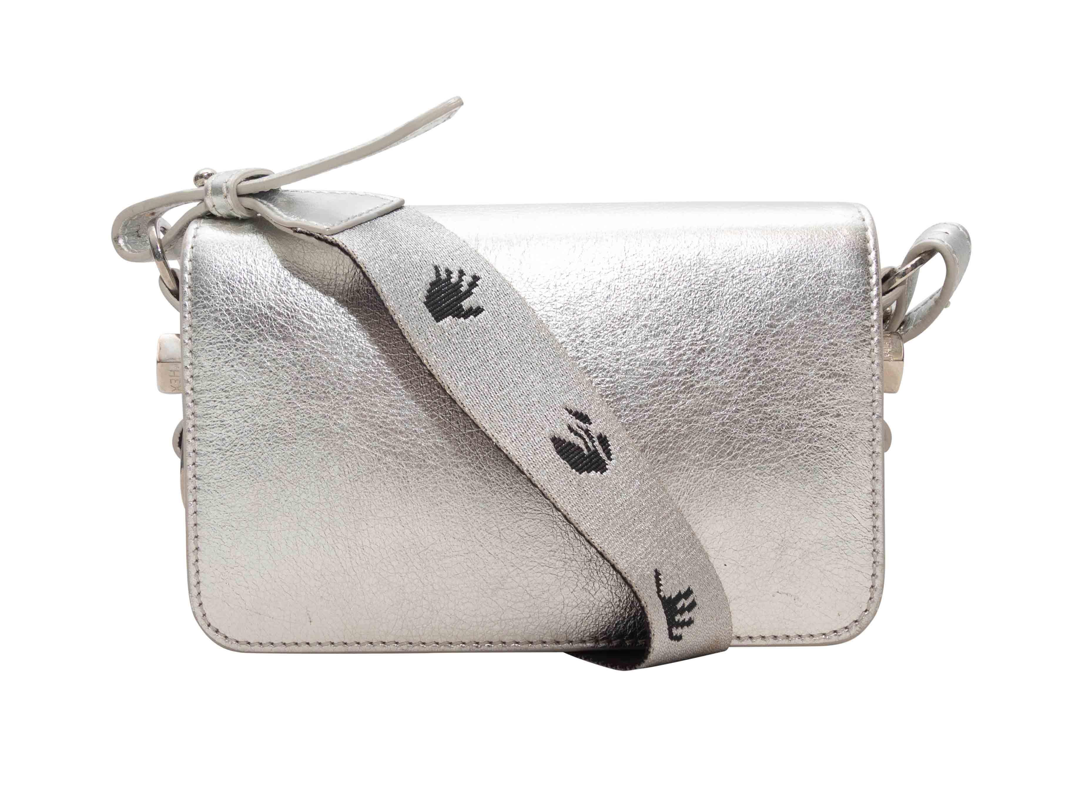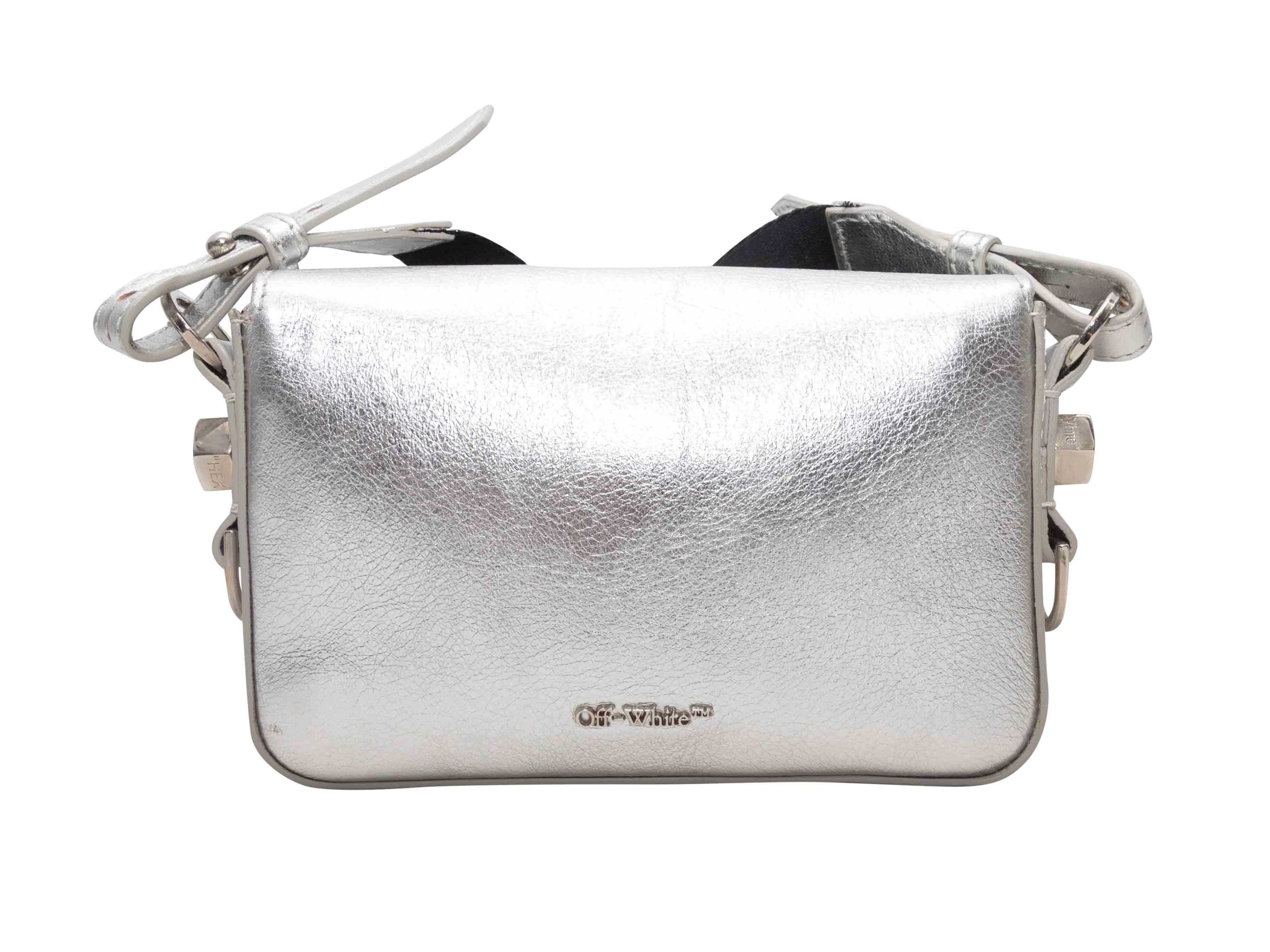 Product Details: Silver Off-White Leather Crossbody Bag. This crossbody bag features a metallic leather body, silver-tone hardware, a single flat crossbody strap, and a front flap closure. 7" L x 5" H x 1.75" D, 19.25" shoulder strap drop.