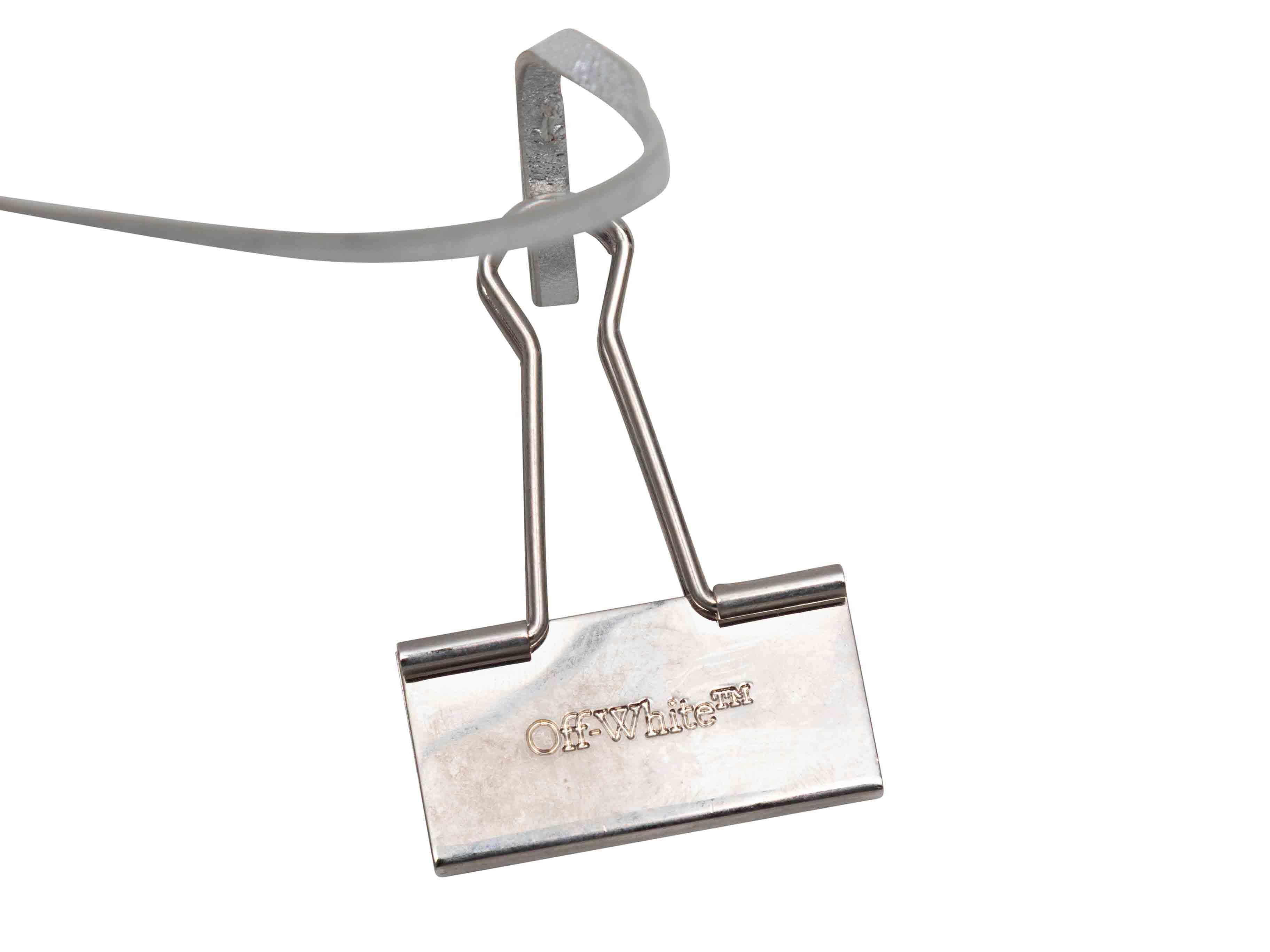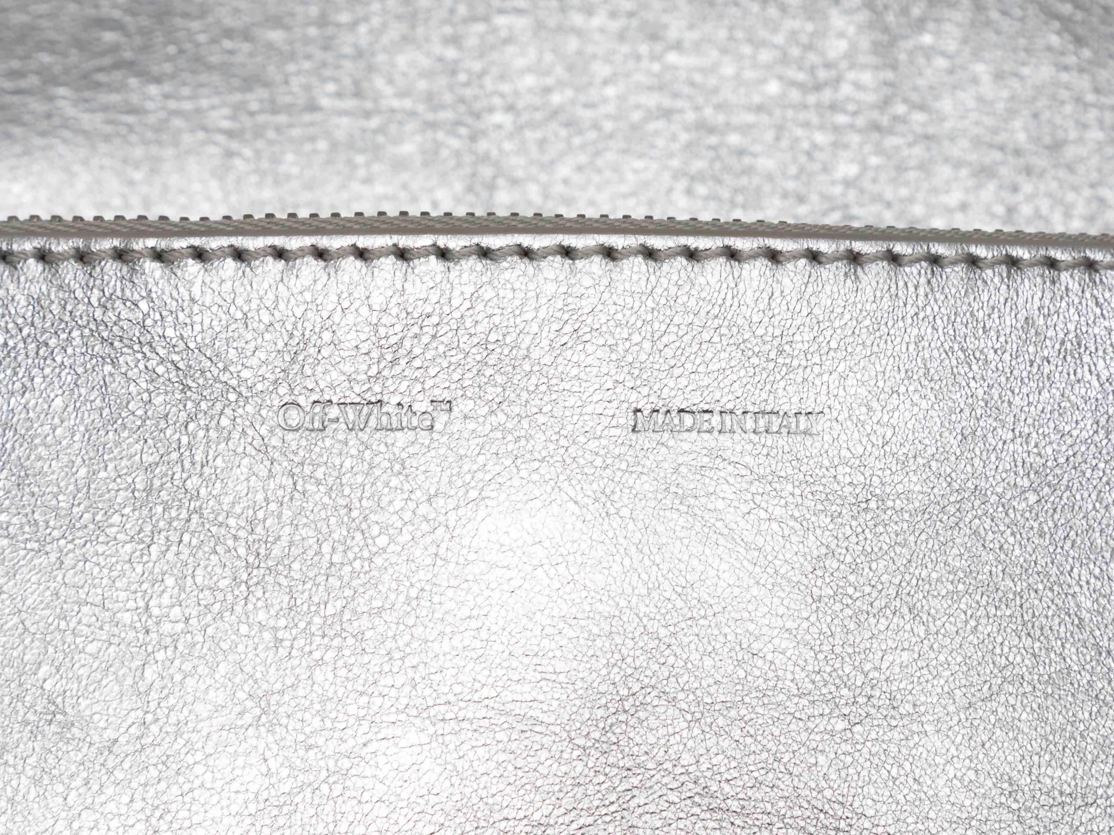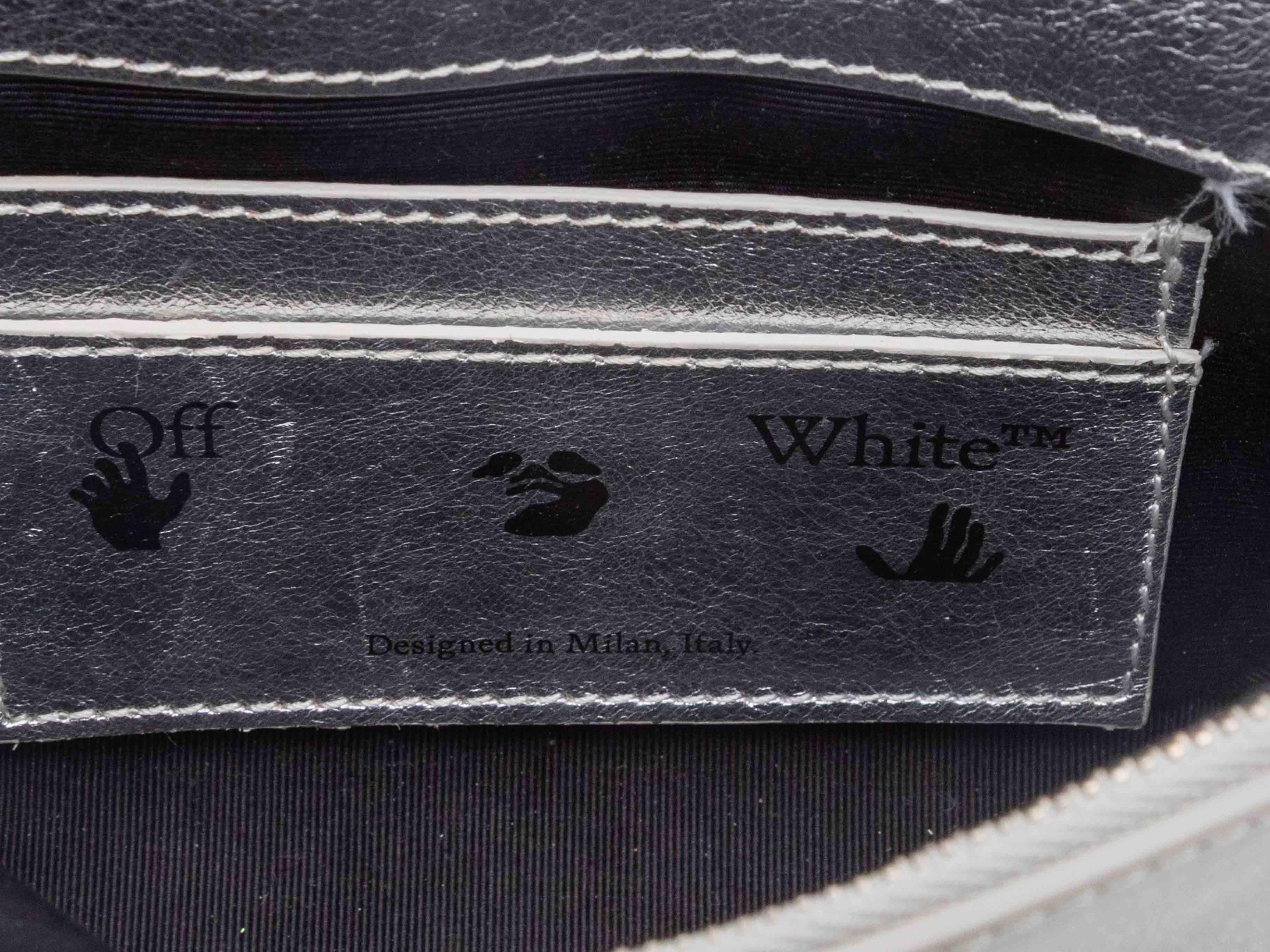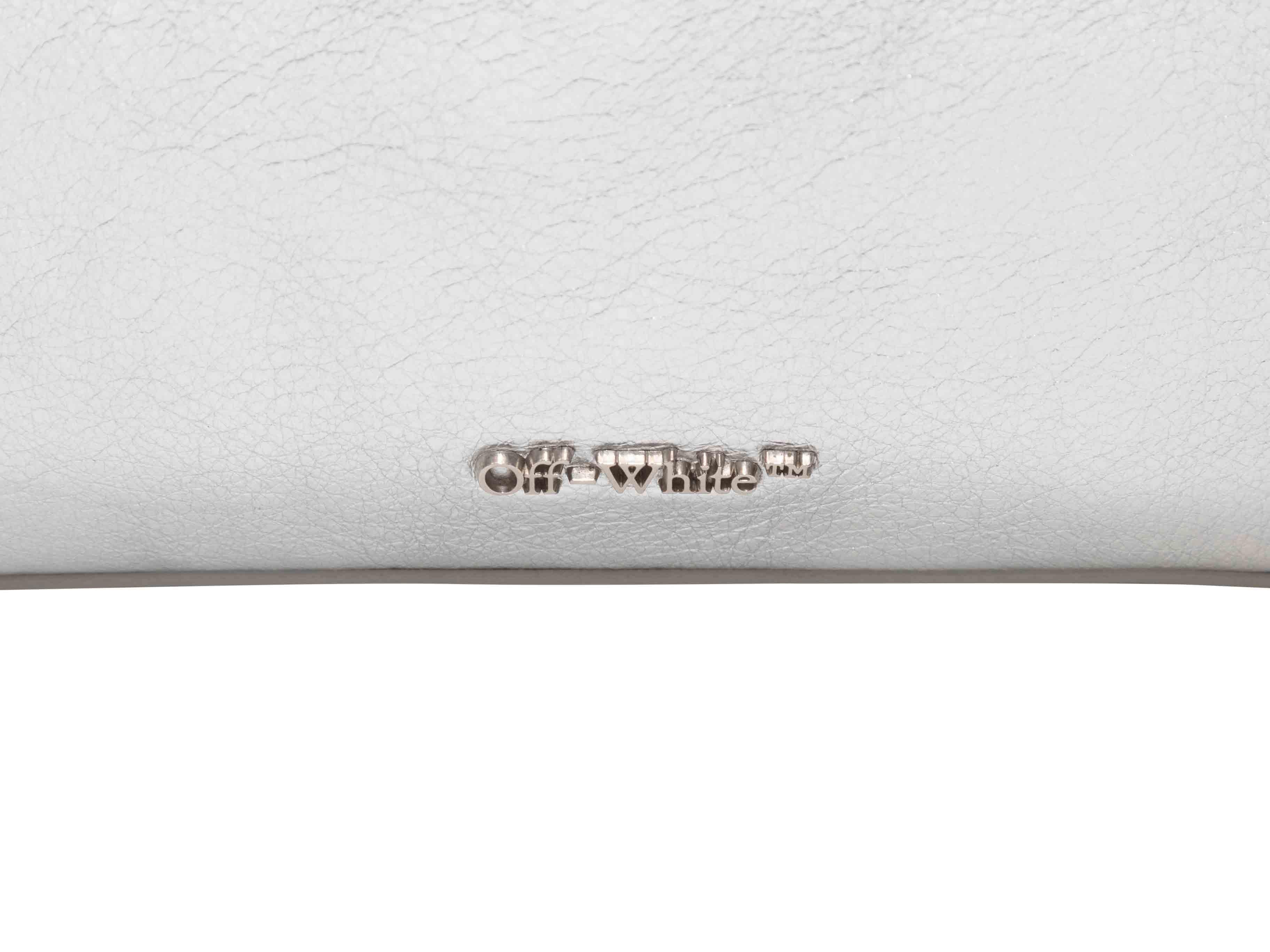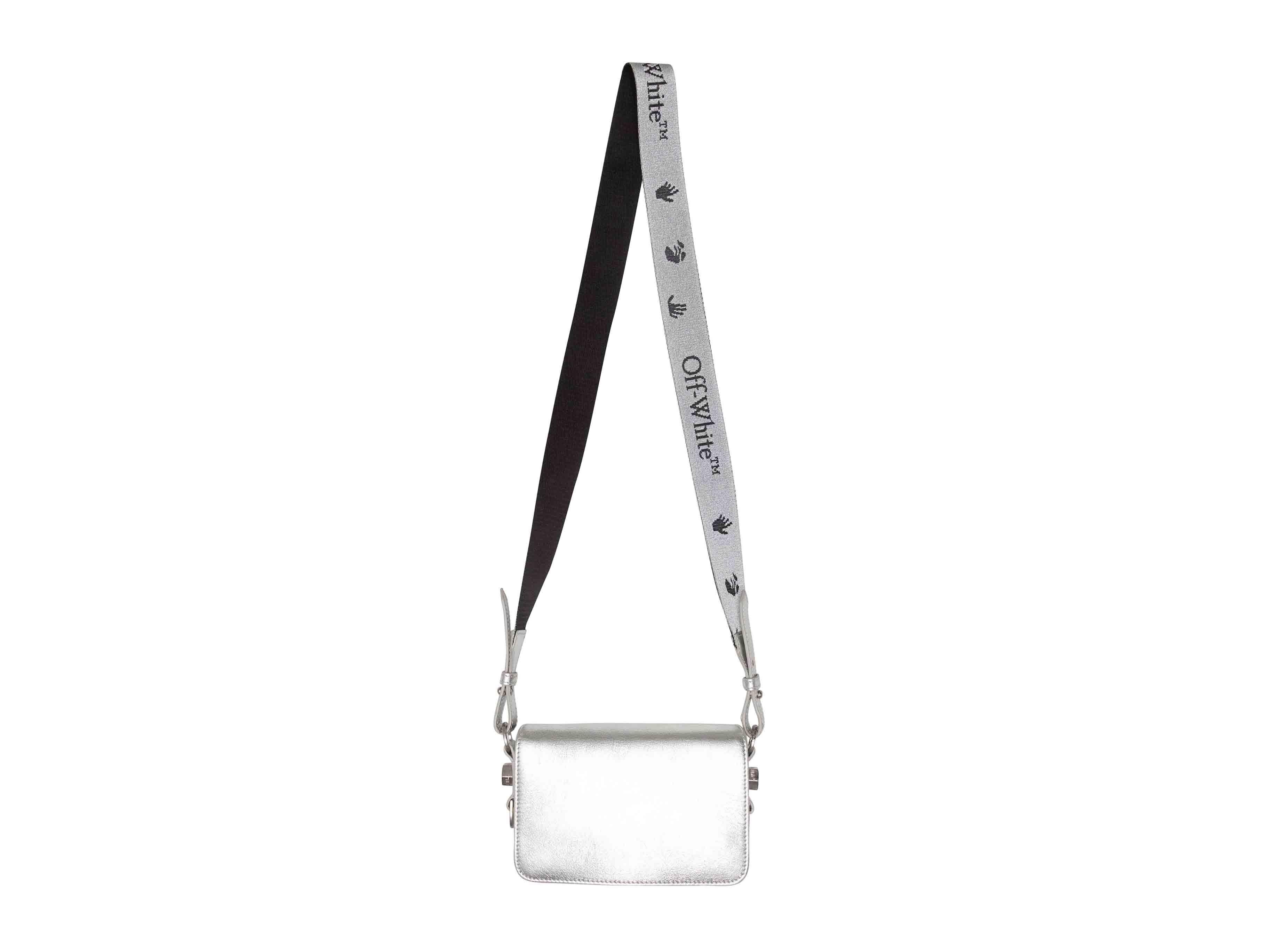 Product Details: Silver Off-White Leather Crossbody Bag. This crossbody bag features a metallic leather body, silver-tone hardware, a single flat crossbody strap, and a front flap closure. 7" L x 5" H x 1.75" D, 19.25" shoulder strap drop.