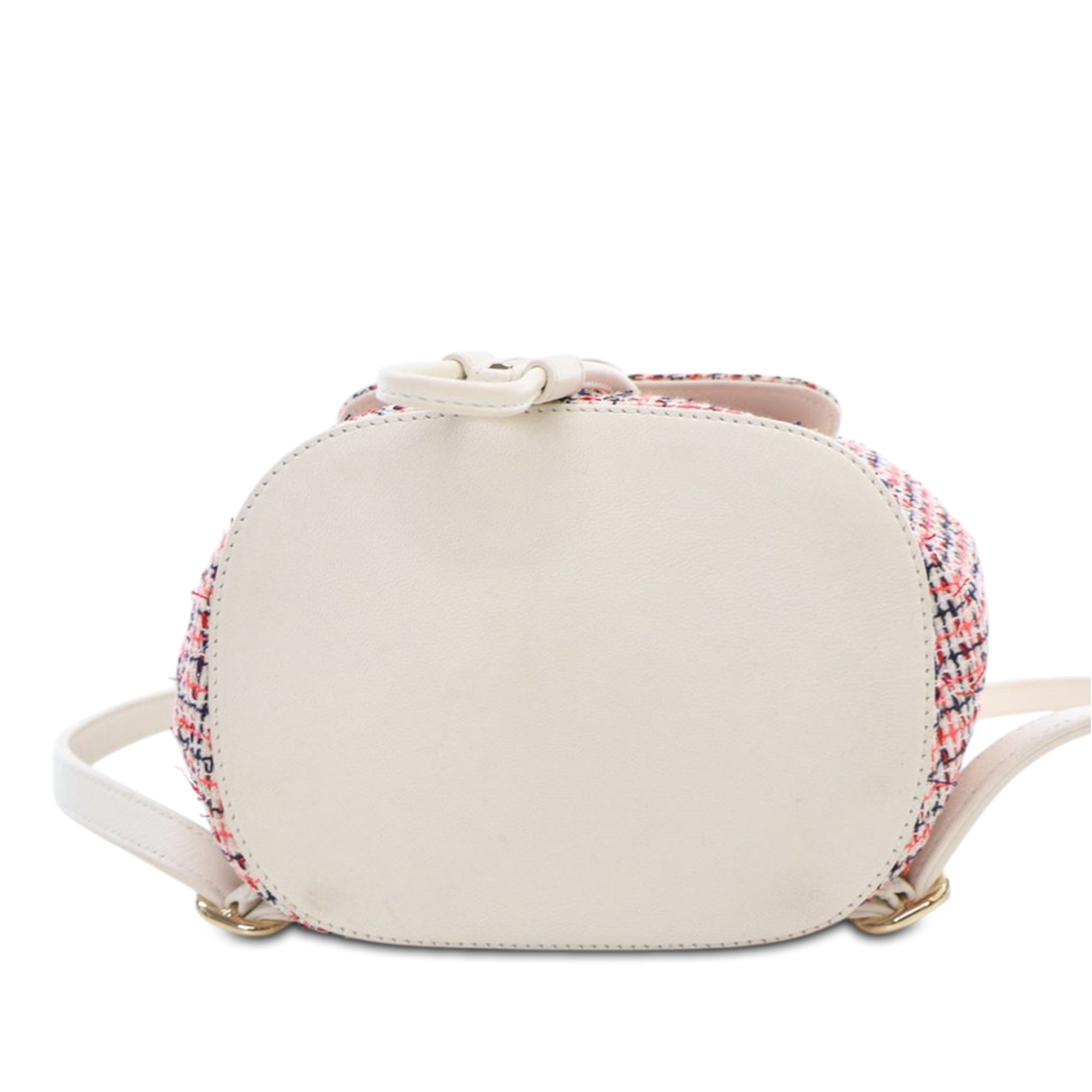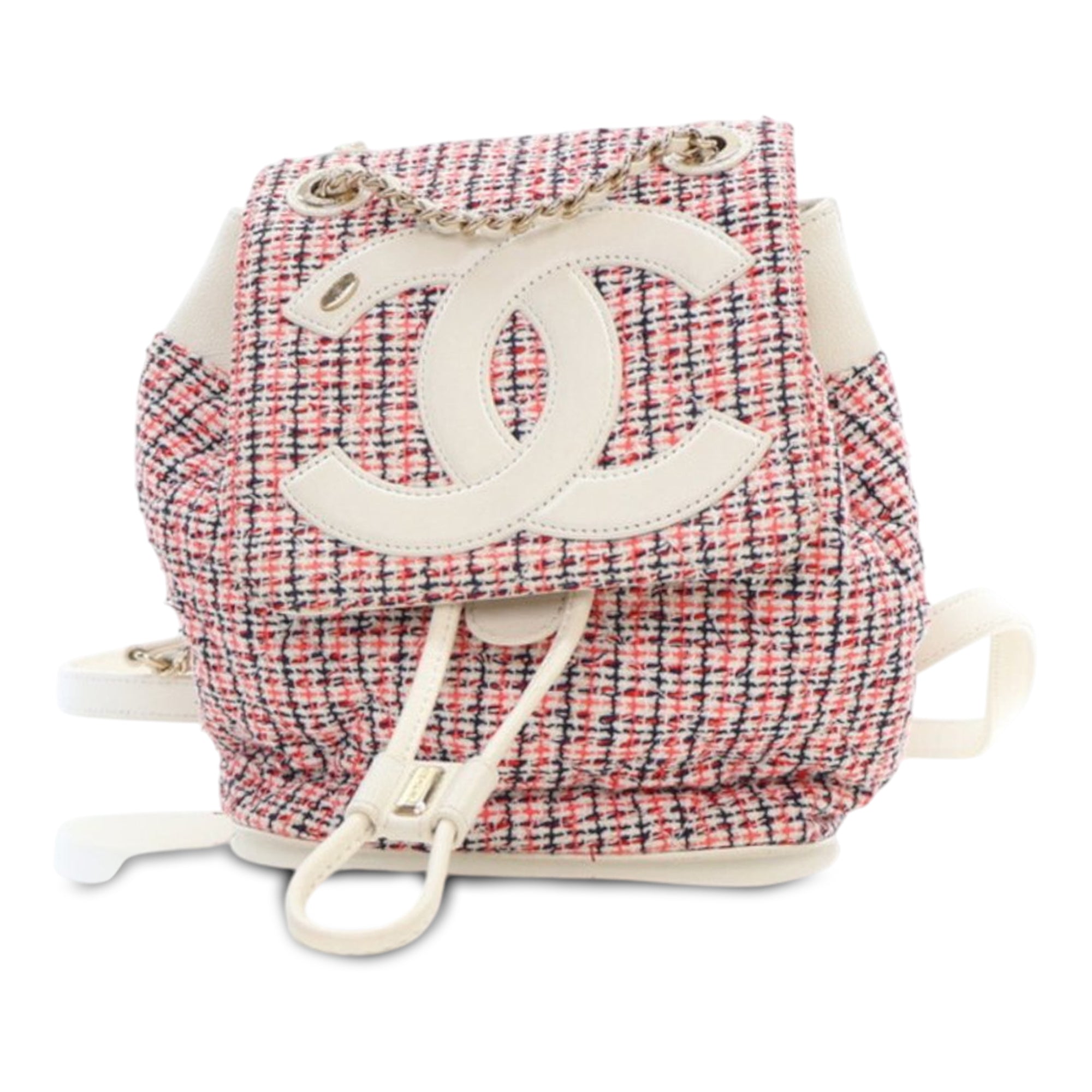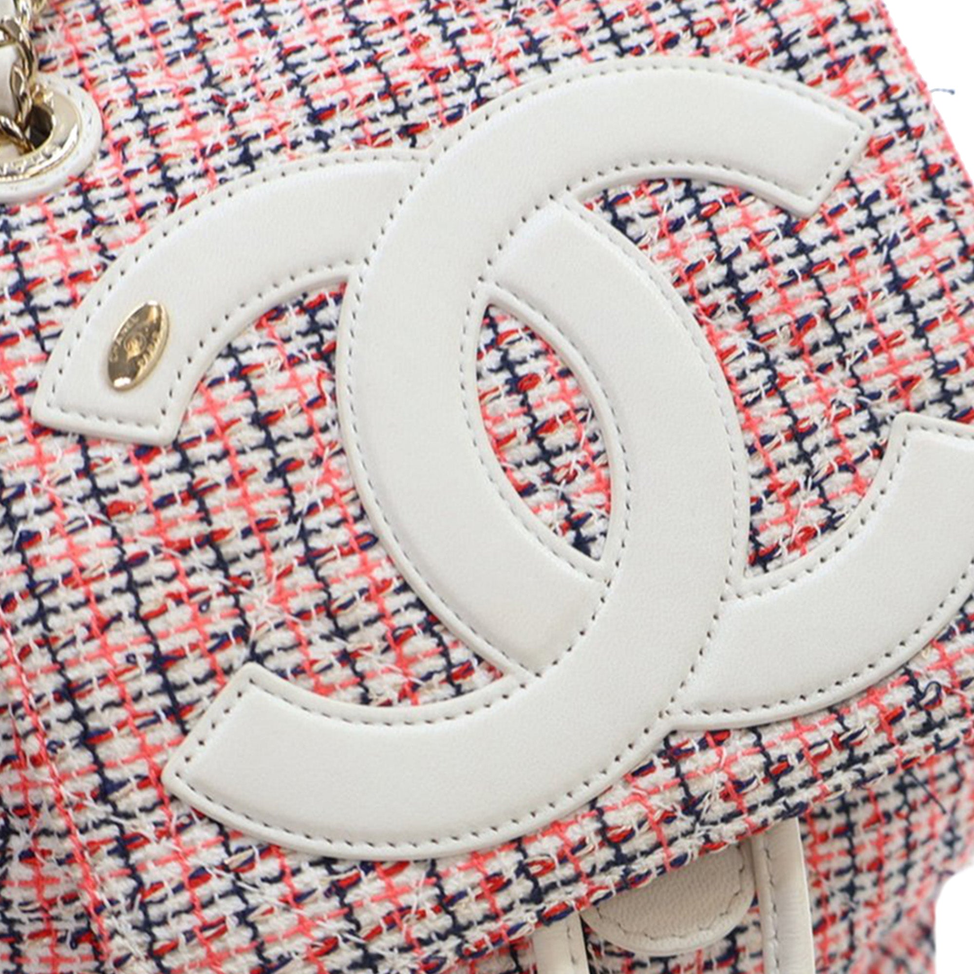 Product Details: Red Chanel Tweed and Lambskin CC Mania Backpack. This backpack features a tweed body with lambskin leather trim, leather woven chain backstraps, a front flap, a leather drawstring closure, and an interior slip pocket. 7.5" L x 7.1" W x 4.7" D, 2.8" drop.