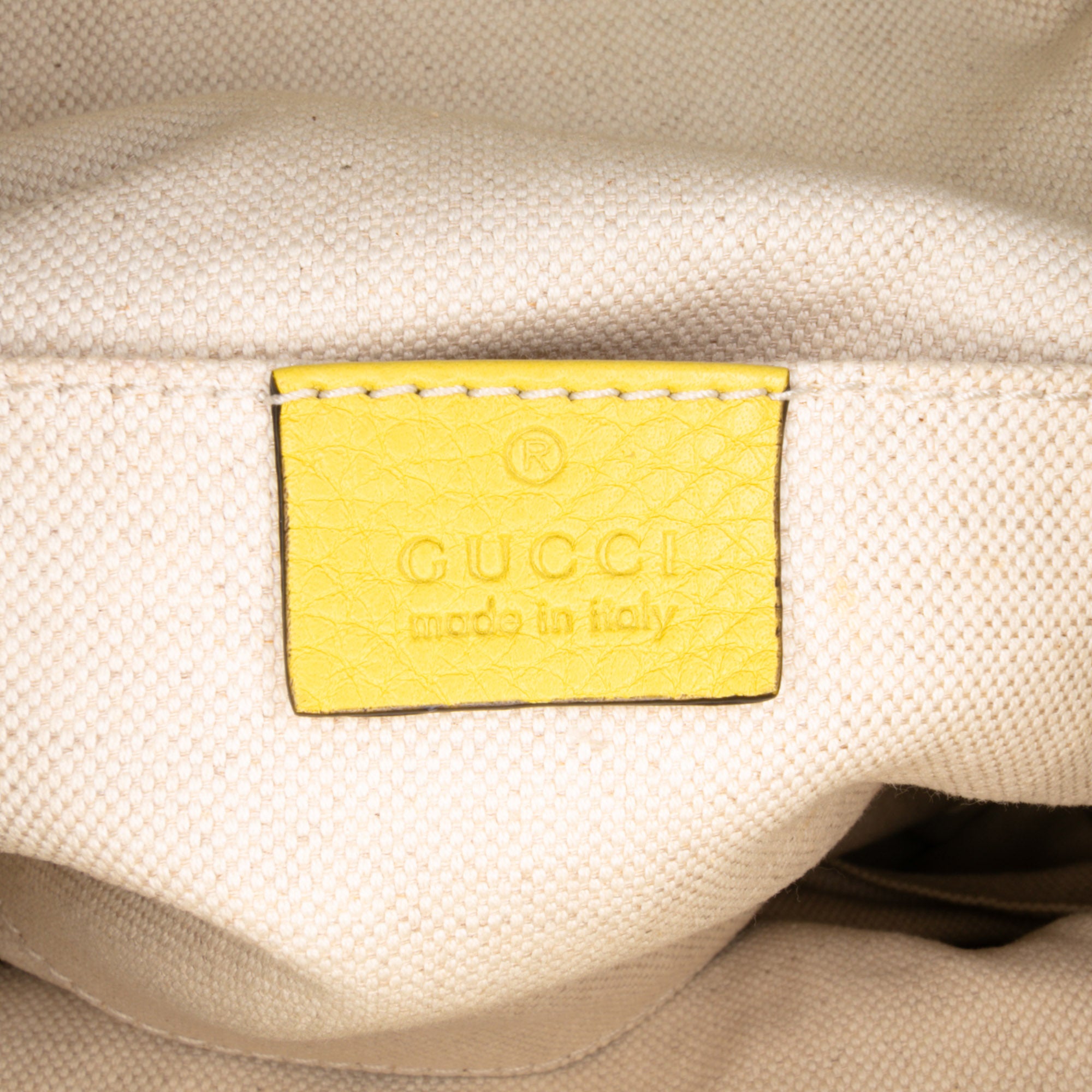 Product Details: Yellow Gucci Leather Bamboo Tassel Backpack. This backpack features a leather body, a bamboo top handle, adjustable flat leather back straps, a top drawstring closure with tassel pulls, a front flap with buckle closure, exterior flap pockets with bamboo turn-lock closures, and interior slip pockets. 12.2" L x 12.2" W x 3.5" D, 3.1" drop. Serial number 370833 493075.