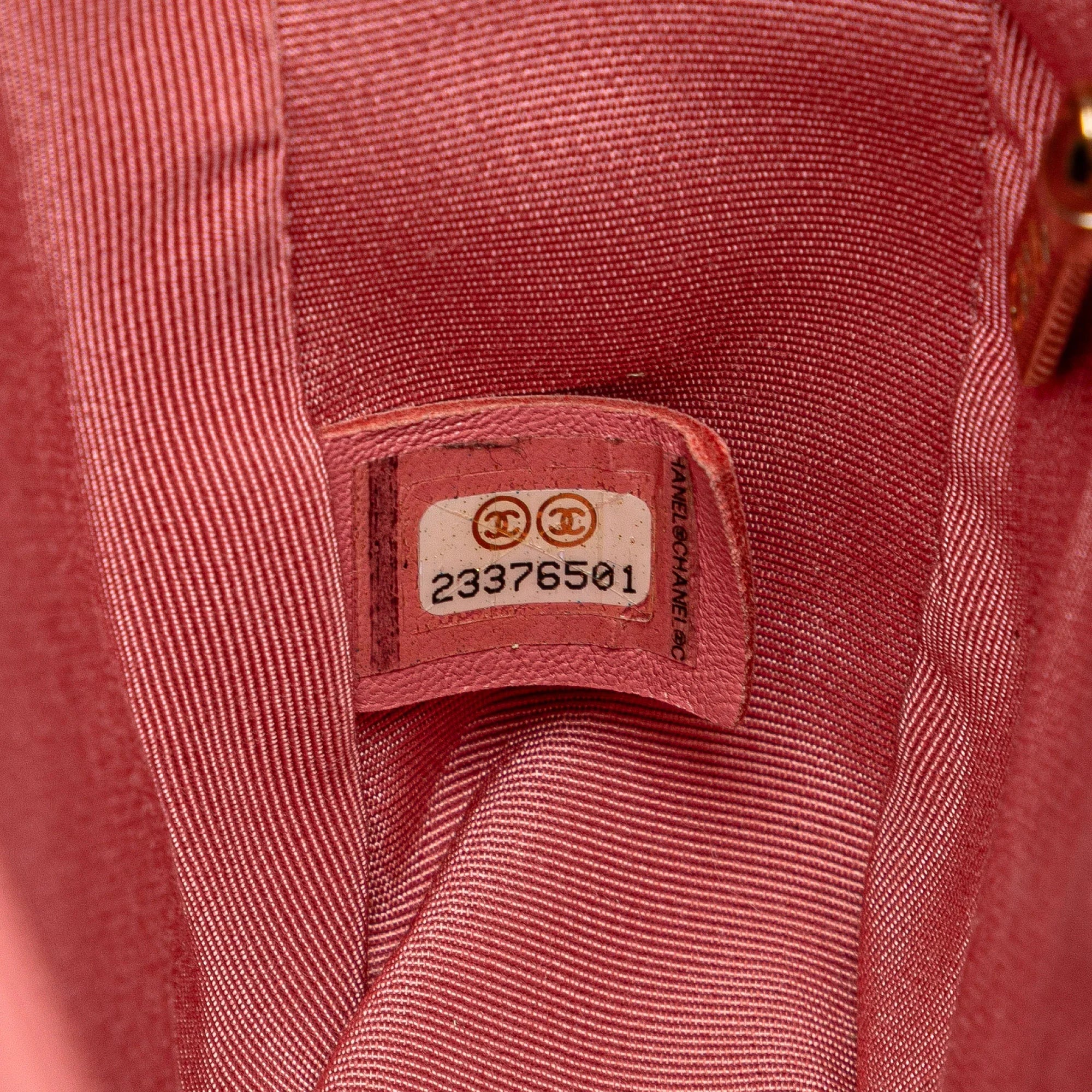 Product Details: Pink Chanel Quilted Calfskin Straight Lined Flap Crossbody Bag. This crossbody bag features a quilted calf leather body, a chain link strap with leather guard, a front flap with interlocking Cs and a twist lock closure, and an interior zip pocket. 5.5" L x 8.3" W x 2.2" D. Serial number 23376501.