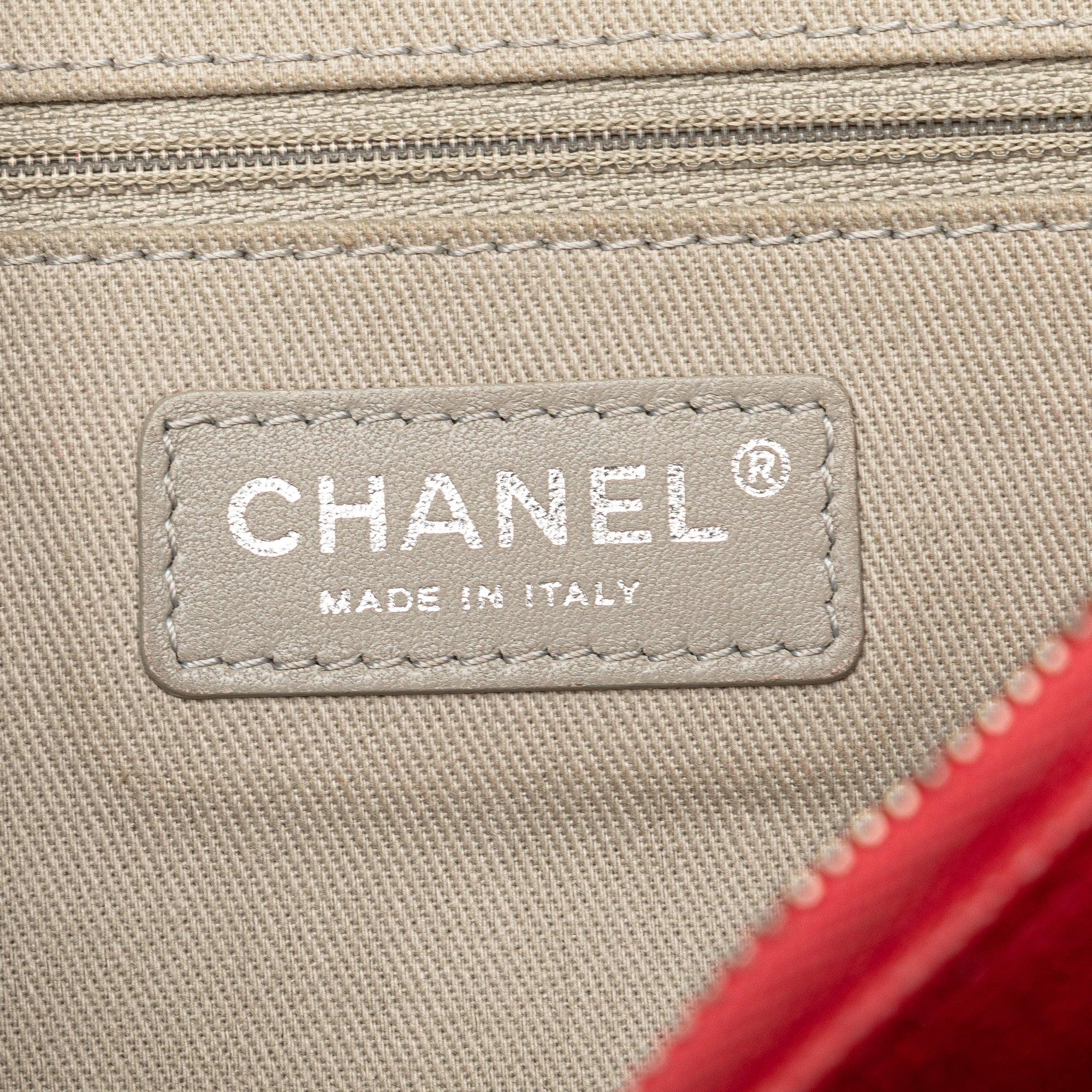 Product Details: Red Chanel Jumbo Caviar Easy Flap Bag. This shoulder bag features a quilted caviar leather body, leather woven chain shoulder straps, a front flap with double Cs and twist lock closure, and interior zip and slip pockets. 7.5" L x 12.2" W x 2.8" D, 9.1" drop. Serial number 20291932.