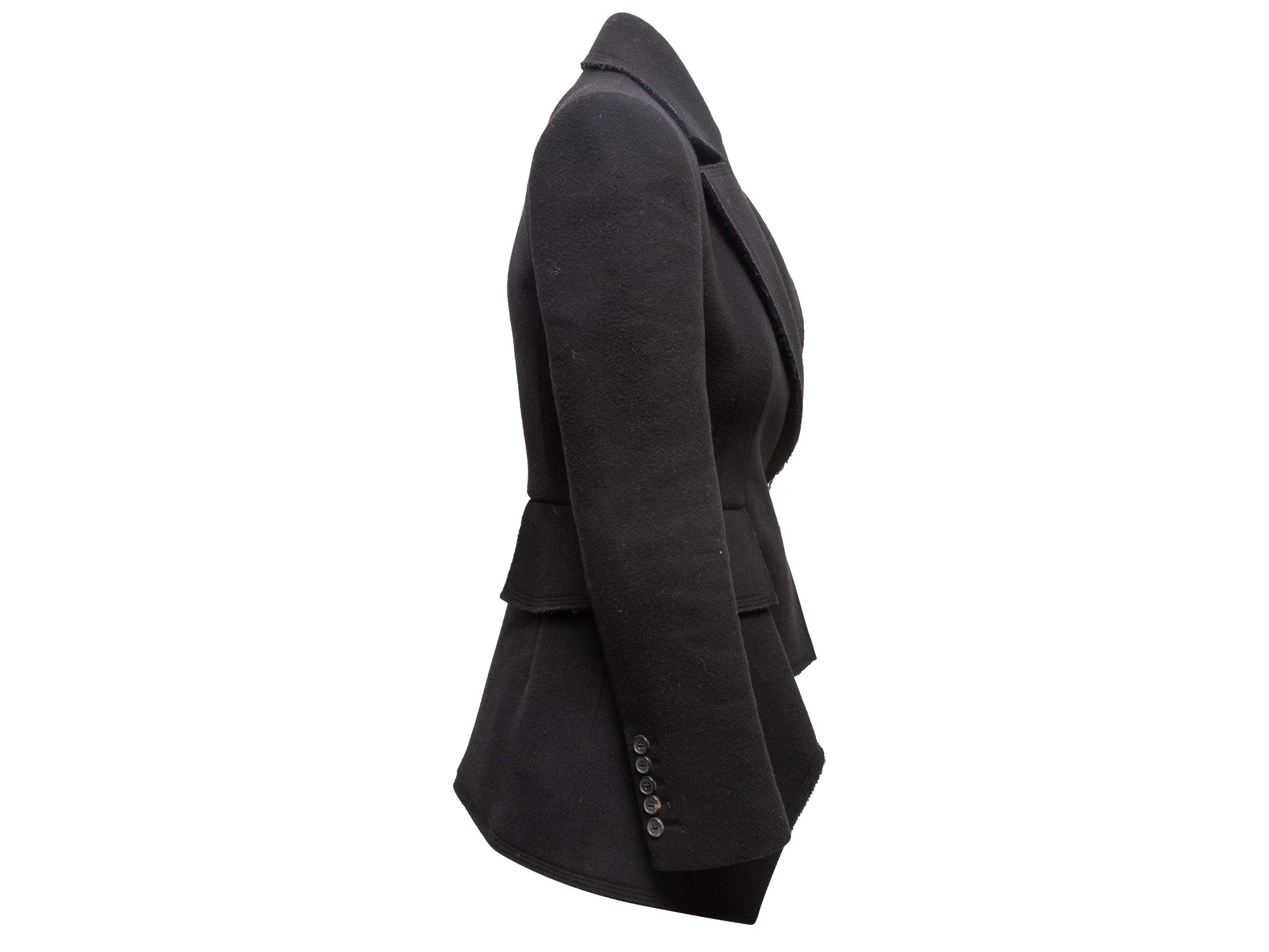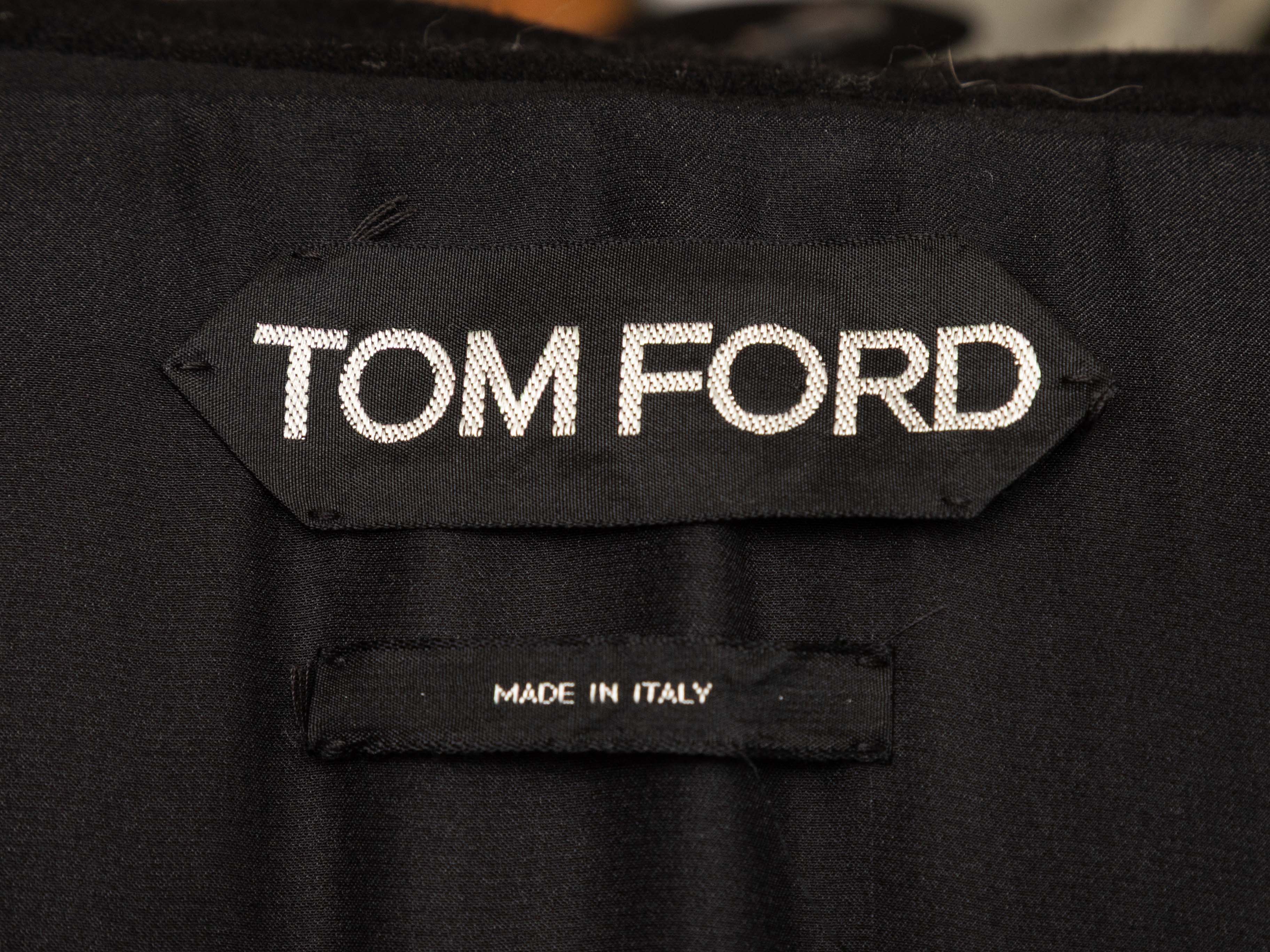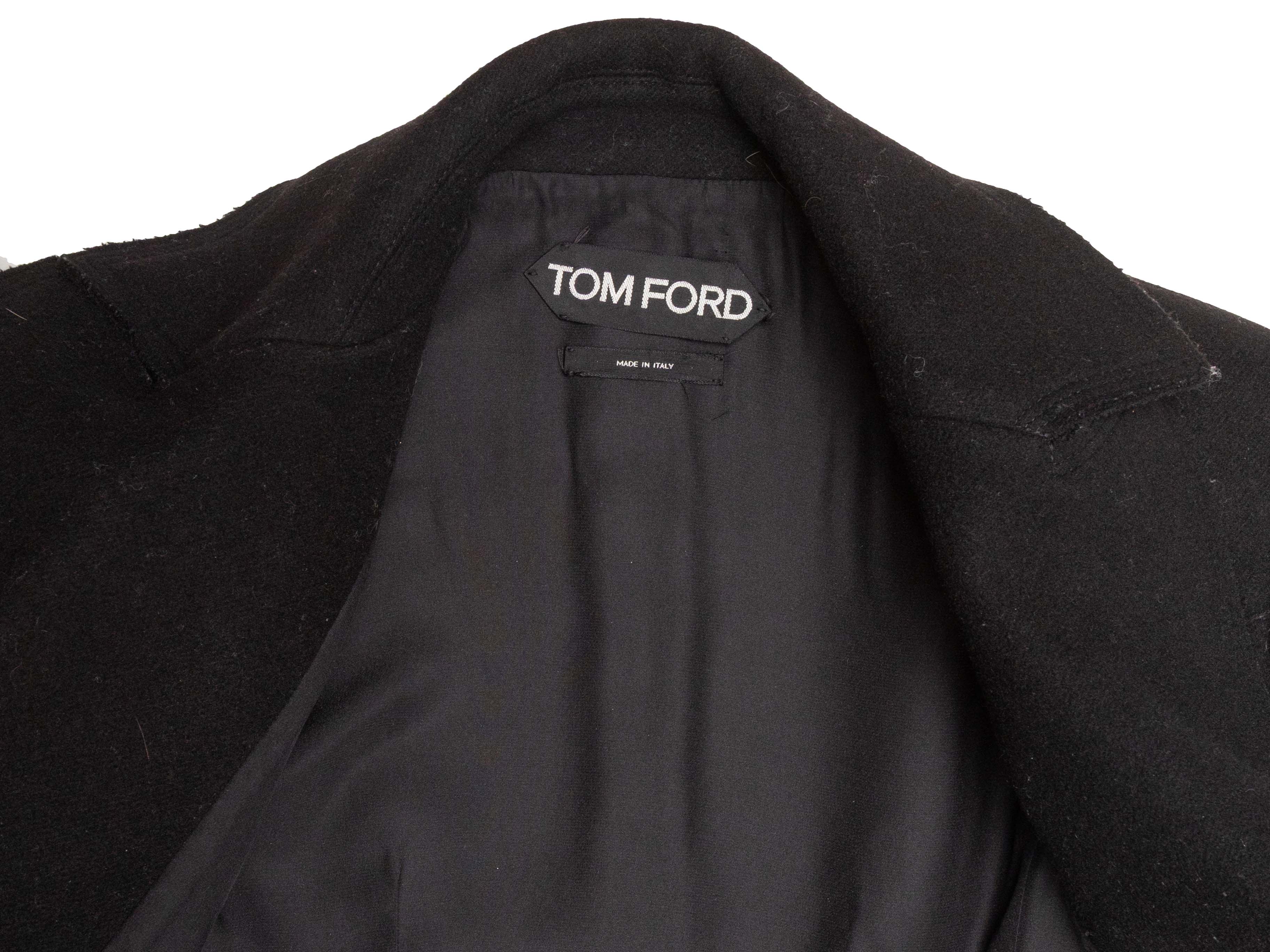Product Details: Black virgin wool and cashmere-blend peplum blazer by Tom Ford. Notched lapel. Three pockets. Single button closure at front. 30" bust, 15.5" shoulder width, 23.5" sleeve length, 34" length.