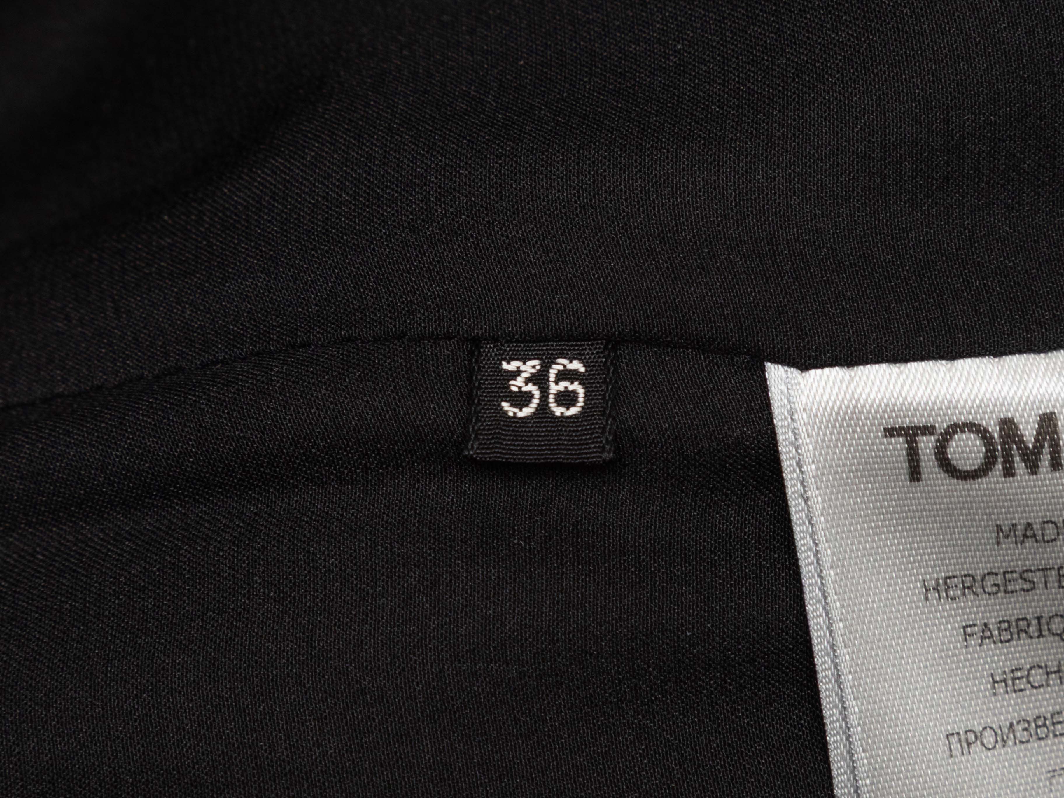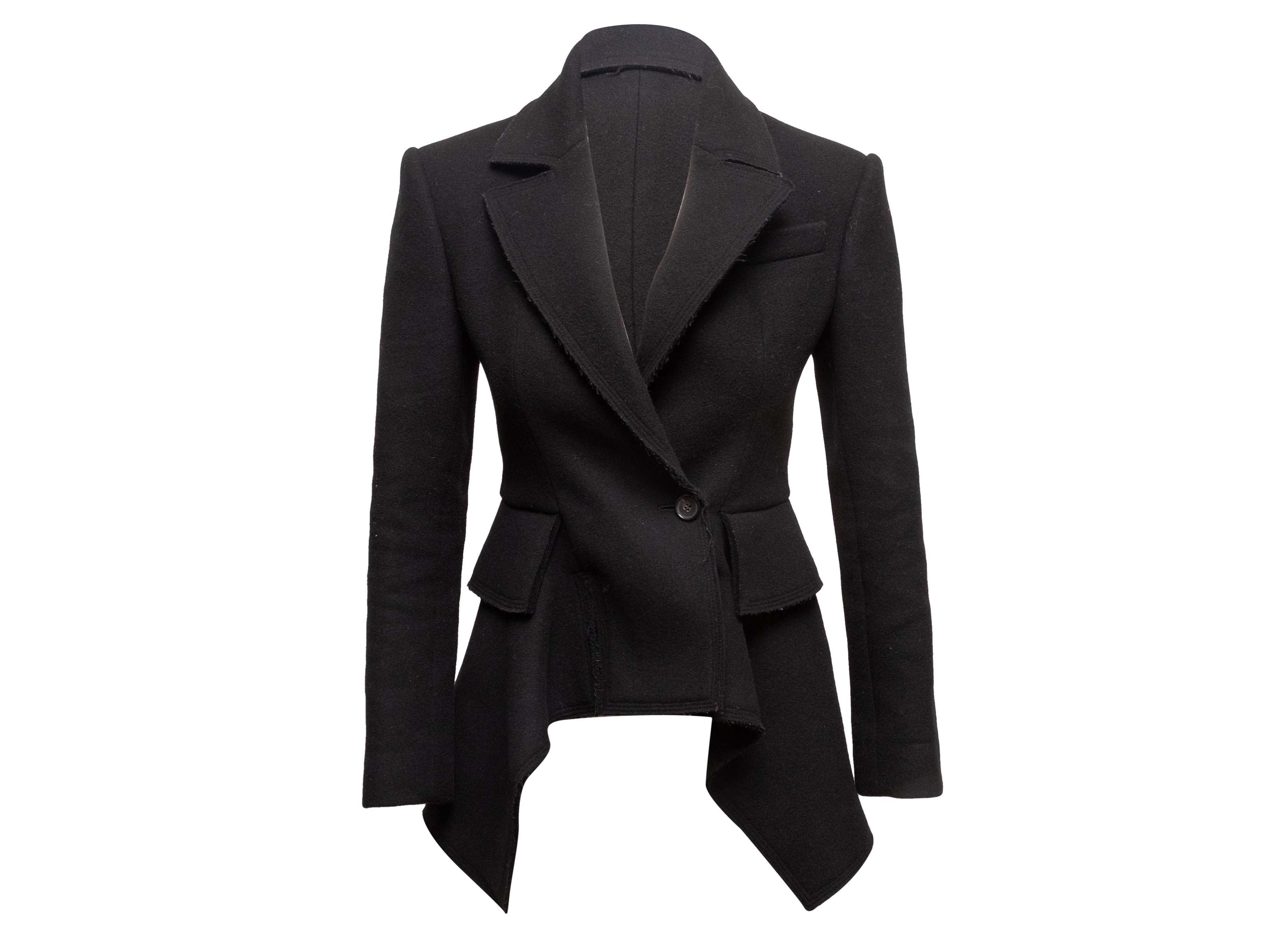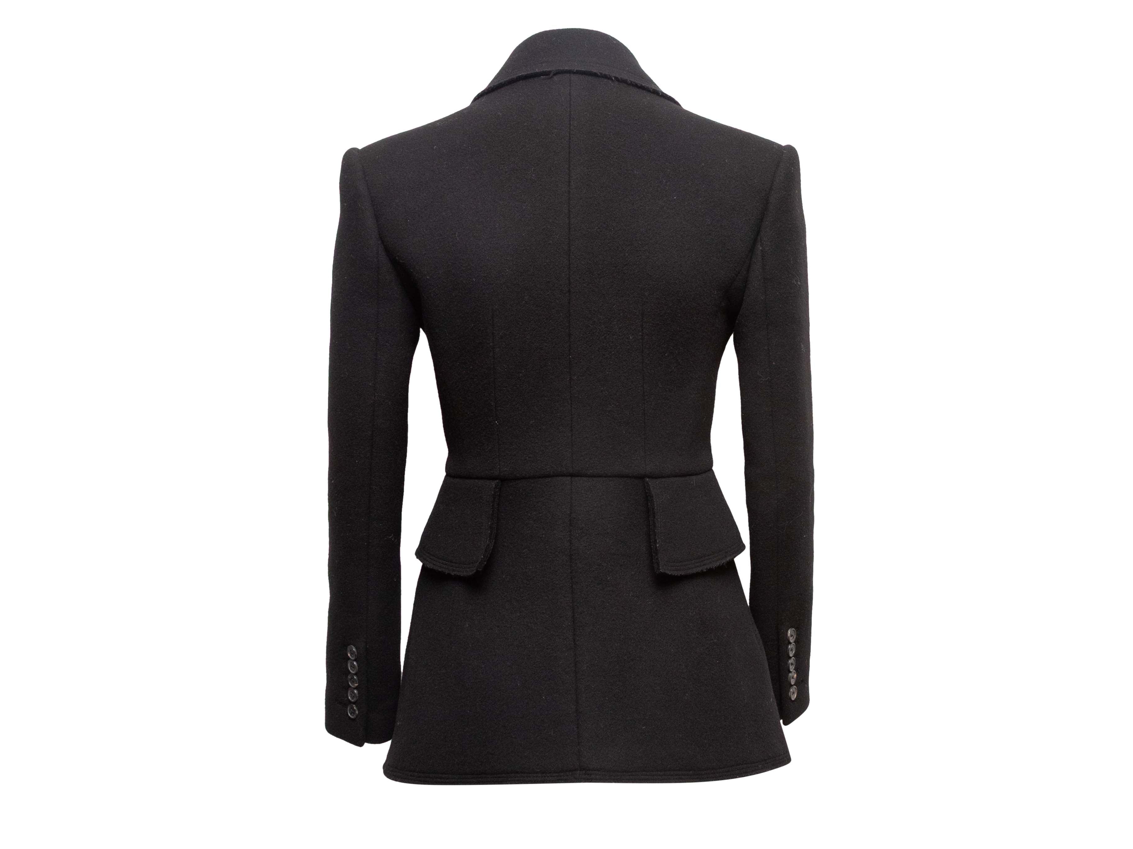 Product Details: Black virgin wool and cashmere-blend peplum blazer by Tom Ford. Notched lapel. Three pockets. Single button closure at front. 30" bust, 15.5" shoulder width, 23.5" sleeve length, 34" length.