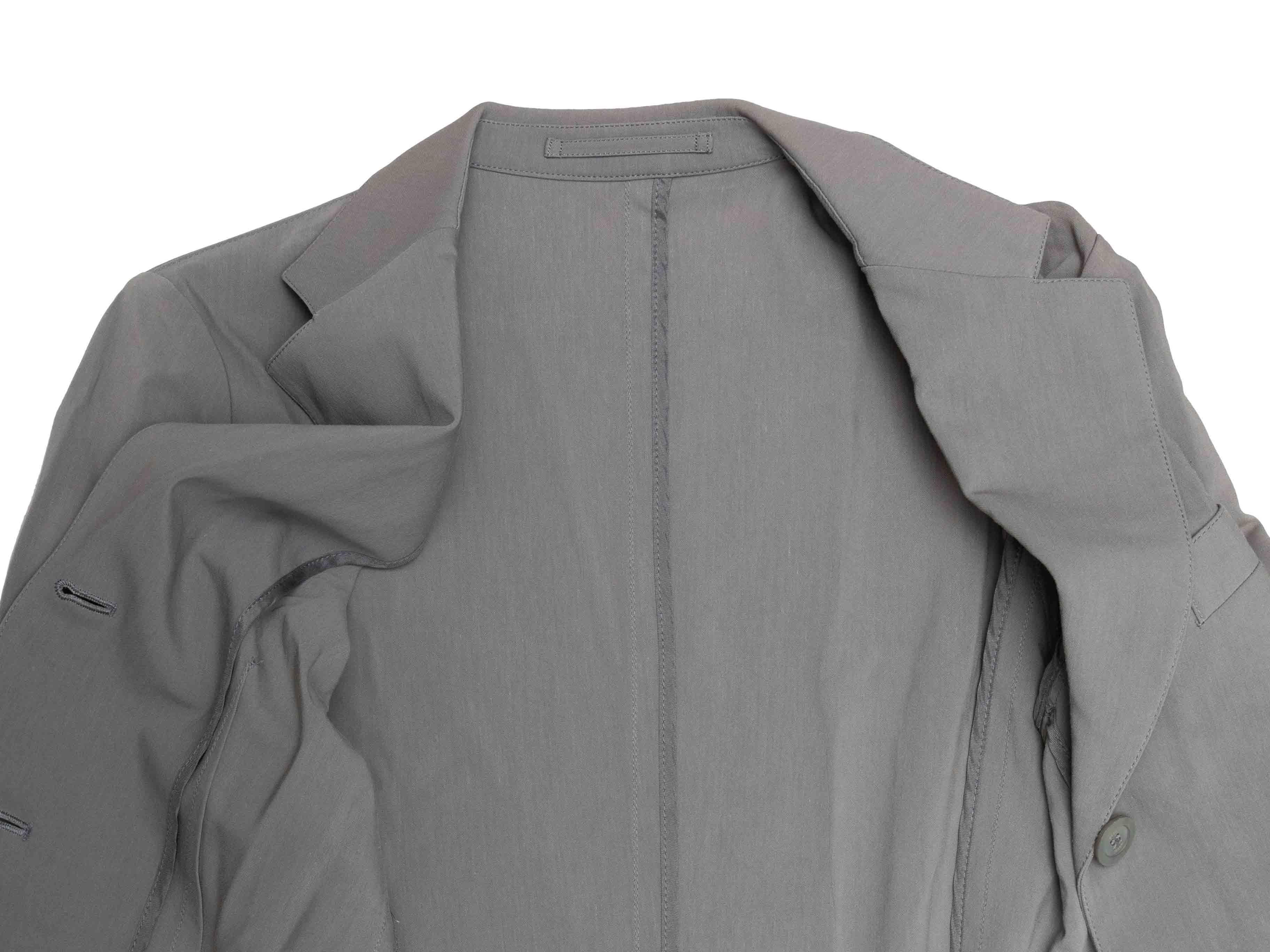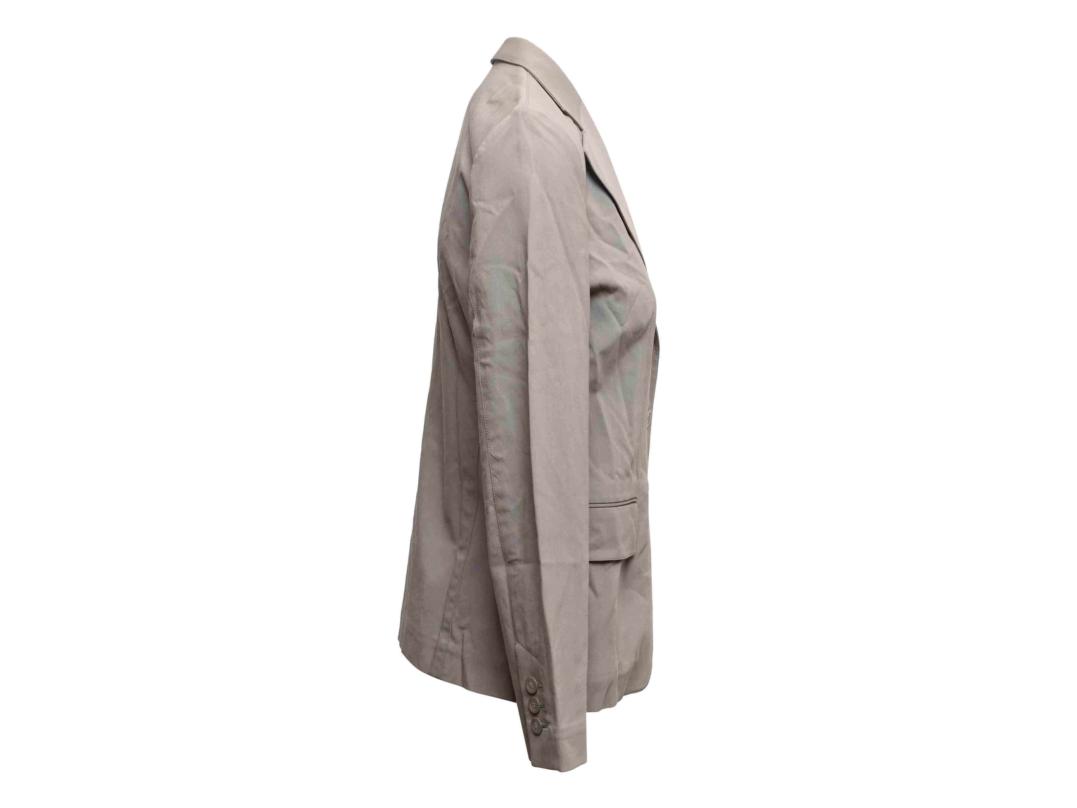 Product Details: Grey cotton-blend blazer by Gucci. Notched lapel. Three pockets at front. Button closures at center front. 35" bust, 15.5" shoulder width, 24" sleeve length, 28" length.