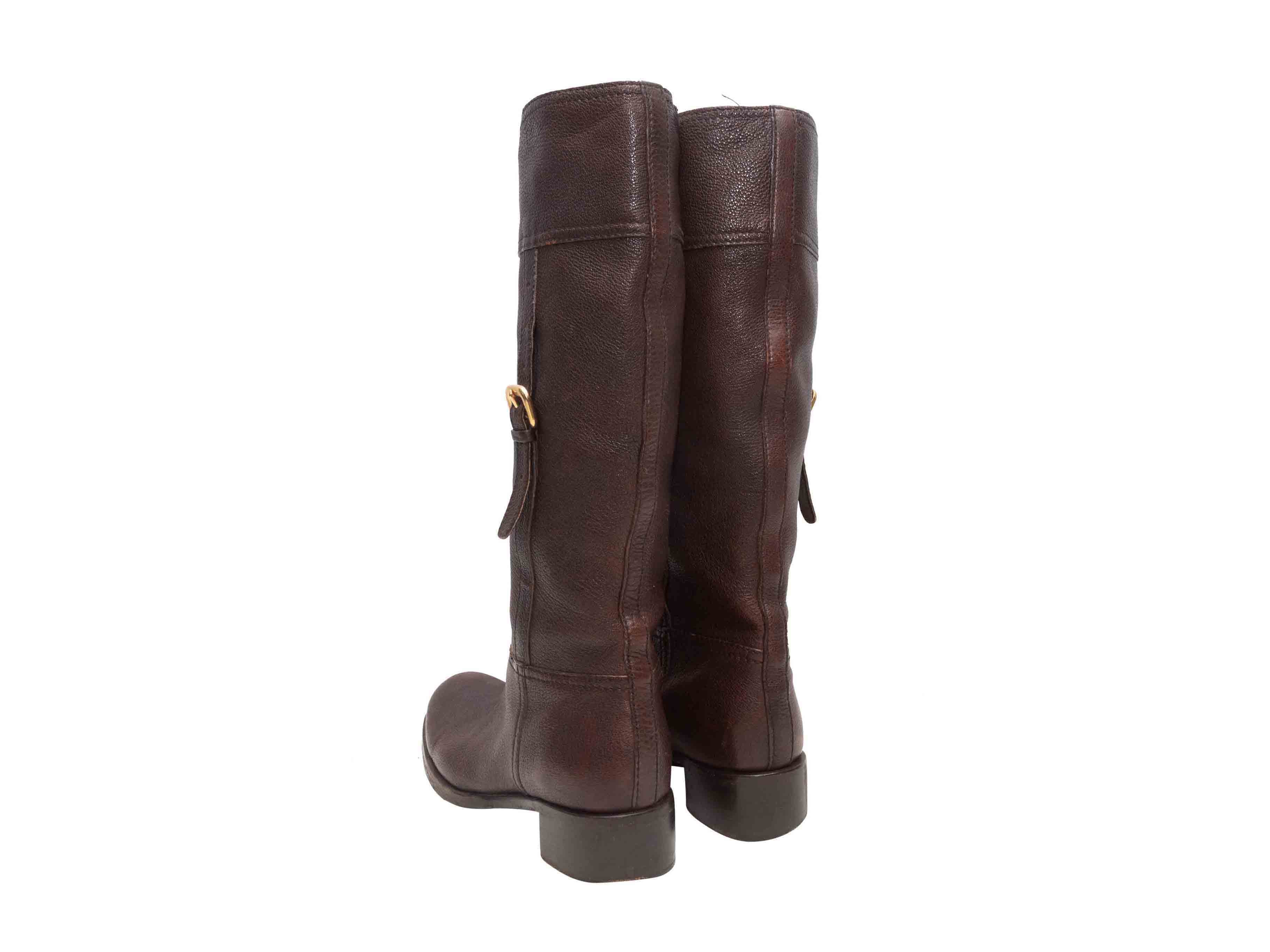 Product Details: Brown knee-high leather buckle boots by Prada. Gold-tone hardware. Stacked heels. 15" shaft height, 0.25" platform height, 1.5" heel height.