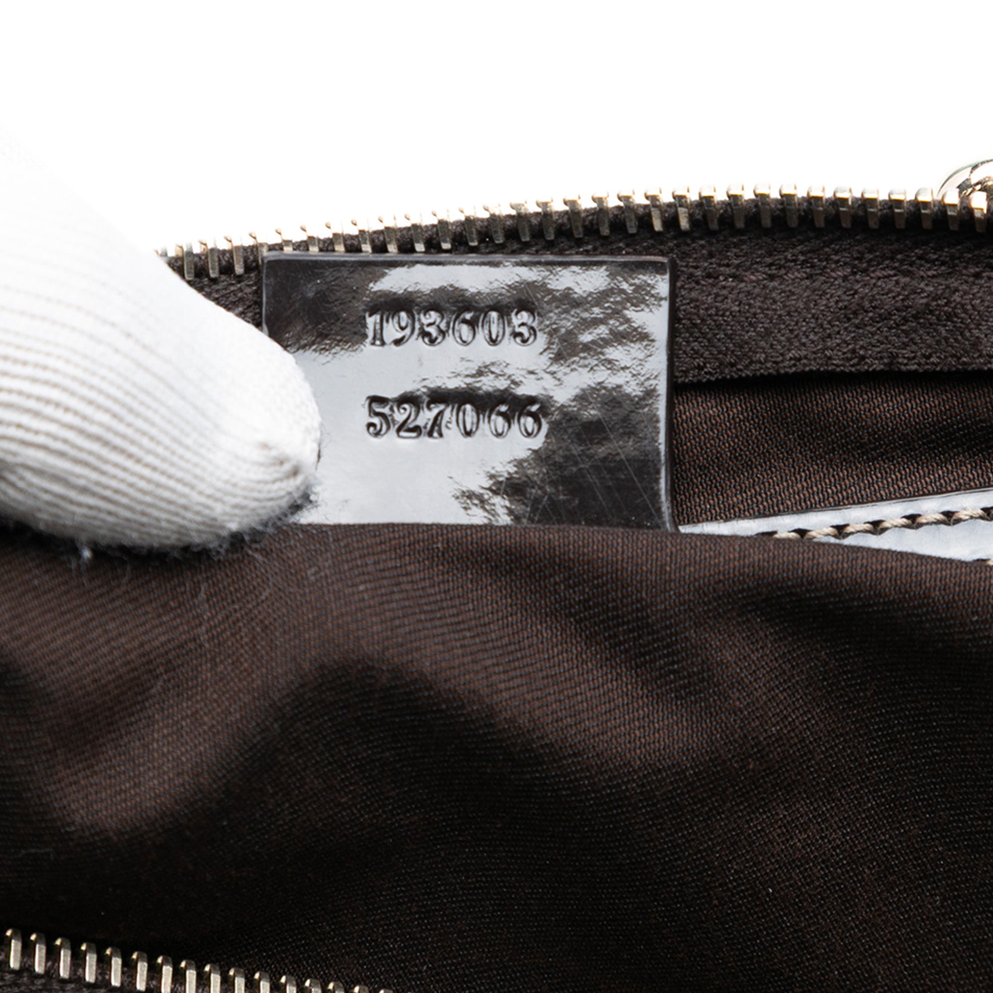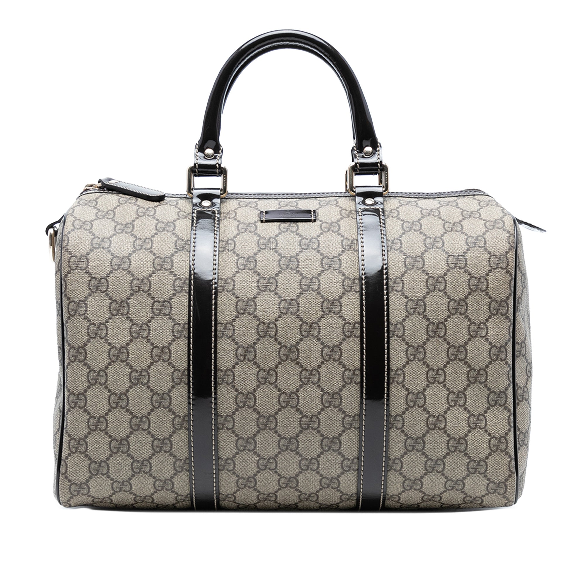 Product Details: Brown Gucci Medium GG Supreme Joy Boston Bag. This boston features a coated canvas body with leather trim, rolled leather handles, a top zip closure, and an interior slip pocket. 9.4" L x 12.8" W x 6.7" D, 3.9" drop. Serial number 193603 527066.