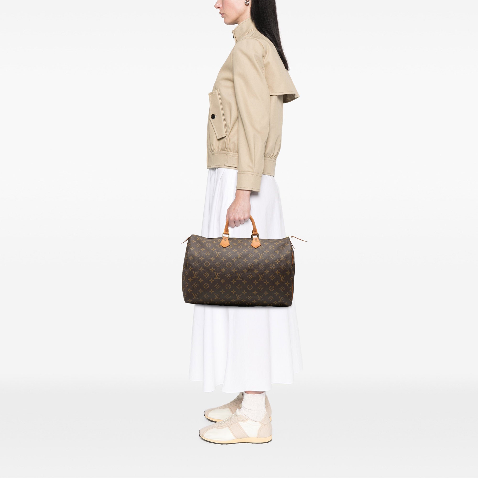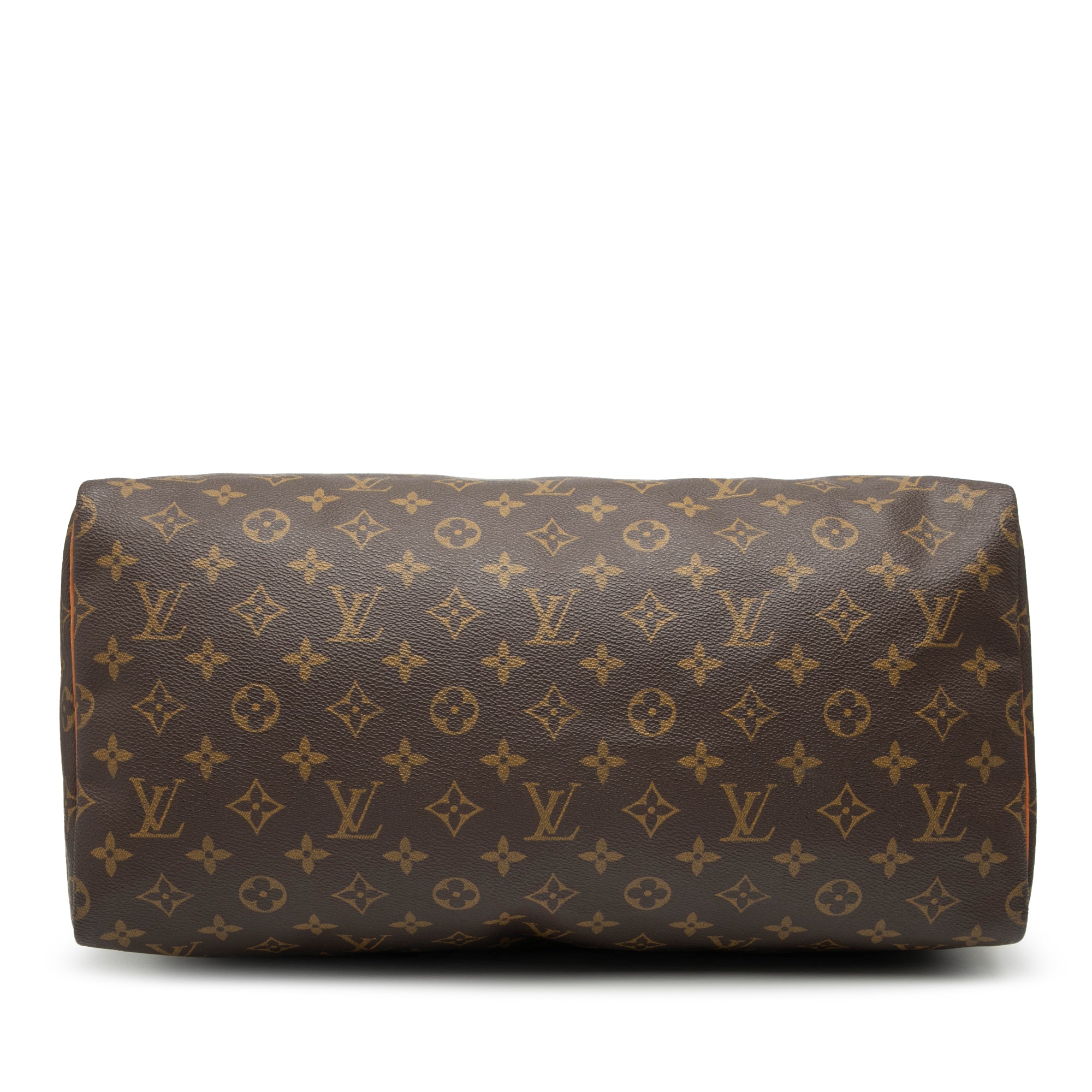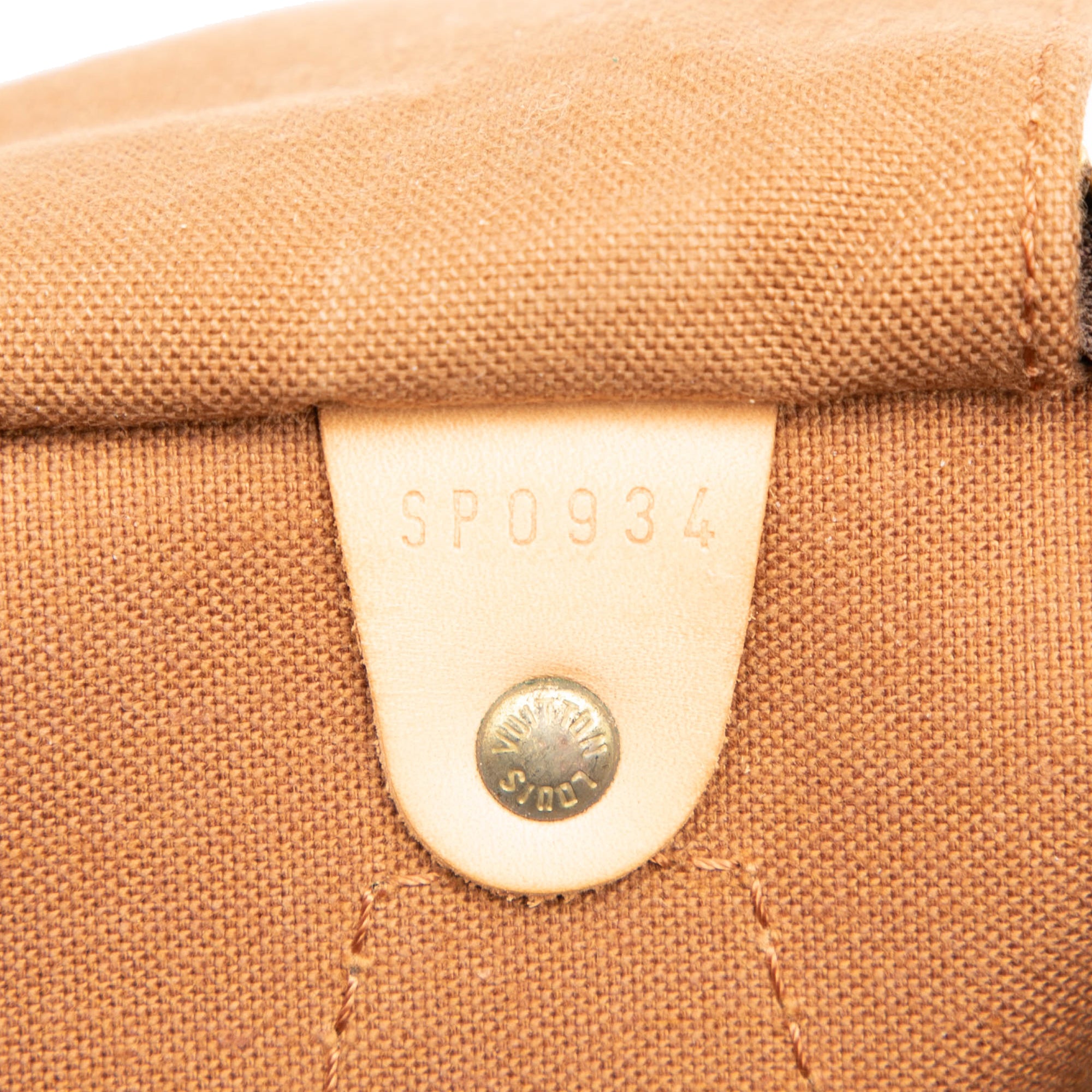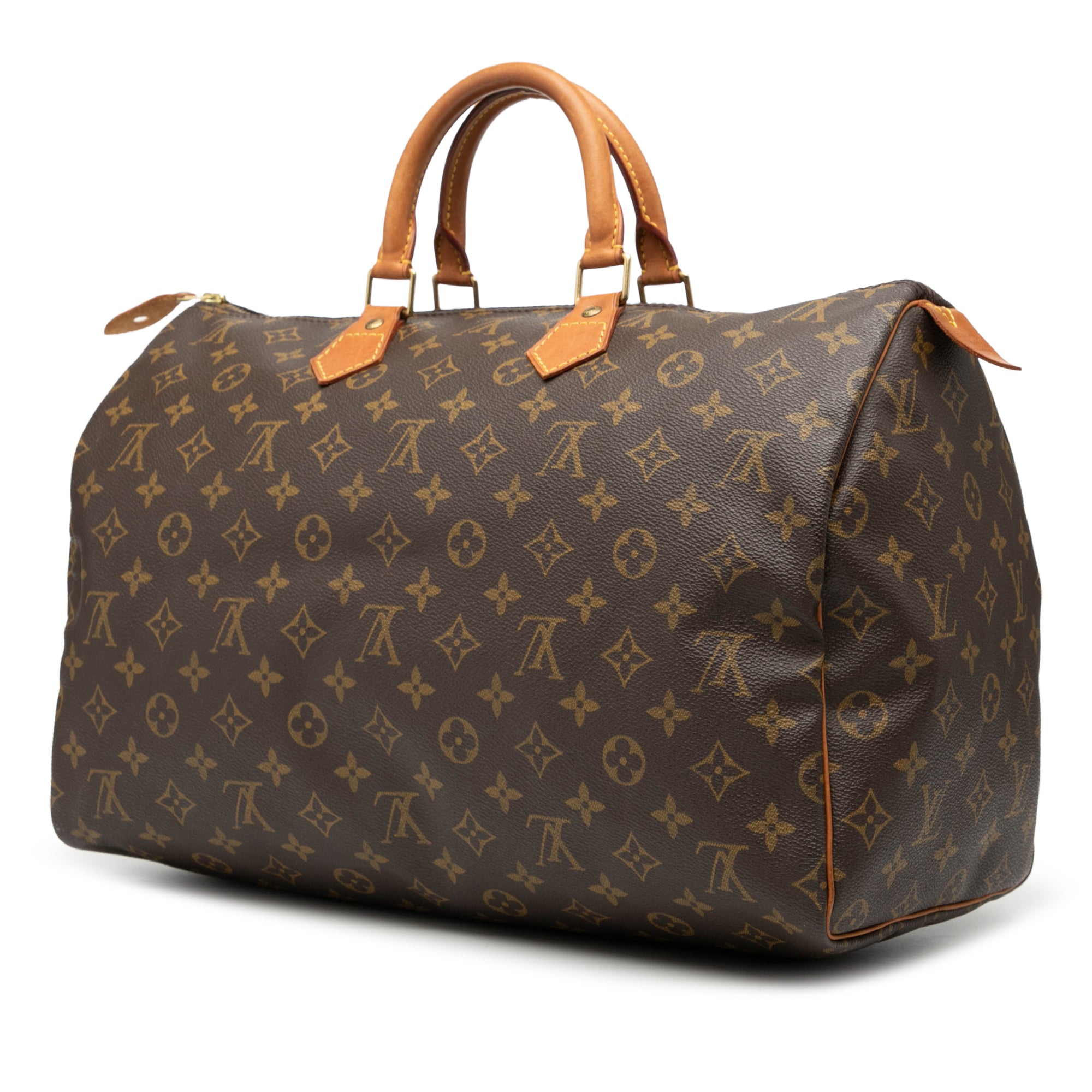 Product Details: Brown Louis Vuitton Monogram Speedy 40 Boston Bag. The Speedy 40 features a monogram canvas body, rolled vachetta leather handles, and a top zip closure. 9.8" L x 15.7" W x 7.5" D, 3.1" drop. Serial number SP0934.