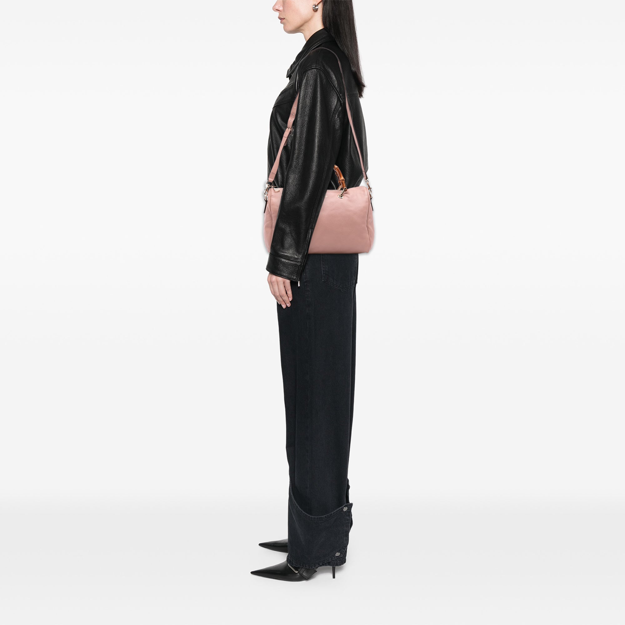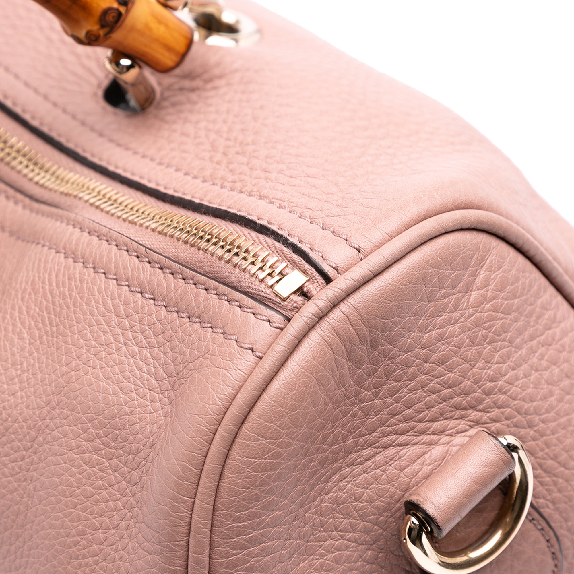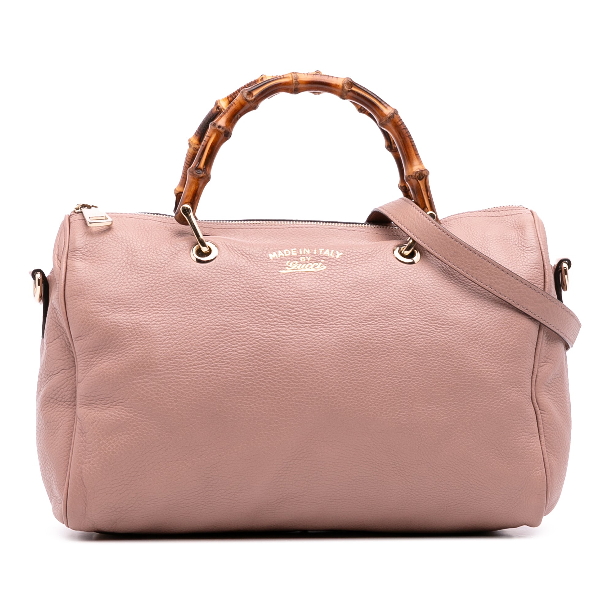 Product Details: Pink Gucci Medium Calfskin Bamboo Shopper Boston Bag Satchel. This satchel features a leather body, bamboo top handles, a detachable flat leather strap, a top zip closure, and interior zip and slip pockets. 9.3" L x 13" W x 4.1" D, 4.3" drop. Serial number 353124 525040.