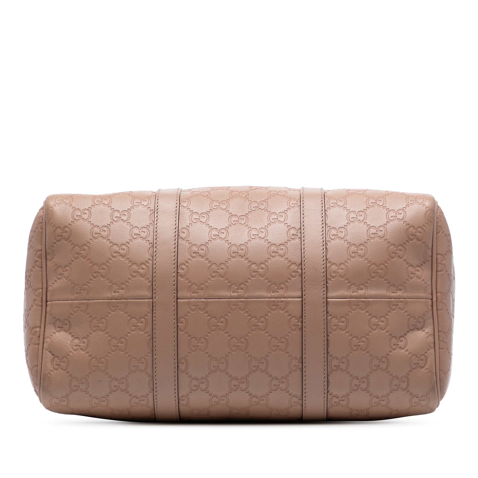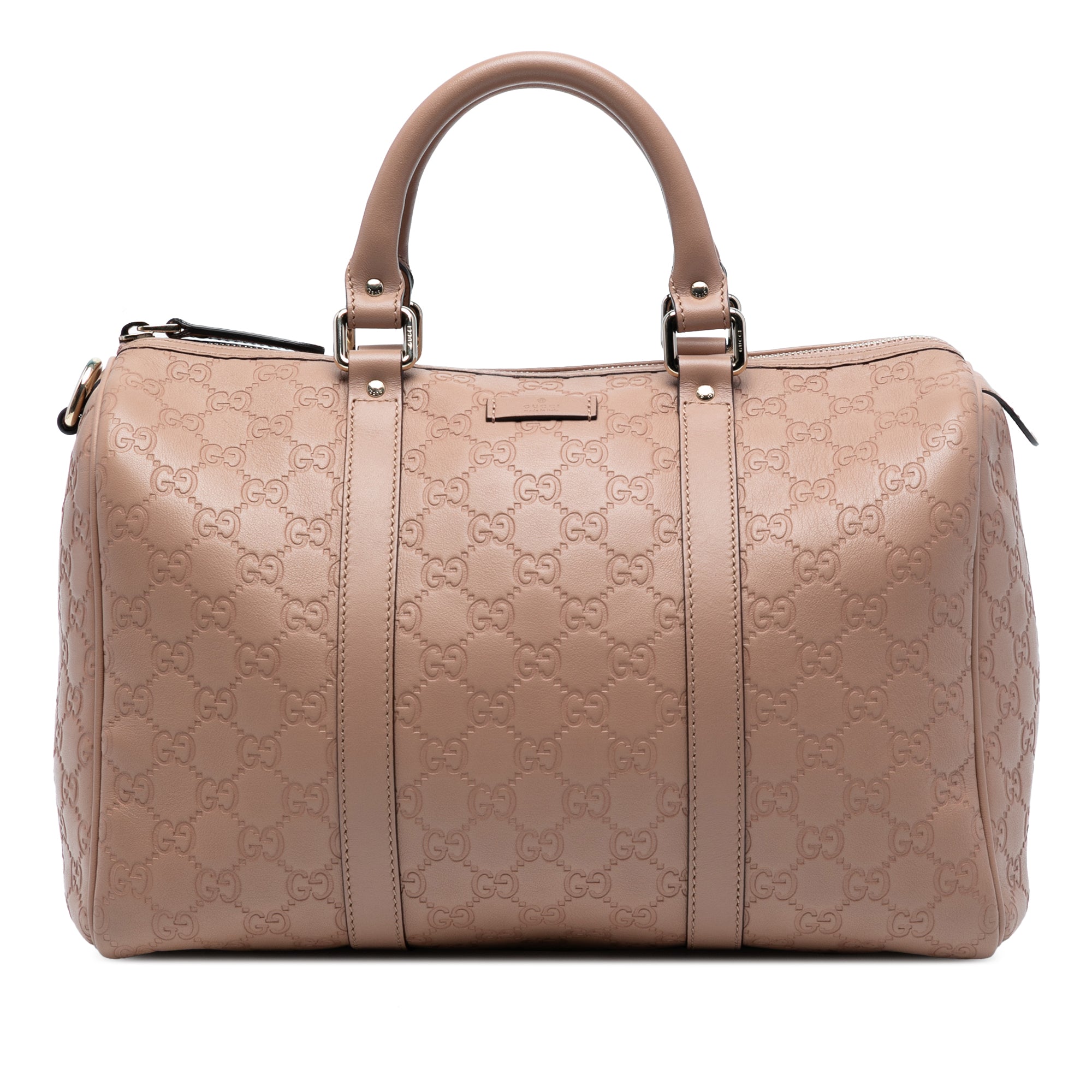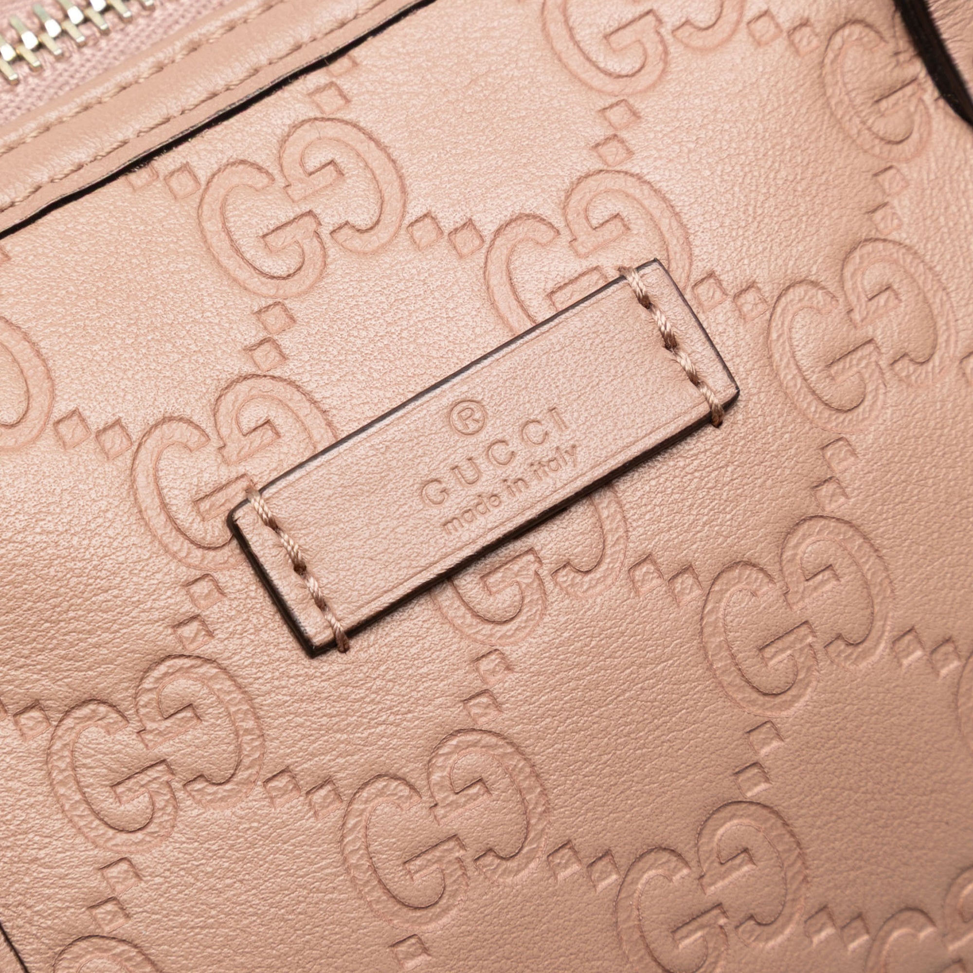Product Details: Pink Gucci Medium Guccissima Joy Boston Bag. The Joy boston bag features an embossed leather body, rolled leather handles, a top zip closure, and an interior zip pocket. 8.7" L x 13" W x 6.7" D, 3.9" drop. Serial number 265697 493075.
