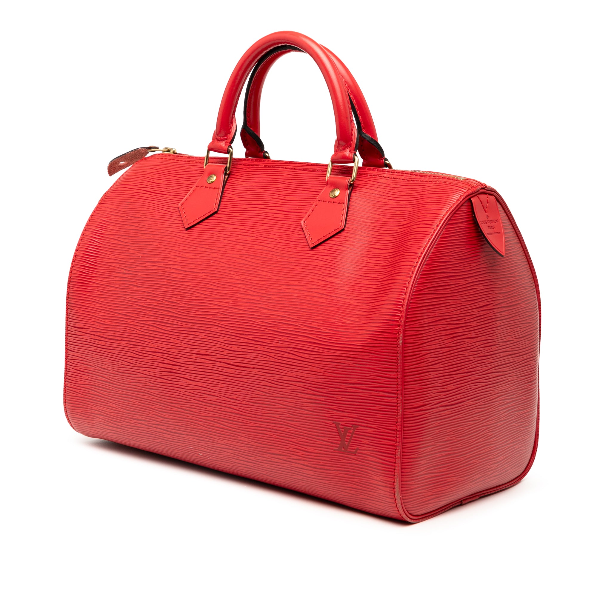 Product Details: Red Louis Vuitton Epi Speedy 30 Boston Bag. The Speedy 30 features an epi leather body, rolled handles, a top zip closure, and an interior slip pocket. 8.9" L x 12.8" W x 6.7" D, 3.1" drop. Serial number VI0972.