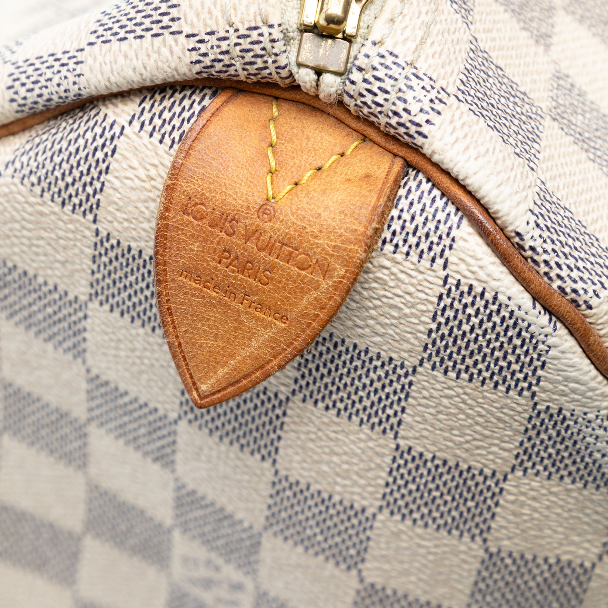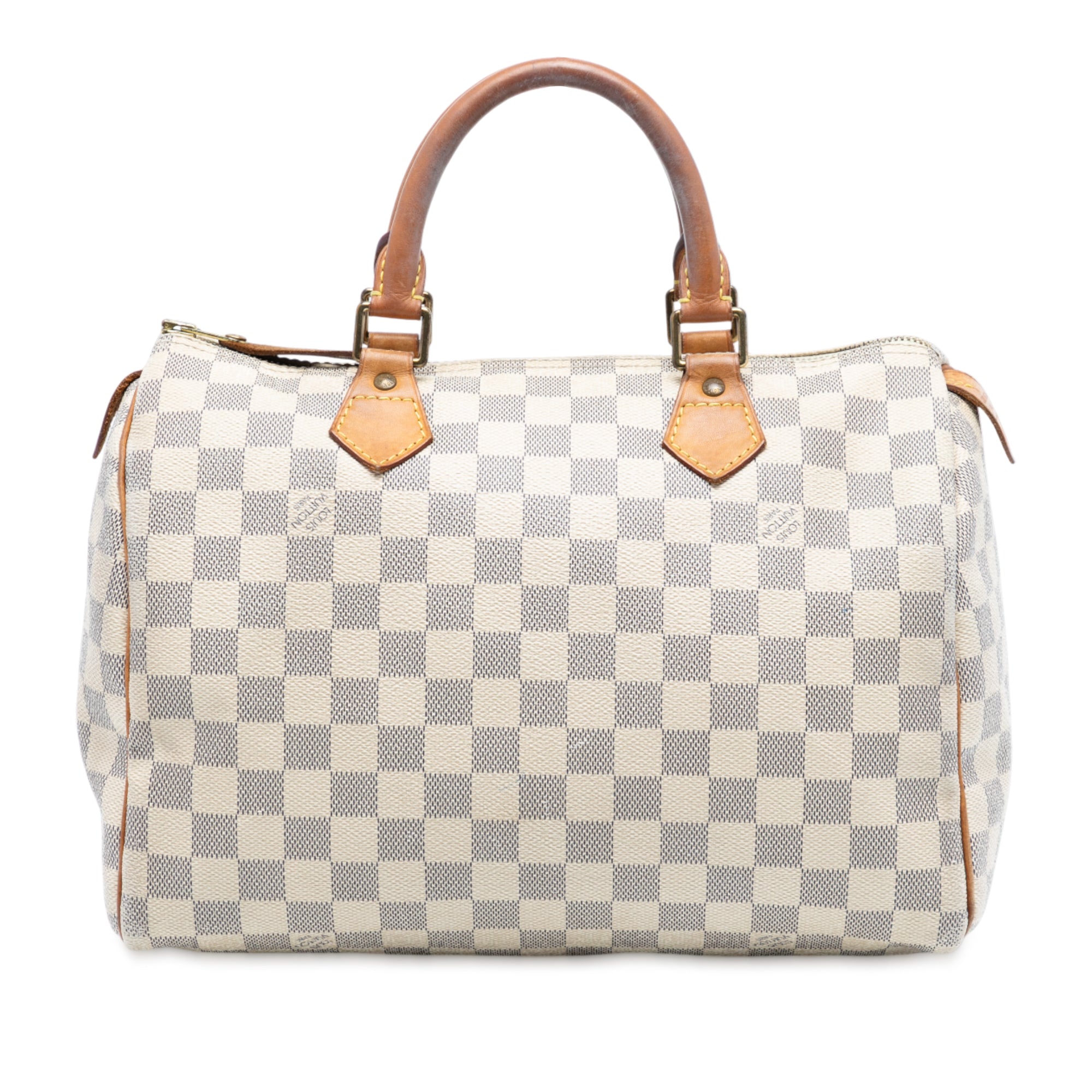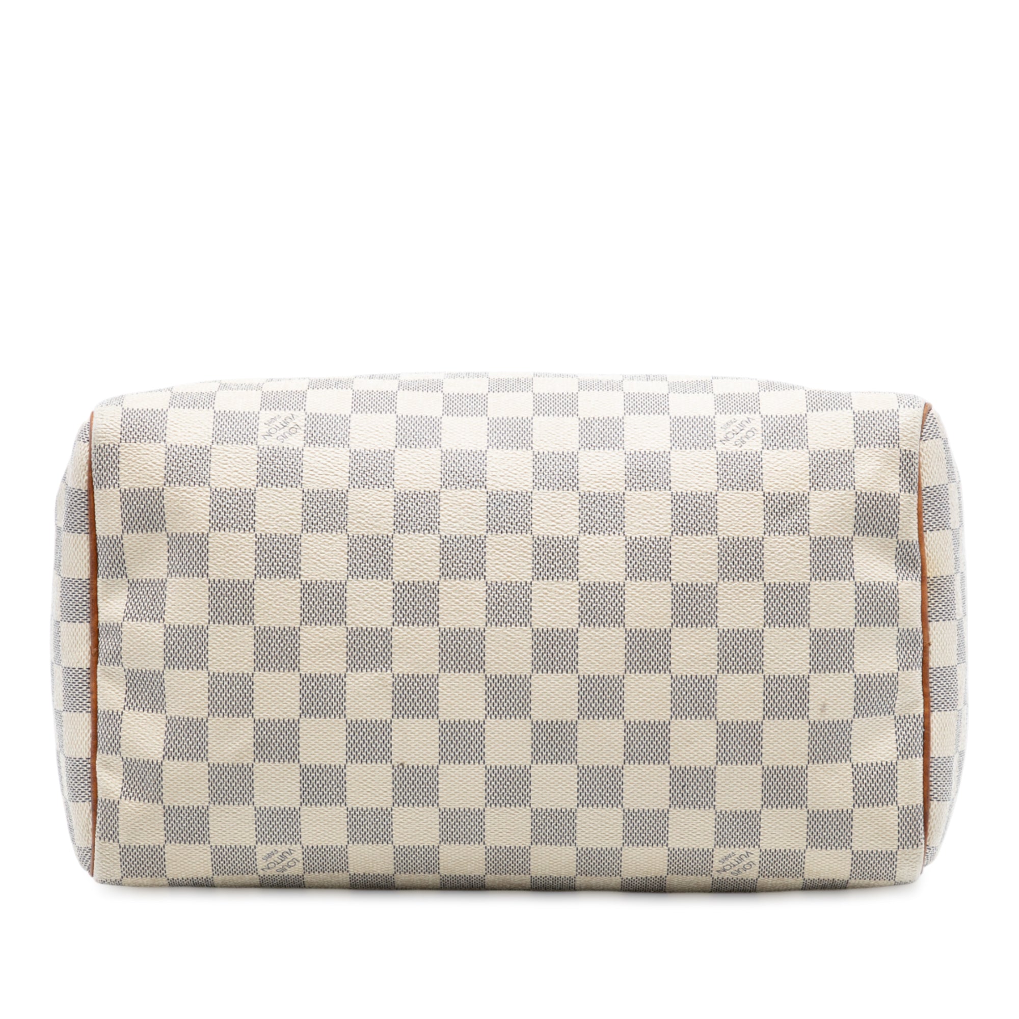 Product Details: White Louis Vuitton Damier Azur Speedy 30 Boston Bag. The Speedy 30 features a damier canvas body with vachetta leather trim, rolled vachetta leather handles, a top zip closure, and an interior pocket. 8.7" L x 12" W x 6.9" D, 3.9" drop. Serial number SP1026.