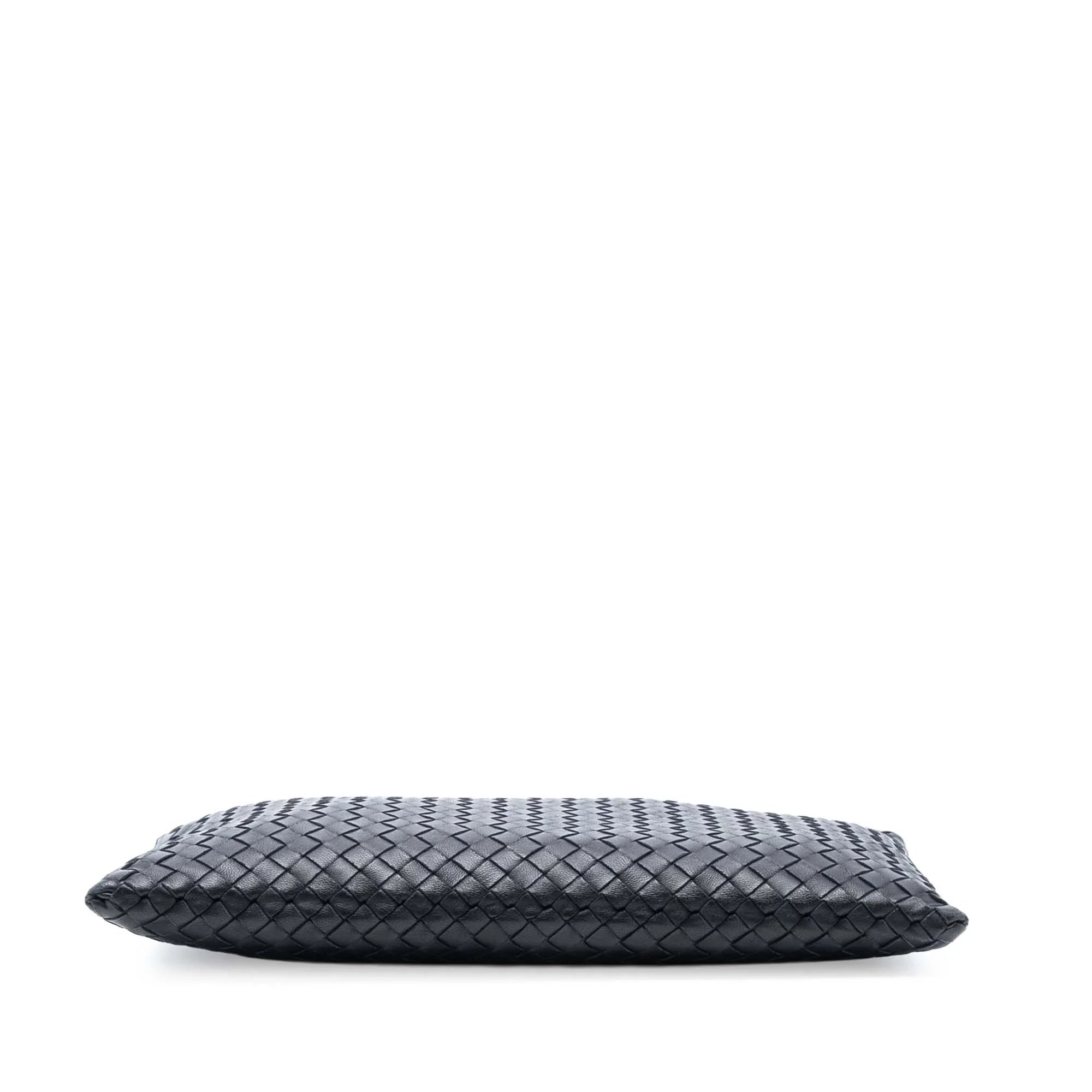 Product Details: Black Bottega Veneta Nappa Intrecciato Clutch. This clutch bag features a woven leather body, and a top zip closure. 7.5" L x 11.6" W x 0.6" D. Serial number B06248615L.