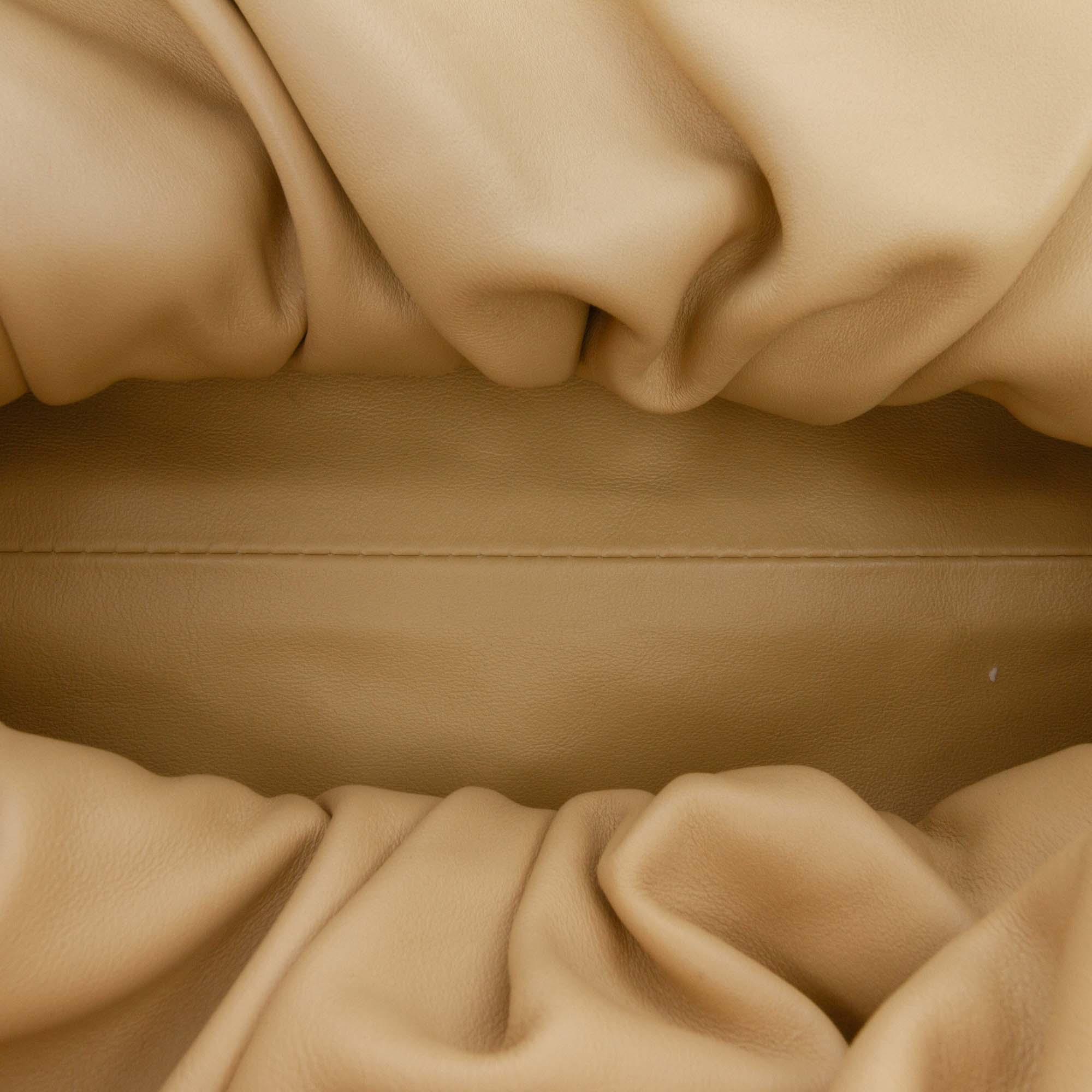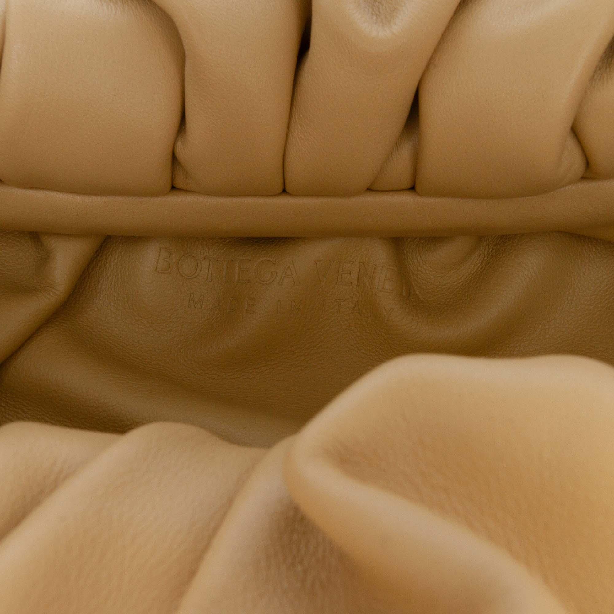 Product Details: Brown Bottega Veneta Lambskin The Shoulder Pouch. The Shoulder Pouch features a leather body, a leather handle, and a magnetic frame closure. 6.7" L x 12.2" W x 4.3" D. Serial number B08786914E.