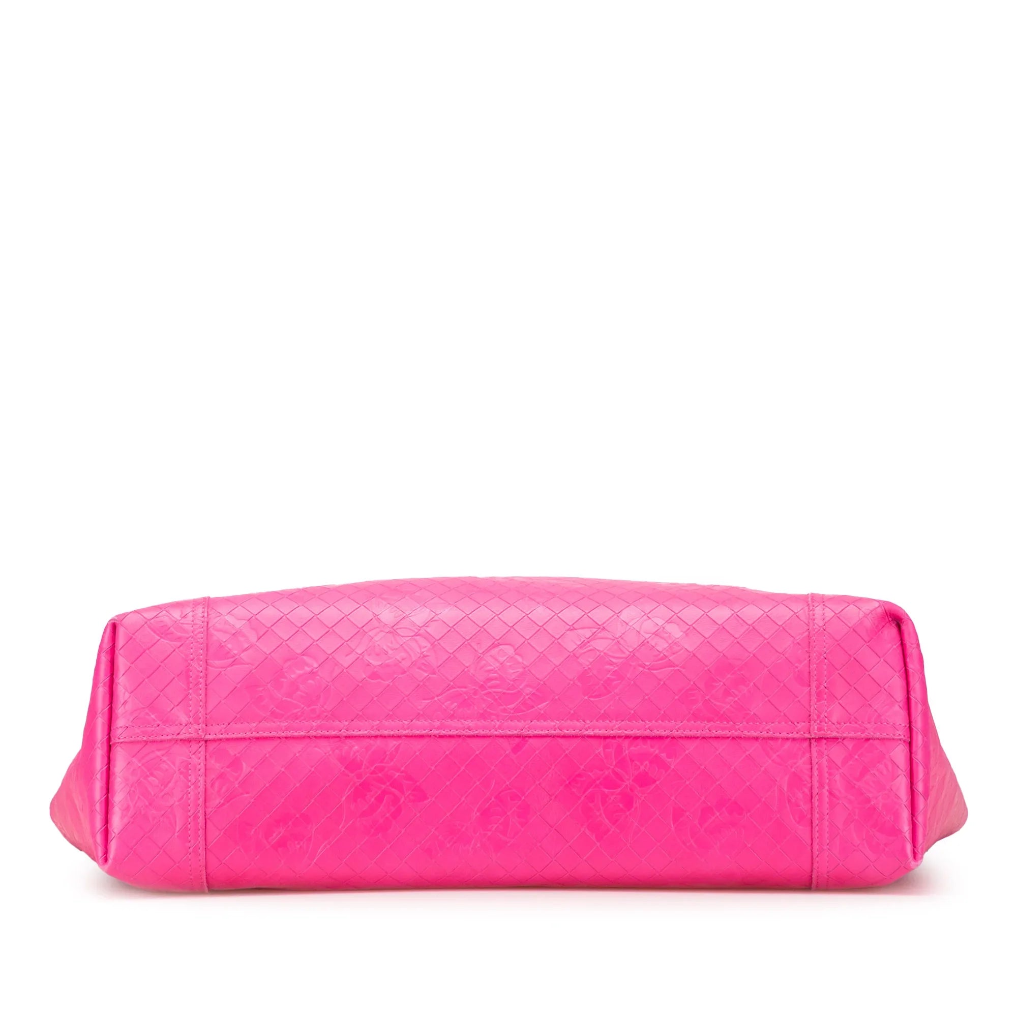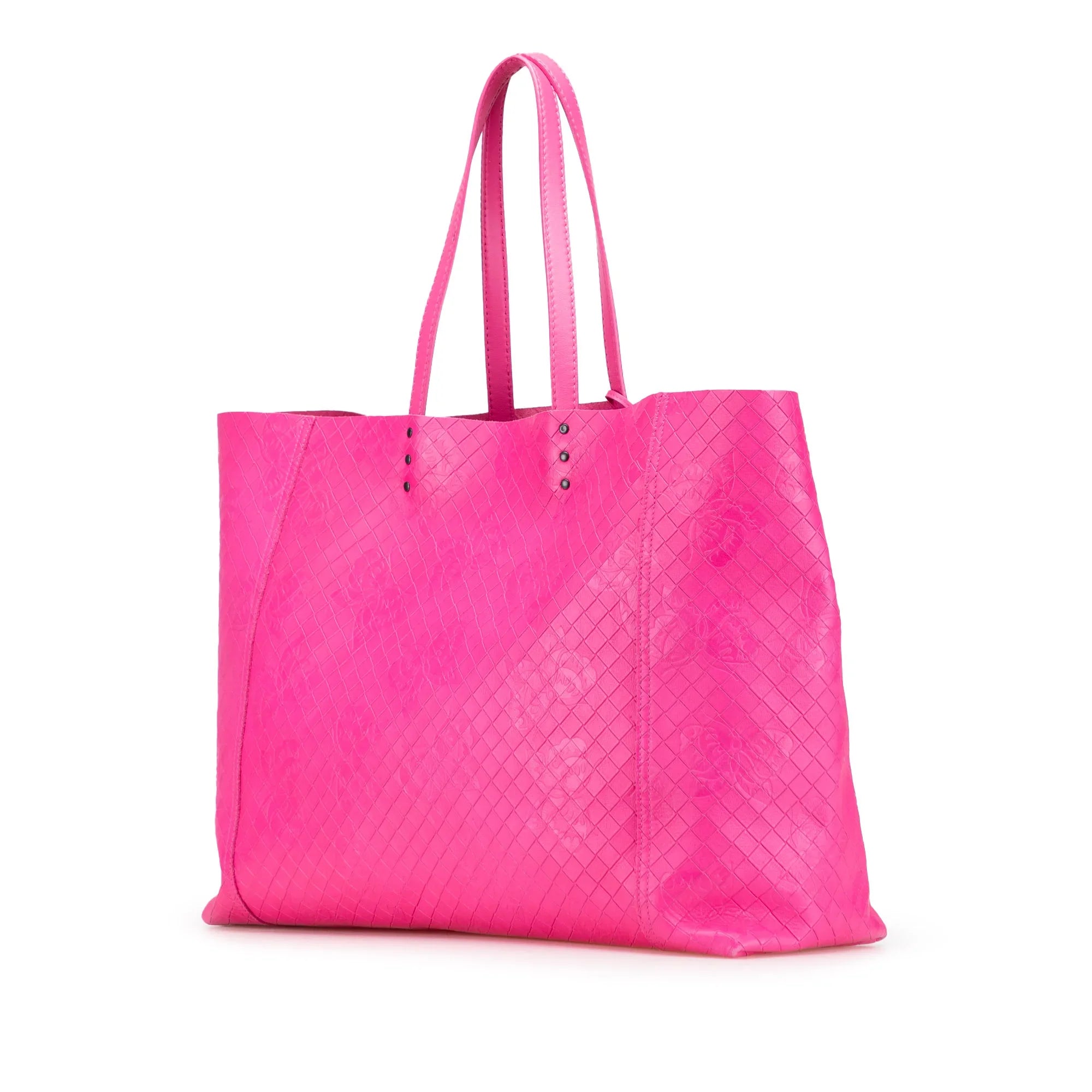 Product Details: Pink Bottega Veneta Leather Intrecciomirage Butterfly Tote. This tote bag features an embossed leather body, flat leather shoulder straps, and an open top. 11.8" L x 15.4" W x 4.7" D, 7.9" drop. Serial number B021628165.