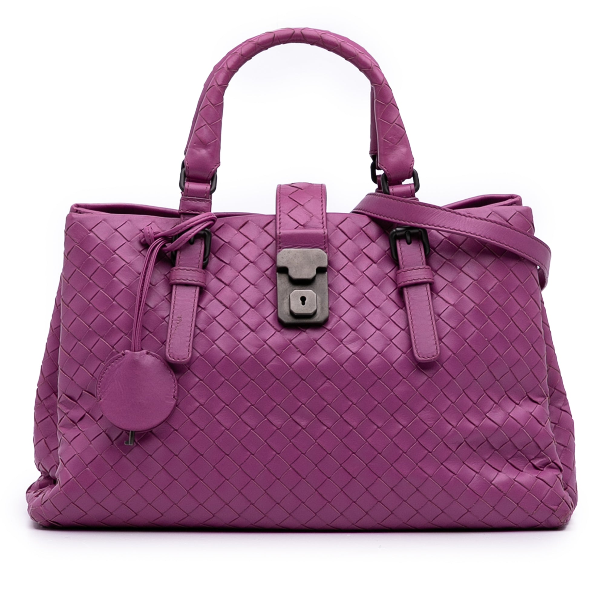 Please note this is a pre-owned item that may display signs of wear consistent with the condition listed above and shown in photos. Designer Revival guarantees this is an authentic Purple Bottega Veneta Small Nappa Intrecciato Roma Satchel or 100% of your money back. Learn more about our authentication process.