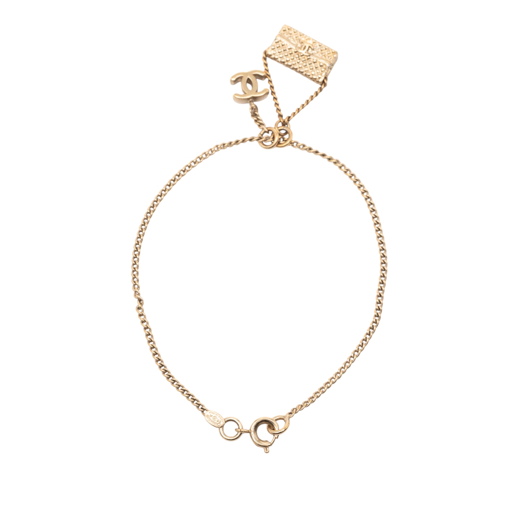 Product Details: Gold Chanel CC Gold Plated Flap Charm Bracelet. This bracelet features a flap bag and CC pendant, a gold-tone chain, and a spring ring closure. 6.9" L x 2.1" W x 0" D.