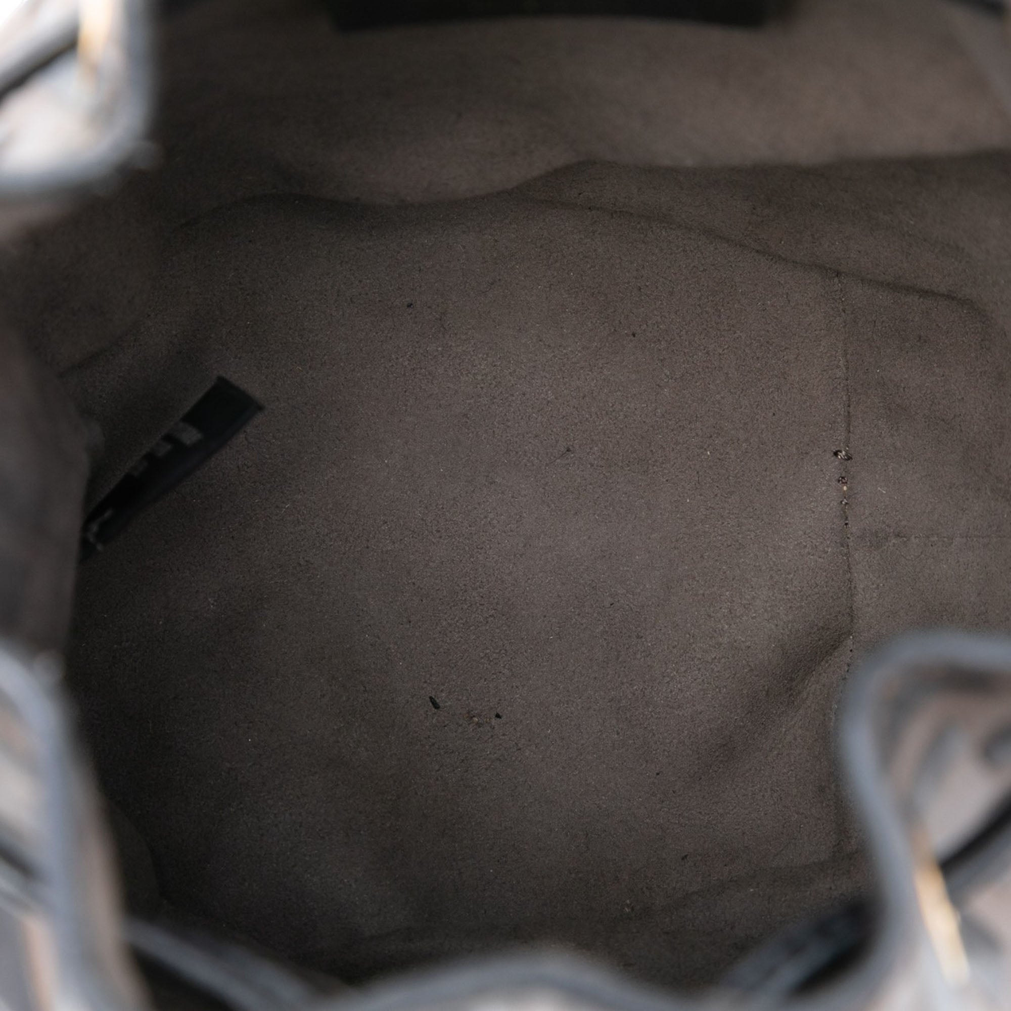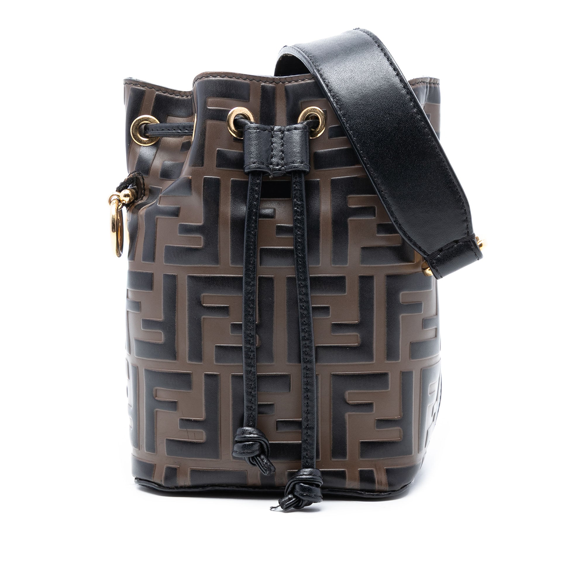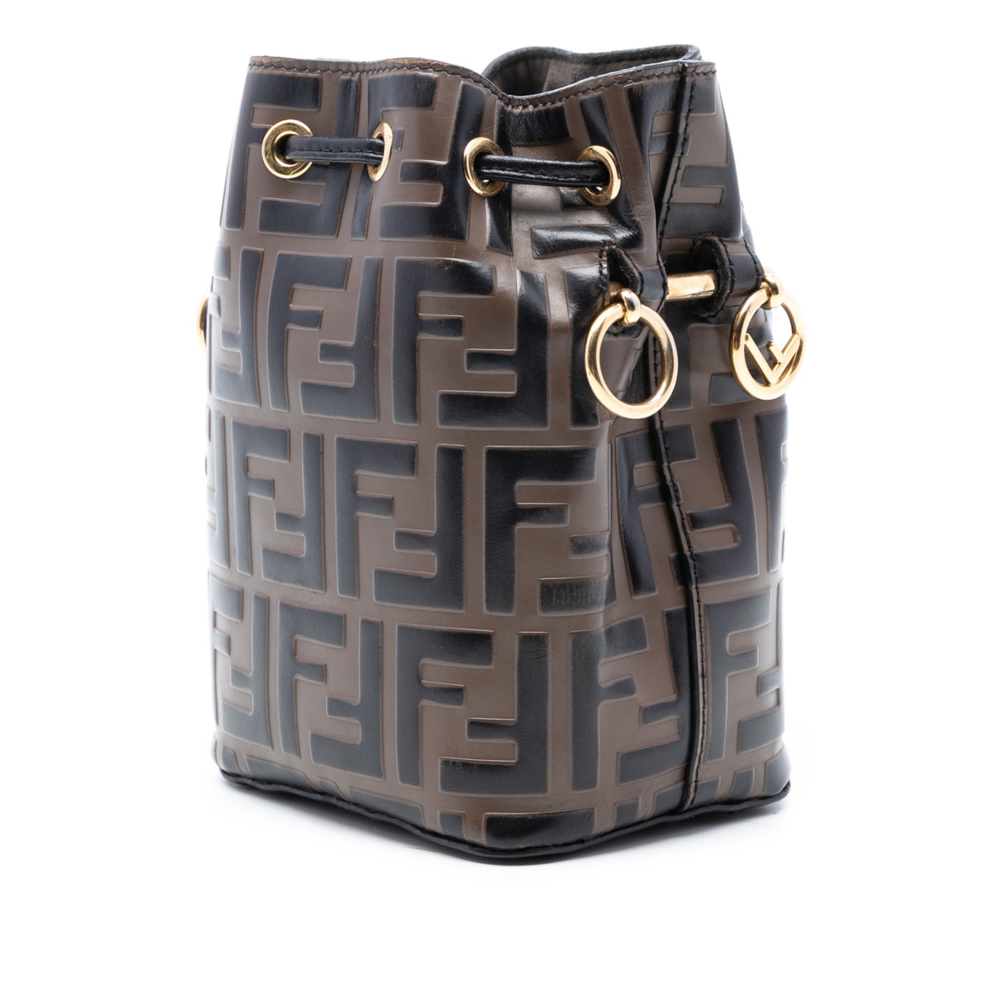 Product Details: Brown Fendi Mini Zucca Embossed Leather Mon Tresor Bucket Bag Satchel. The Mon Tresor features an embossed leather body, a detachable flat leather top handle, and an open top with a drawstring closure. 6.9" L x 4.7" W x 3.9" D, 5.1" drop. Serial number 8BS010 A659 198-8241.