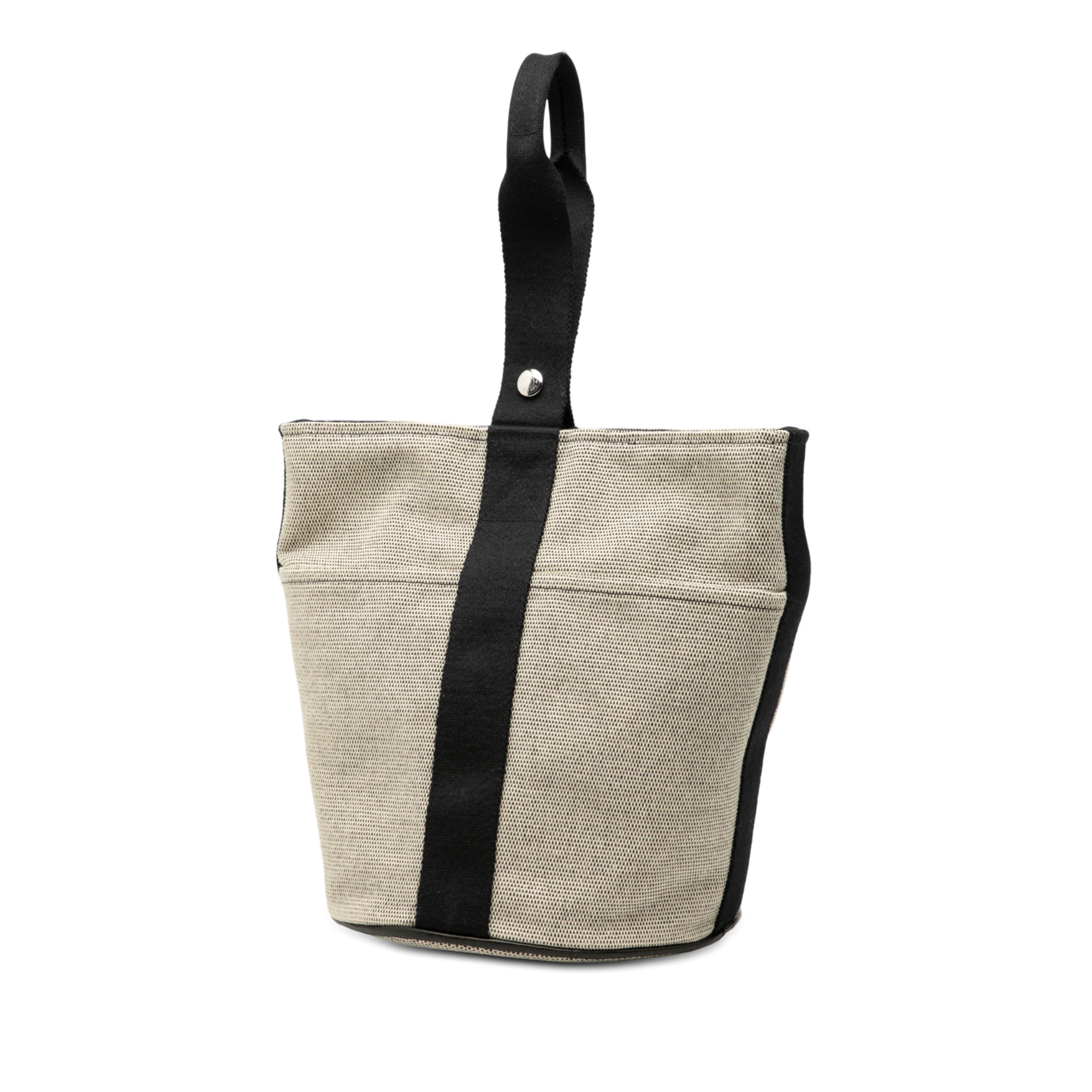 Product Details: Brown Hermès Toile Saxo MM Bucket Bag. The Saxo MM features a canvas body, exterior front and back slip pockets, a flat strap, an open top with a magnetic snap button closure, and an interior zip pocket. 10.6" L x 8.5" W x 8.3" D, 7.5" drop.