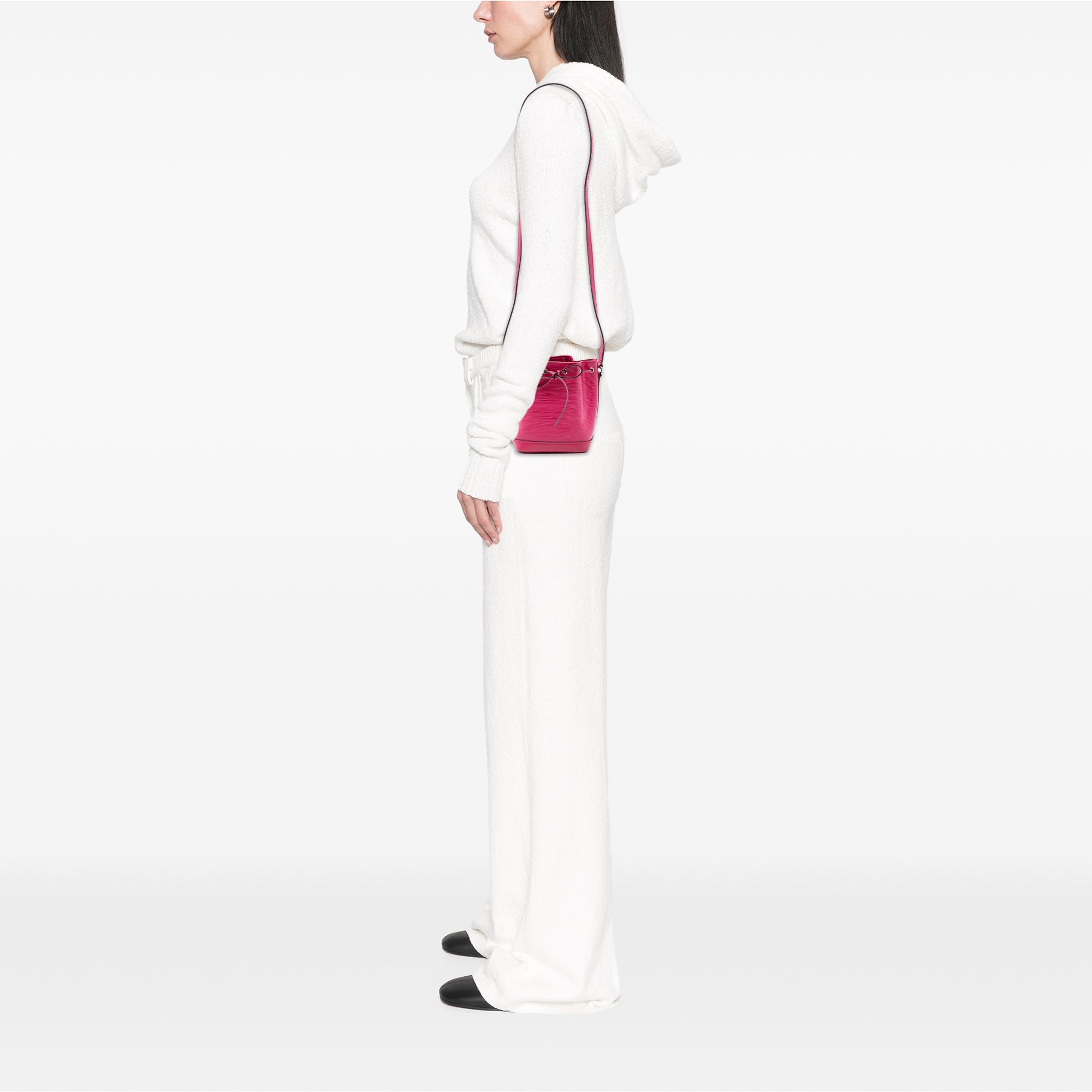 Product Details: Pink Louis Vuitton Epi Nano Noe Bucket Bag. The Nano Noe features an epi leather body, an adjustable flat leather shoulder strap, and an open top with a drawstring closure. 6.5" L x 5.1" W x 3.7" D. Serial number AR0186.