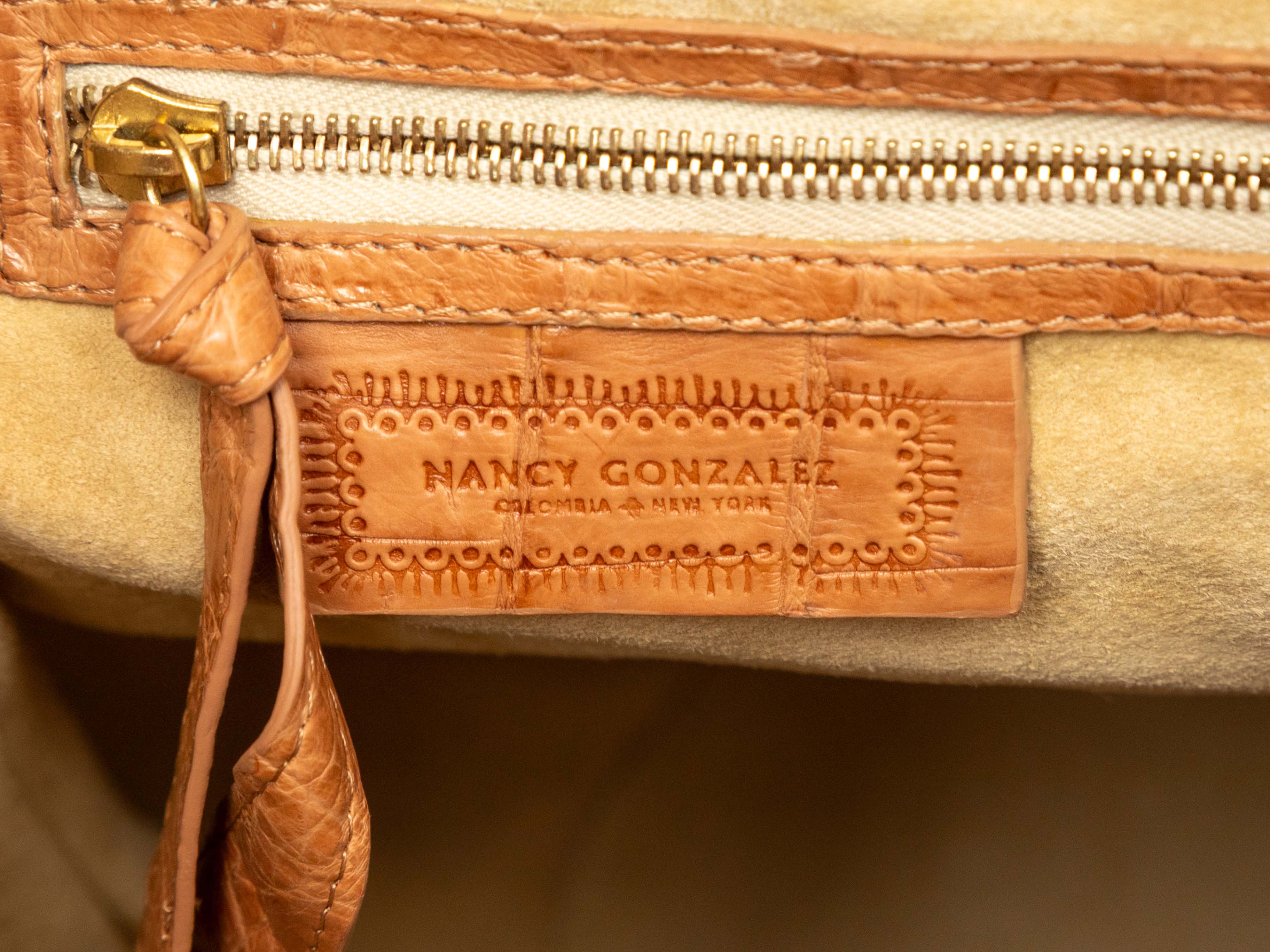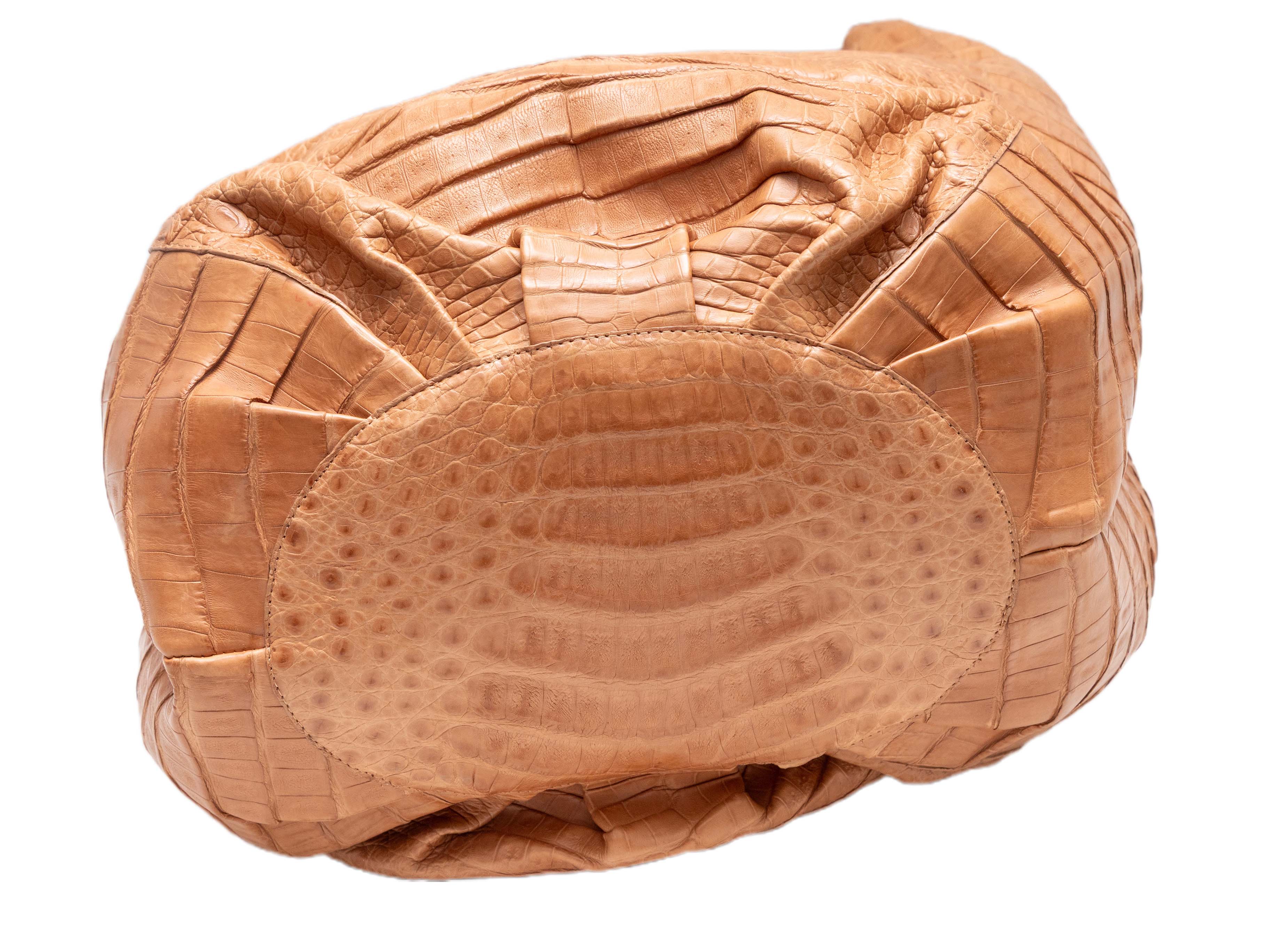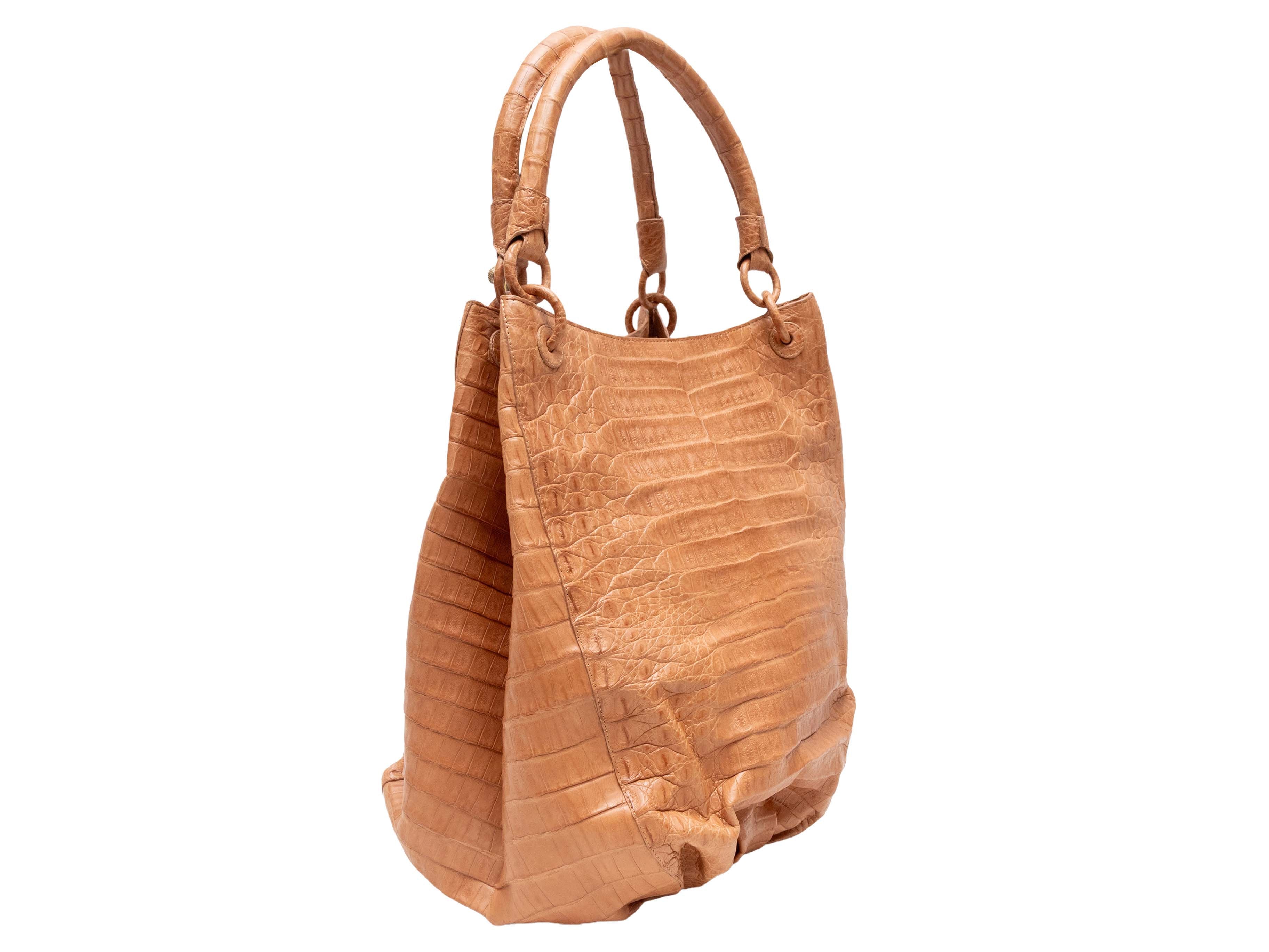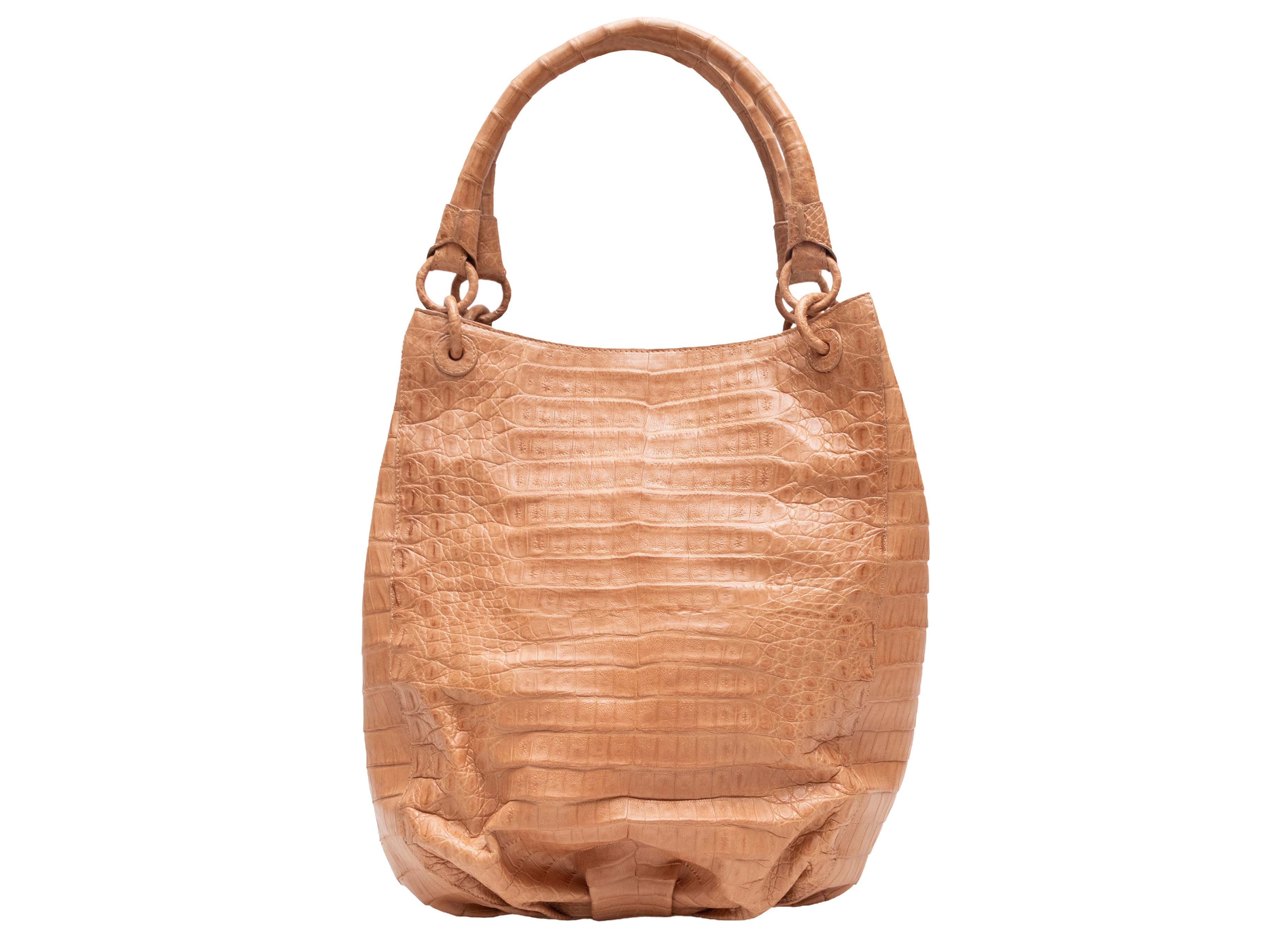 Product Details: Tan Nancy Gonzalez Large Crocodile Bucket Bag. This bucket bag features a crocodile body, covered hardware, and dual top handles. 10.5" L x 13" H x 6" D, 7" handle drop.