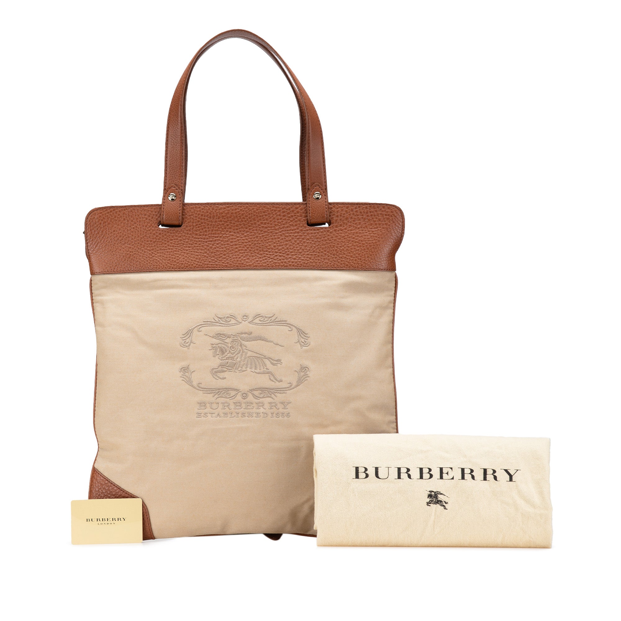 Product Details: Brown Burberry Canvas Stowell Roll Up Tote. This tote bag features a canvas body with leather trim, flat leather handles, a top zip closure, and interior zip and slip pockets. 16.1" L x 15" W x 0.4" D. Serial number CNQINCHOQIN.