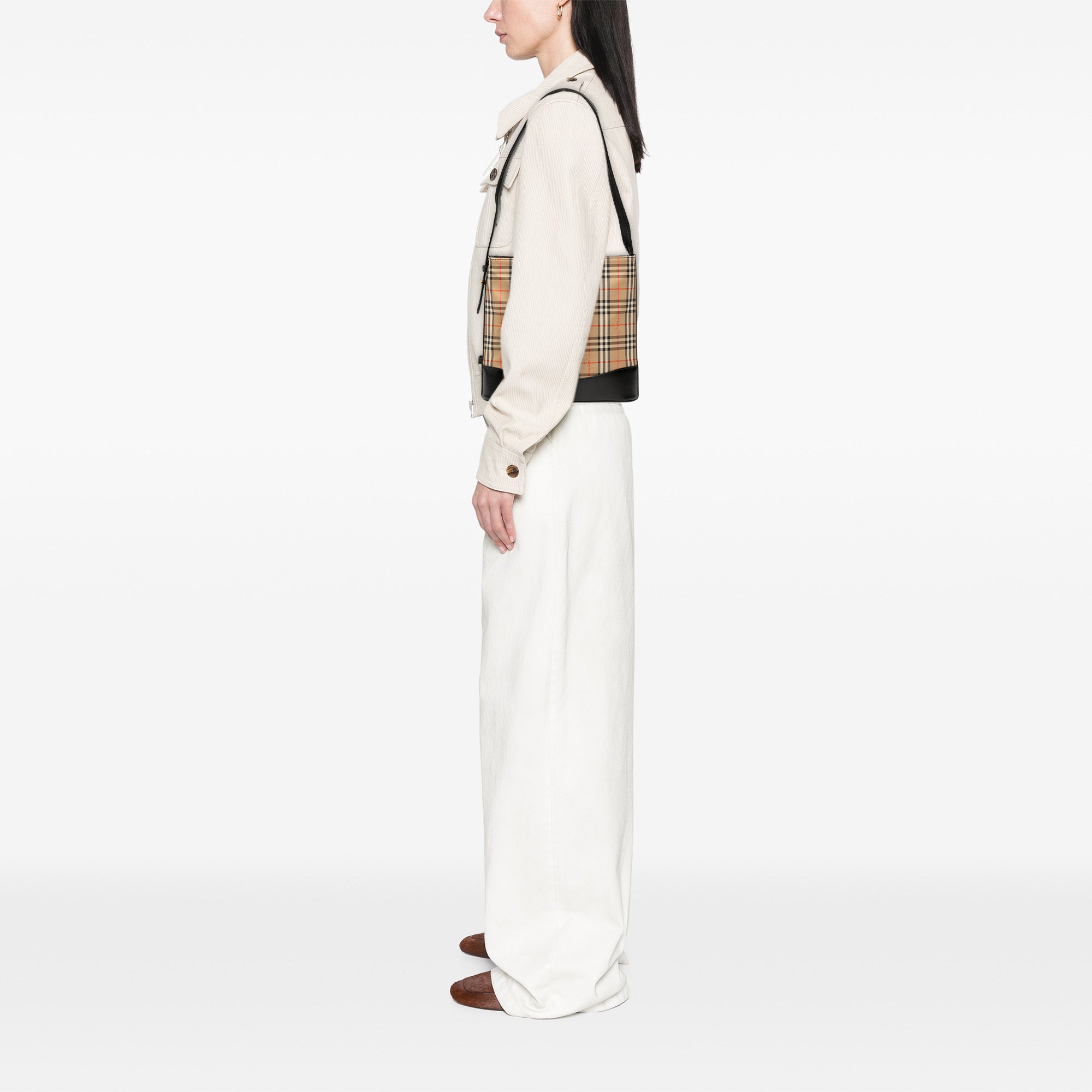Product Details: Brown Burberry Haymarket Check Canvas Shoulder Bag. This shoulder bag features a haymarket check canvas body with leather trim, a flat leather strap, a top zip closure, an exterior zip pocket, and interior zip and slip pockets. 9.4" L x 10.2" W x 3.1" D.