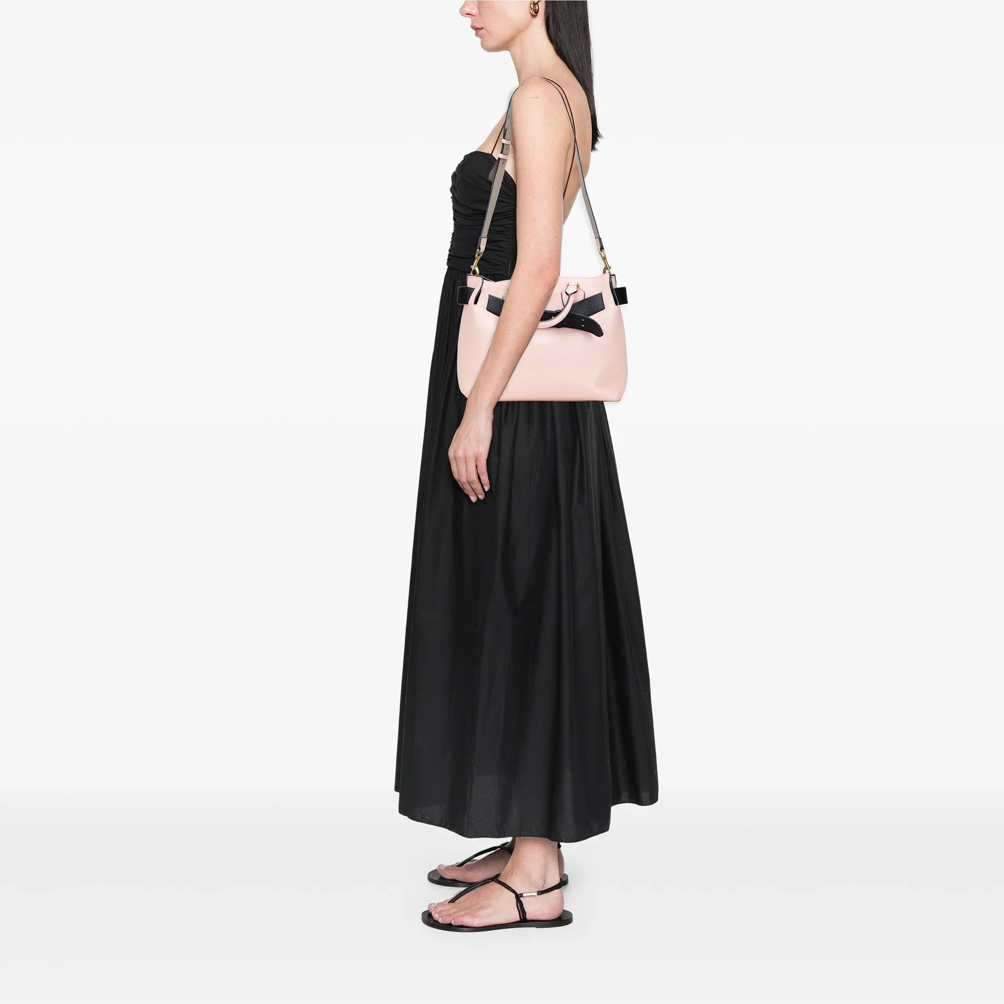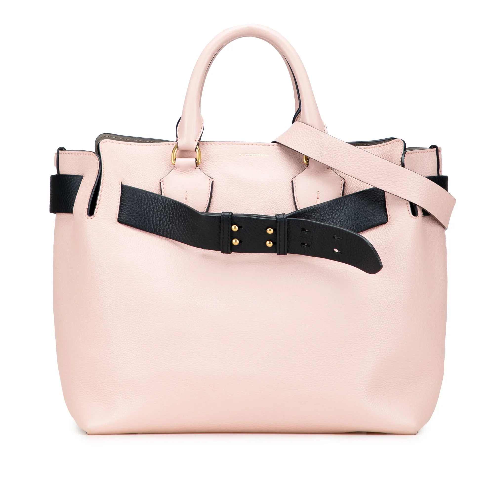 Product Details: Pink Burberry Medium Bicolor Leather Marais Belt Bag Satchel. The Belt Satchel features a leather body, rolled leather top handles, a detachable and adjustable flat leather shoulder strap, an open top, and interior slip pockets. 11.8" L x 12.8" W x 6.7" D, 4.1" drop.