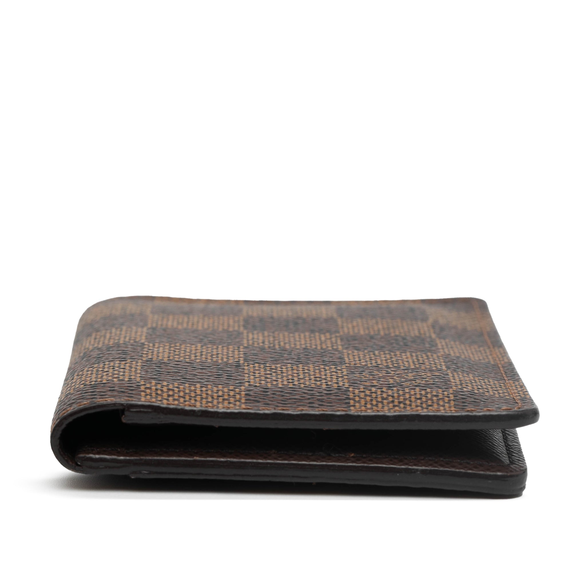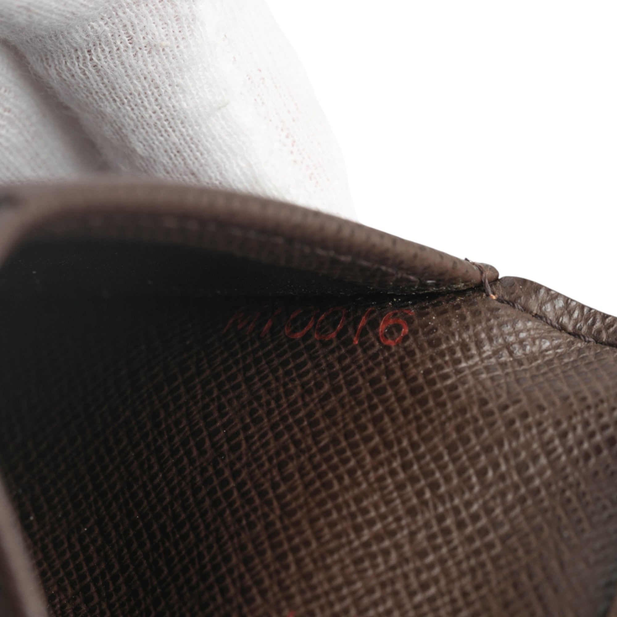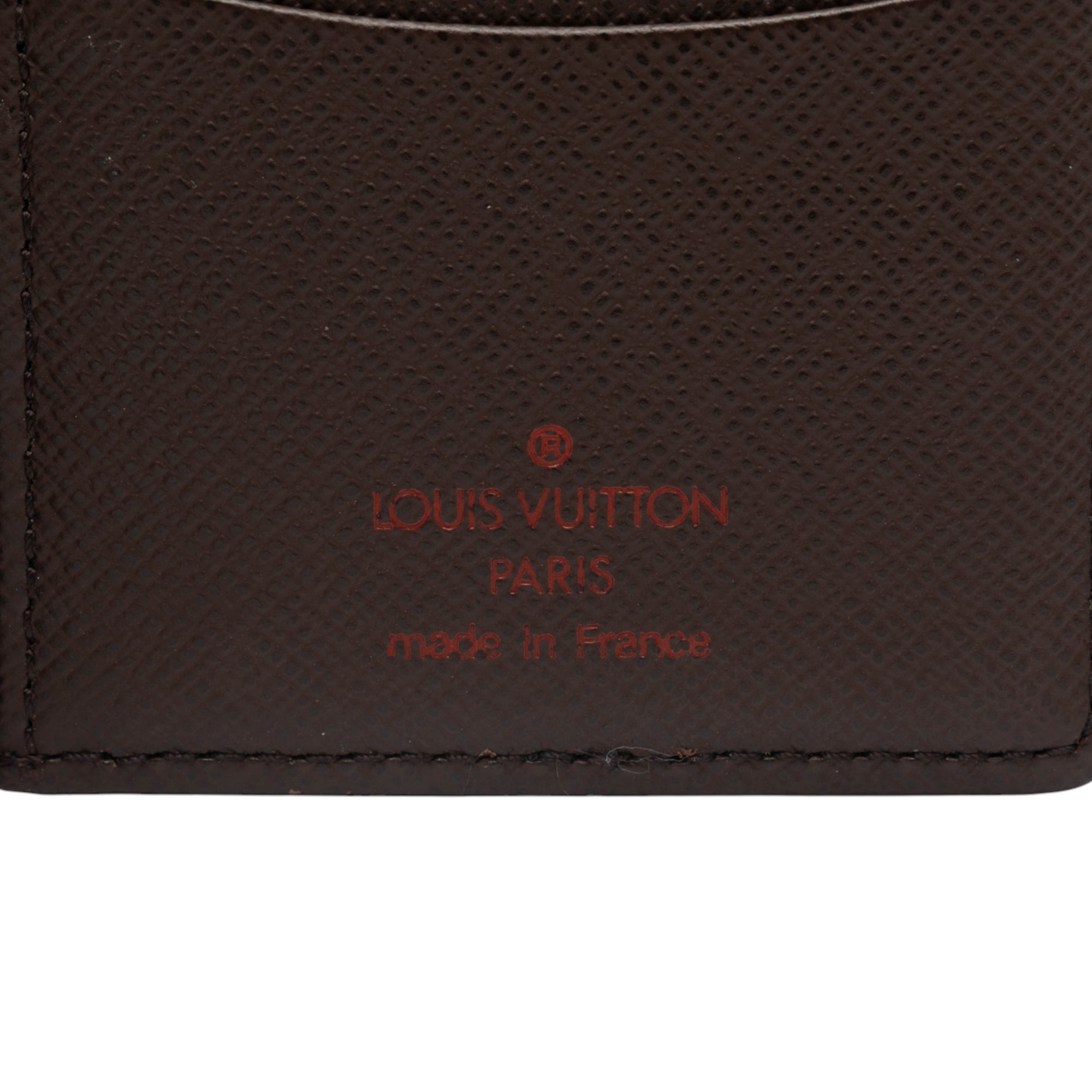 Product Details: Brown Louis Vuitton Damier Ebene Pocket Organizer Card Holder. This card holder features a damier ebene canvas body, a front flap, an exterior back slip pocket, and interior slip compartments. 4.3" L x 3" W x 0.4" D. Serial number MI0016.