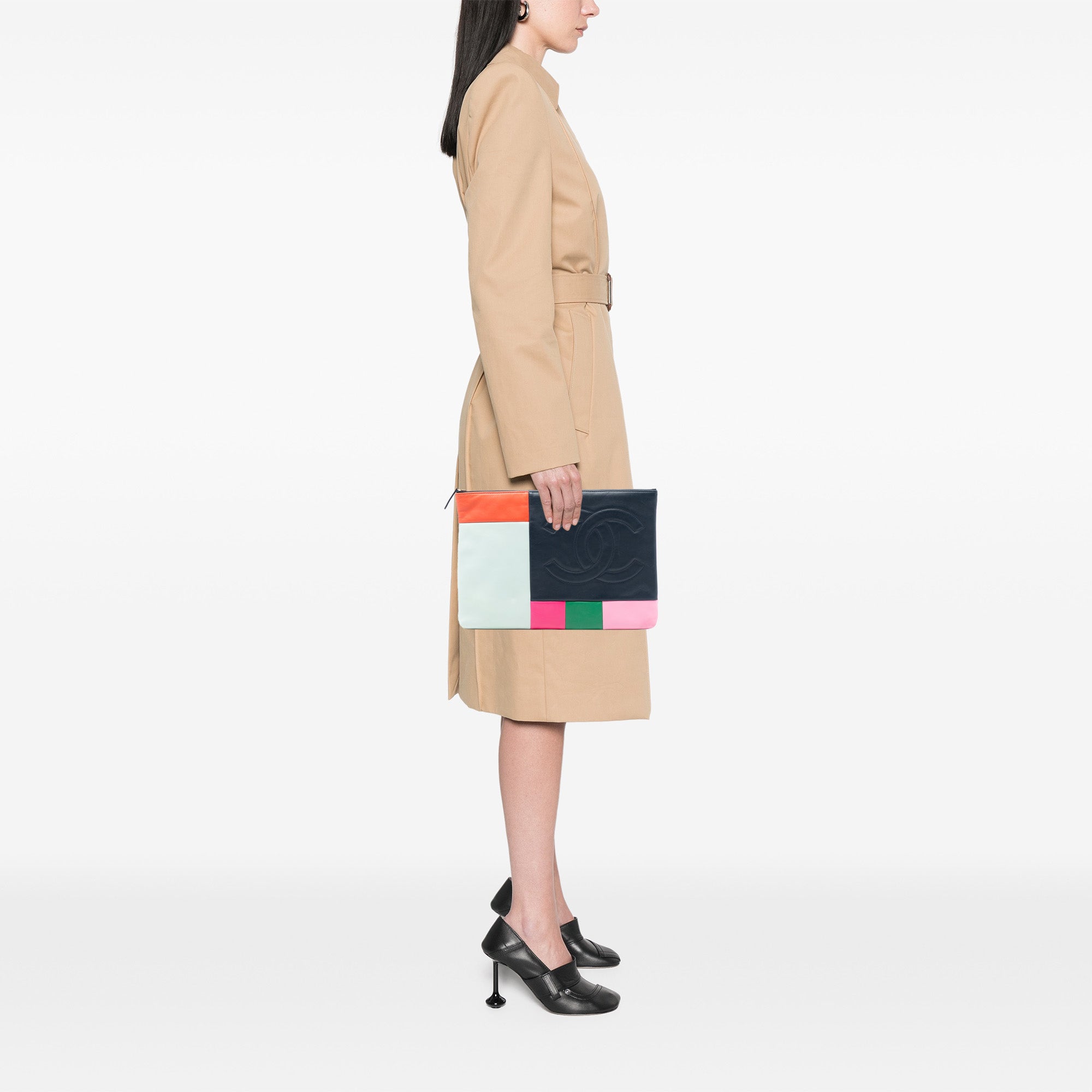 Please note this is a pre-owned item that may display signs of wear consistent with the condition listed above and shown in photos. Designer Revival guarantees this is an authentic Blue Chanel Large Lambskin Colorblock Patchwork O Case Clutch Bag or 100% of your money back. Learn more about our authentication process.