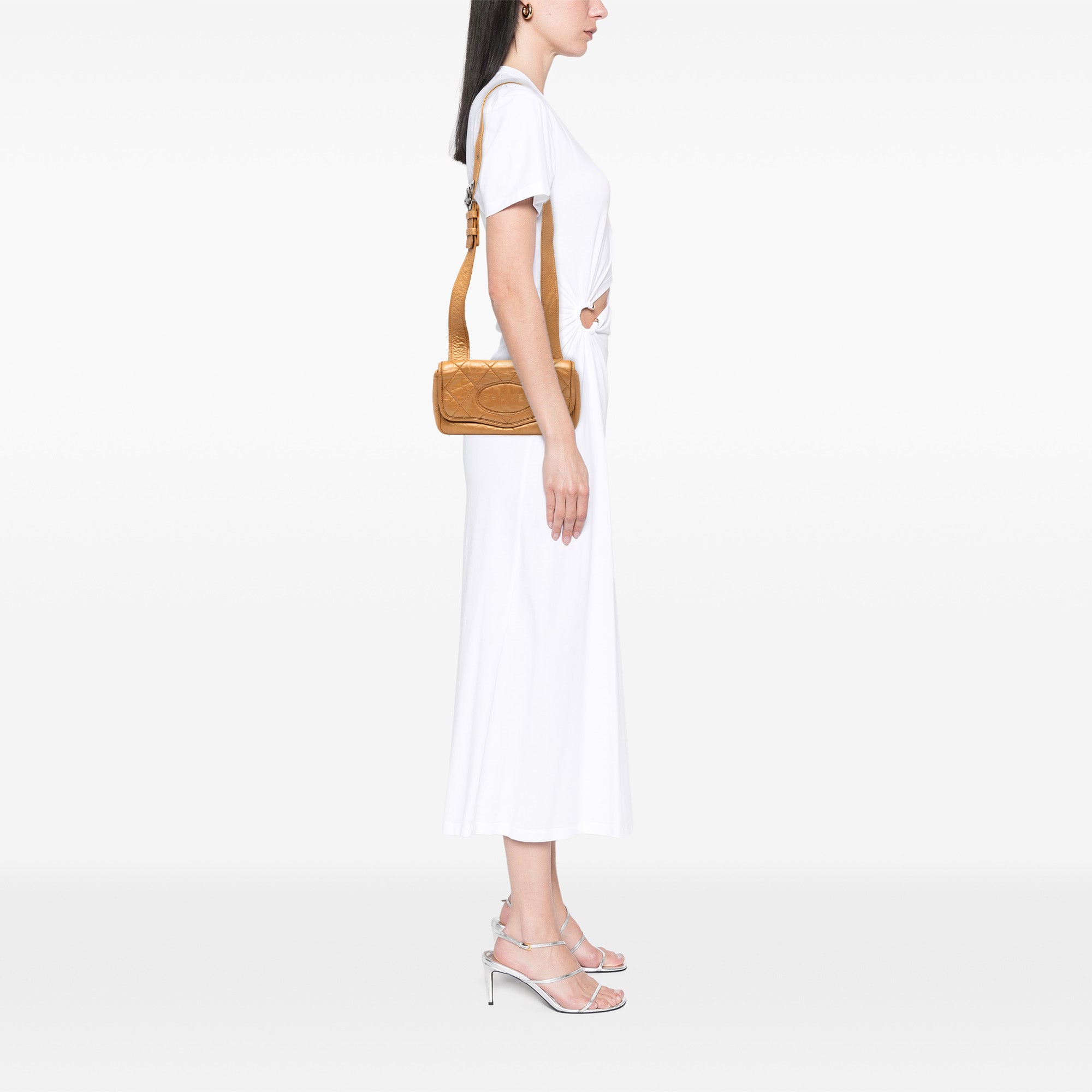 Product Details: Tan Chanel Quilted Aged Calfskin Vintage Ligne Messenger Flap Crossbody Bag. This crossbody bag features a quilted leather body, an adjustable flat leather shoulder strap, a front flap with magnetic snap closure, and an interior slip pocket. 5.1" L x 9.4" W x 2" D. Serial number 10605150.