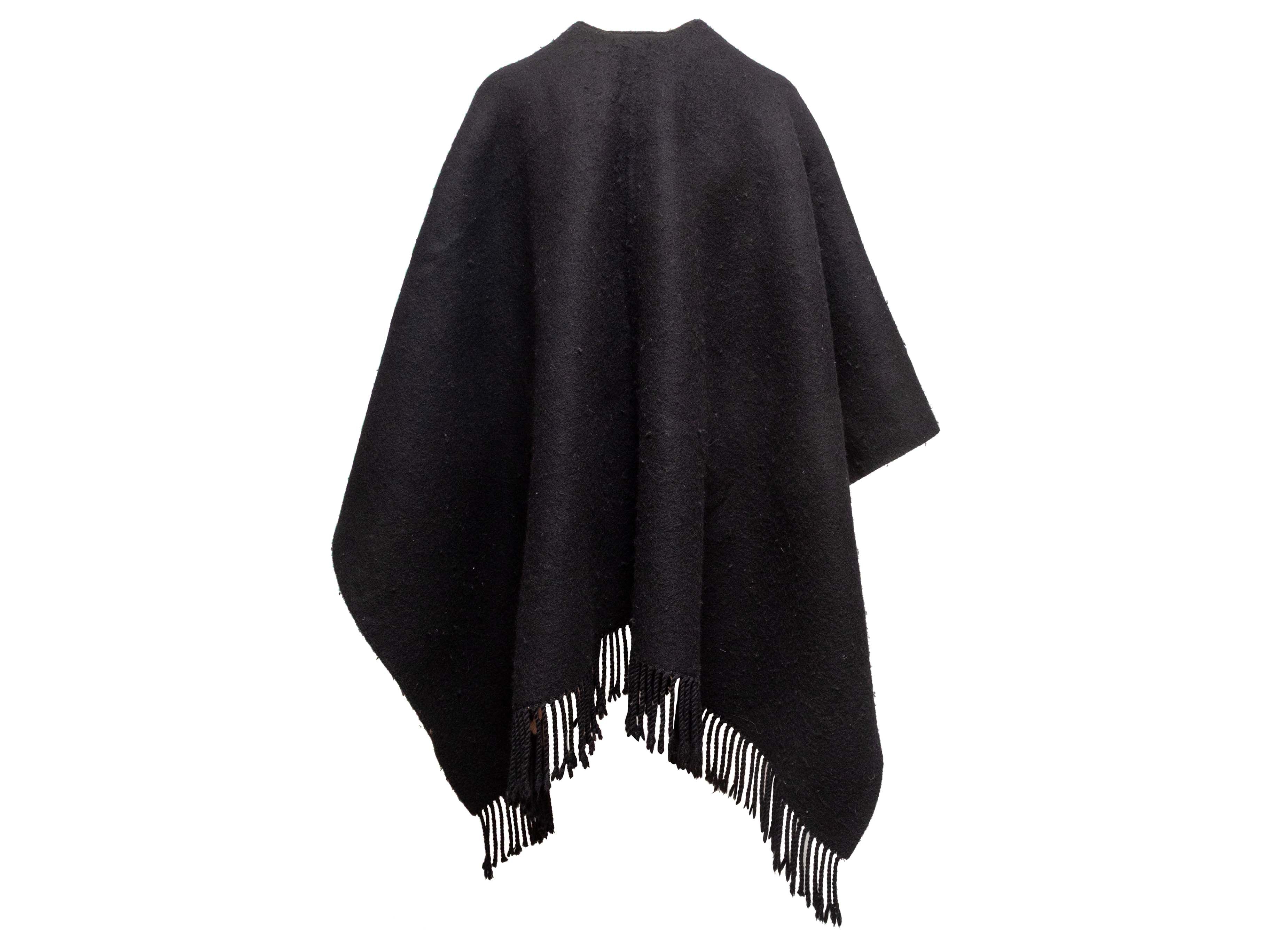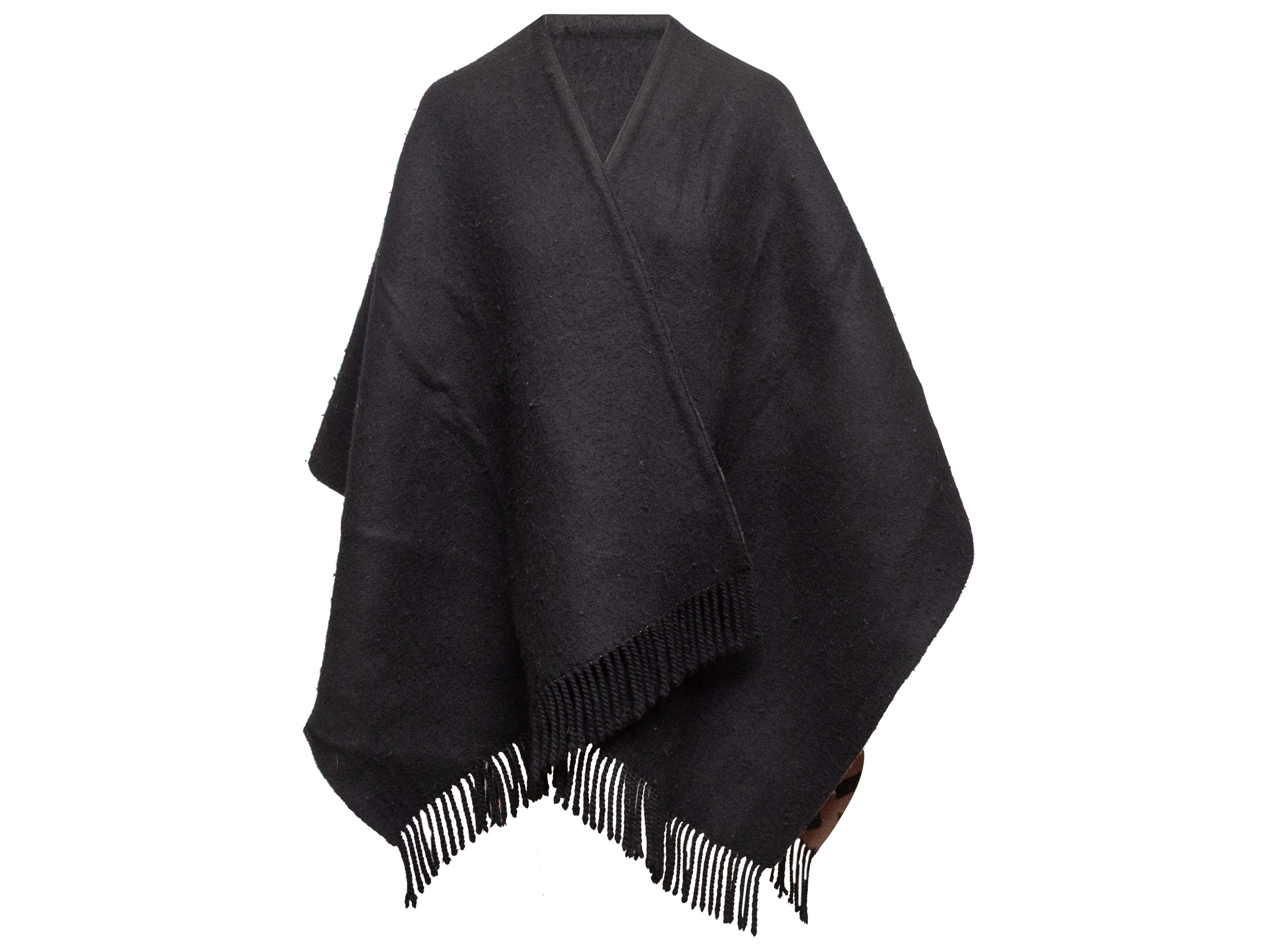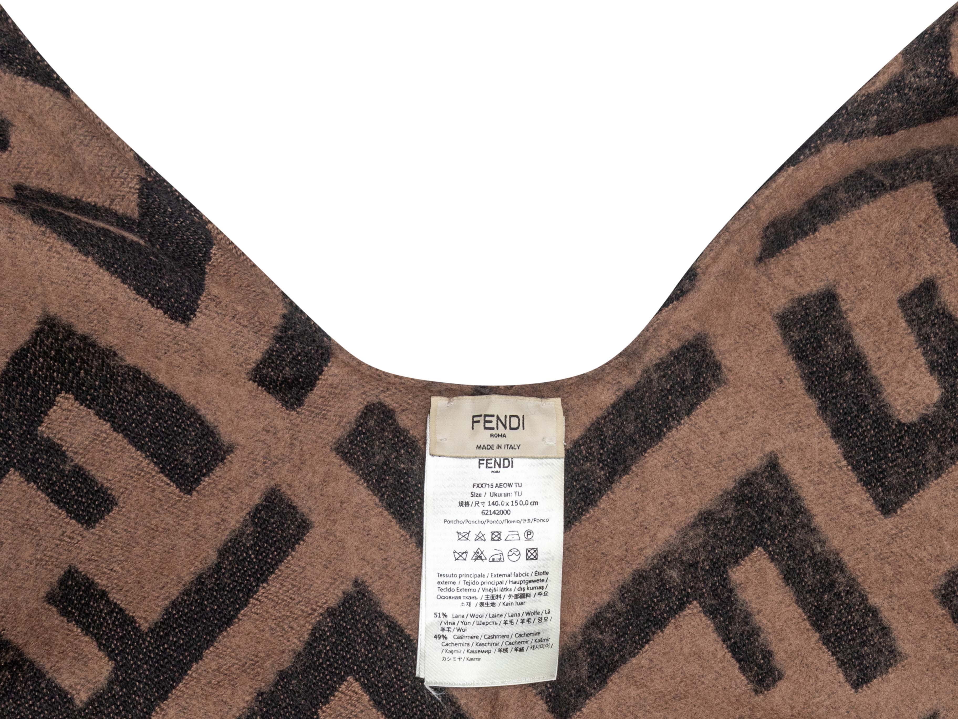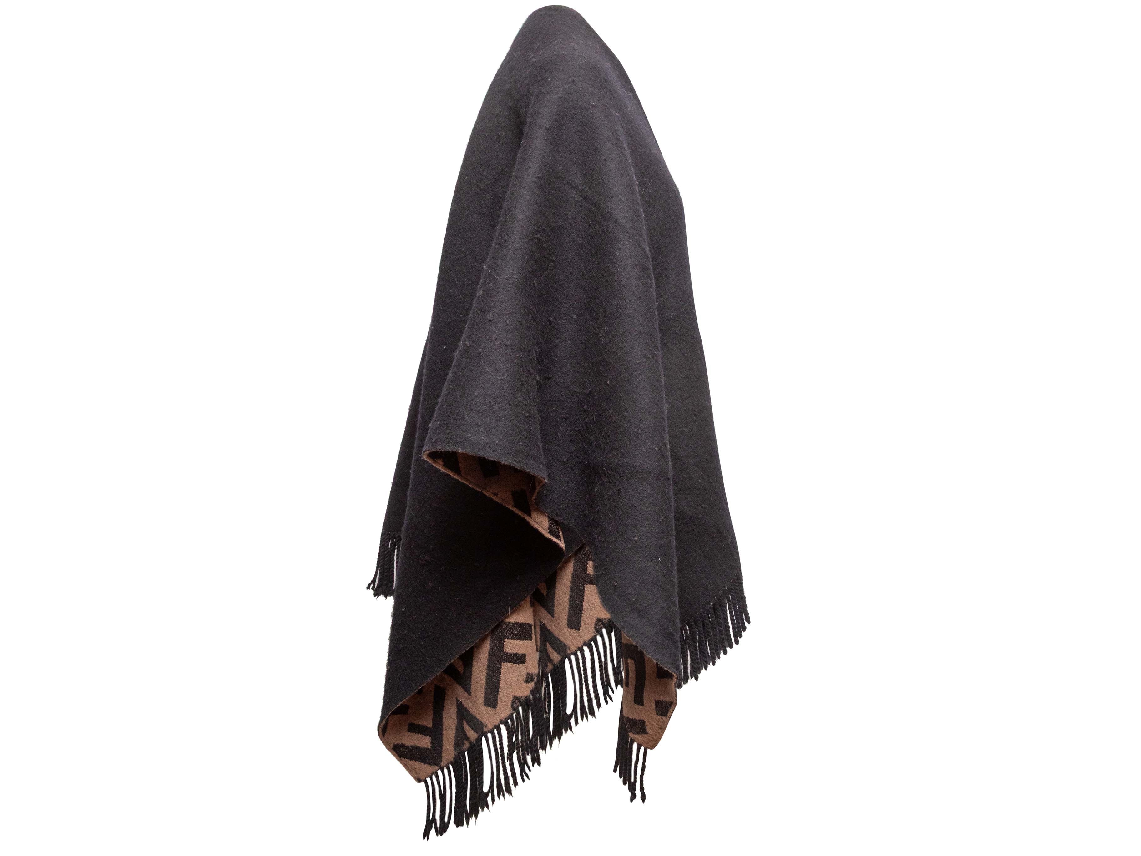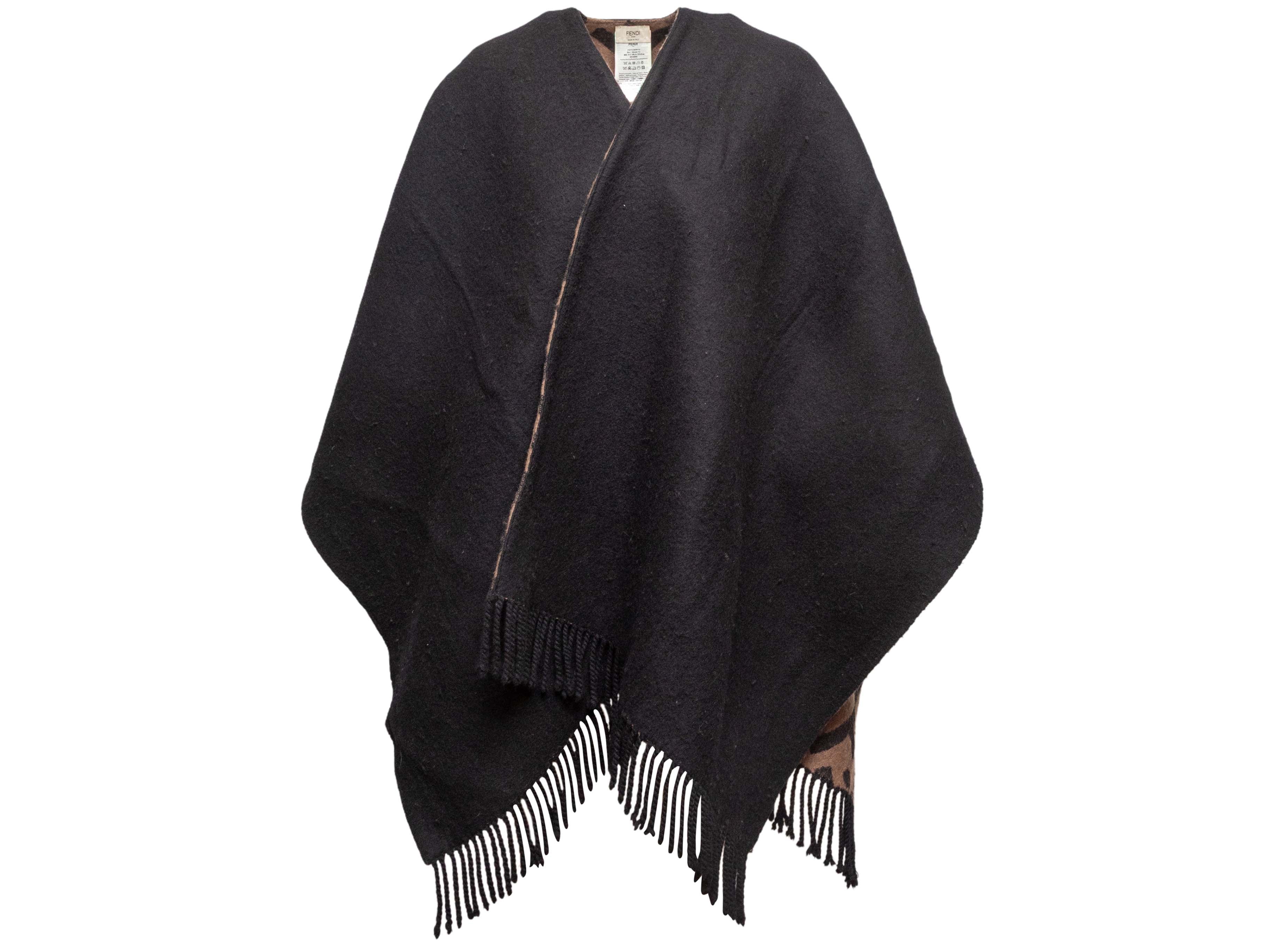 Product Details: Black and brown wool and cashmere-blend large shawl by Fendi. Zucca intarsia pattern at inner side. Fringe trim at ends. 64" bust, 38" length.