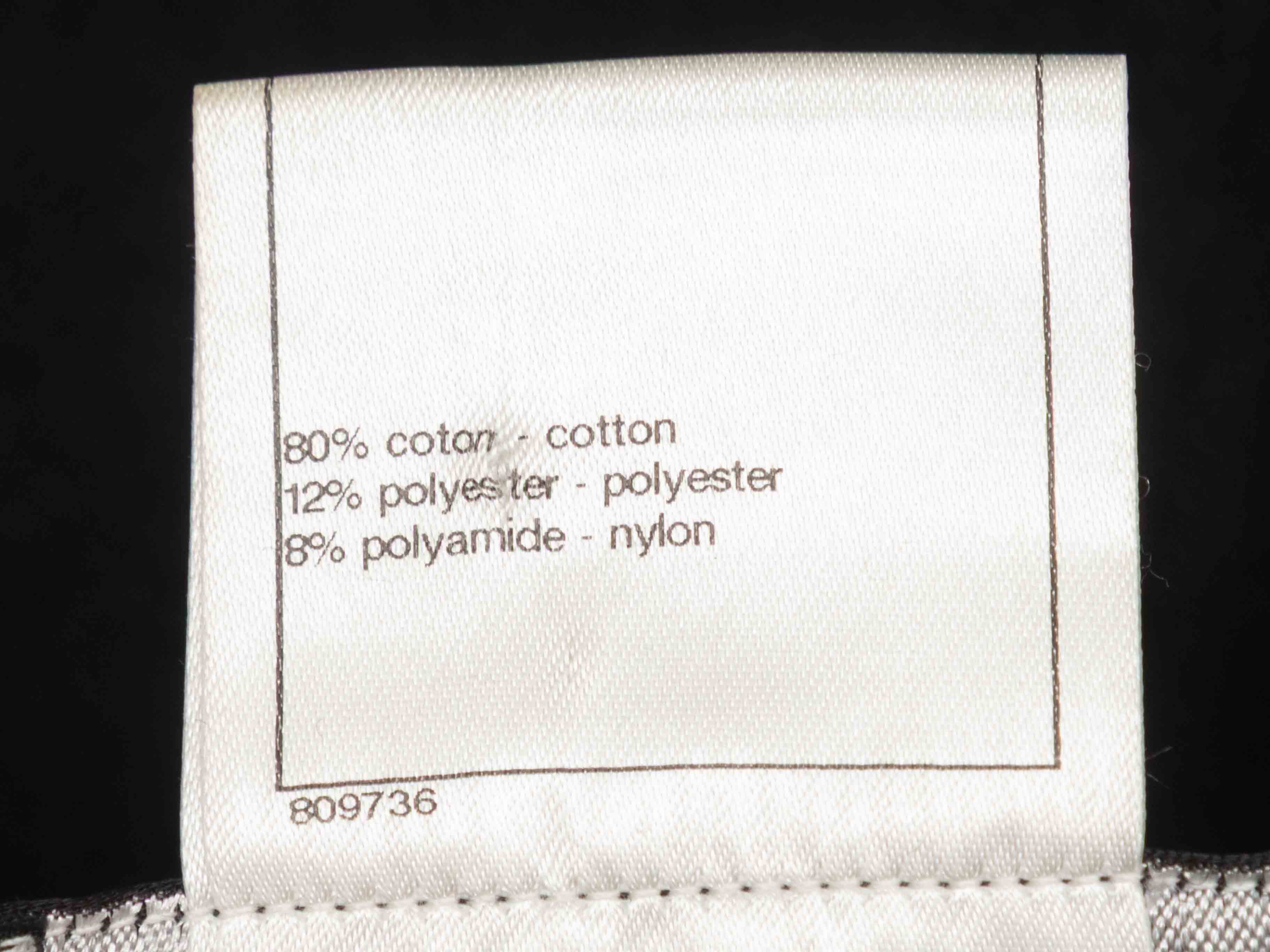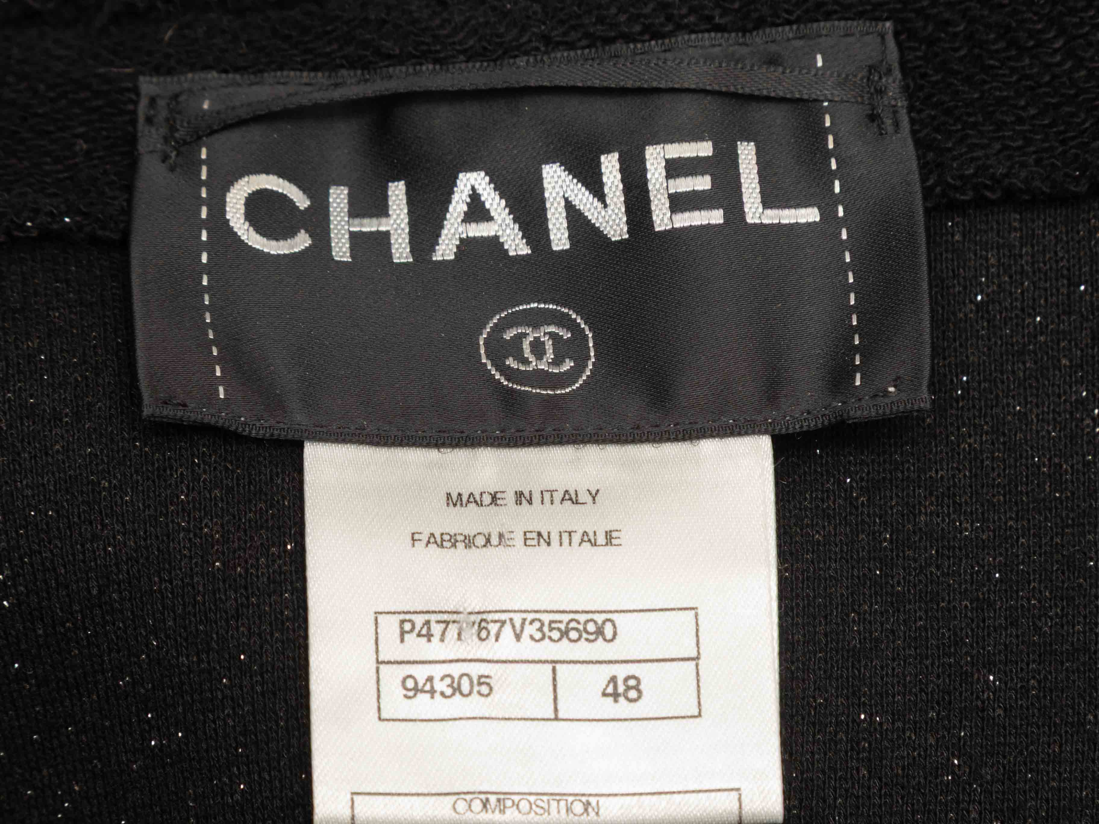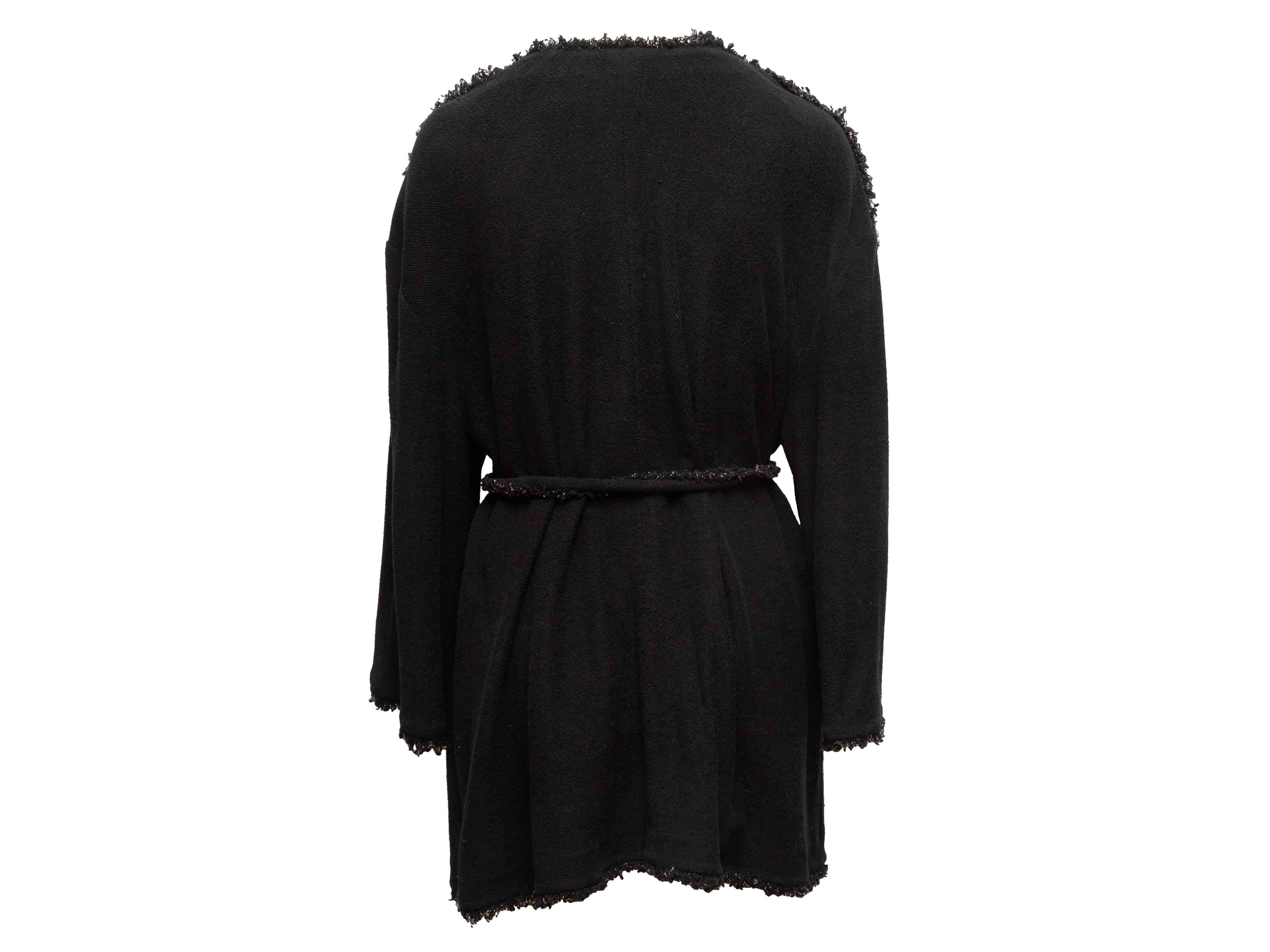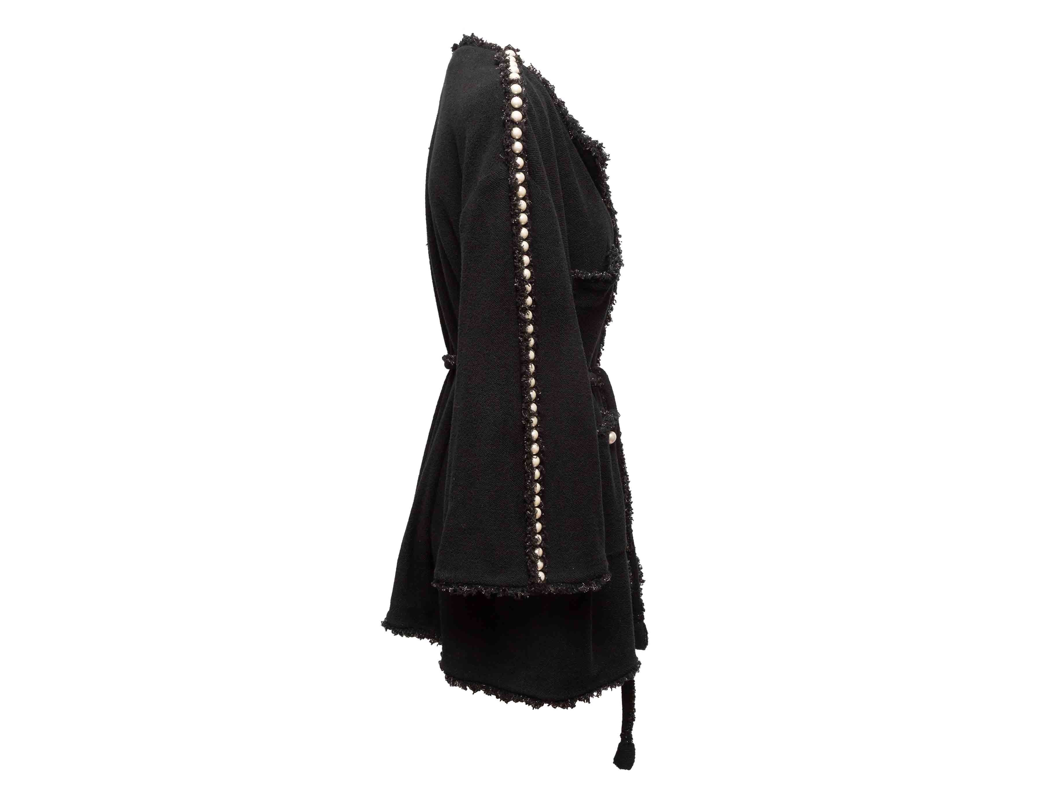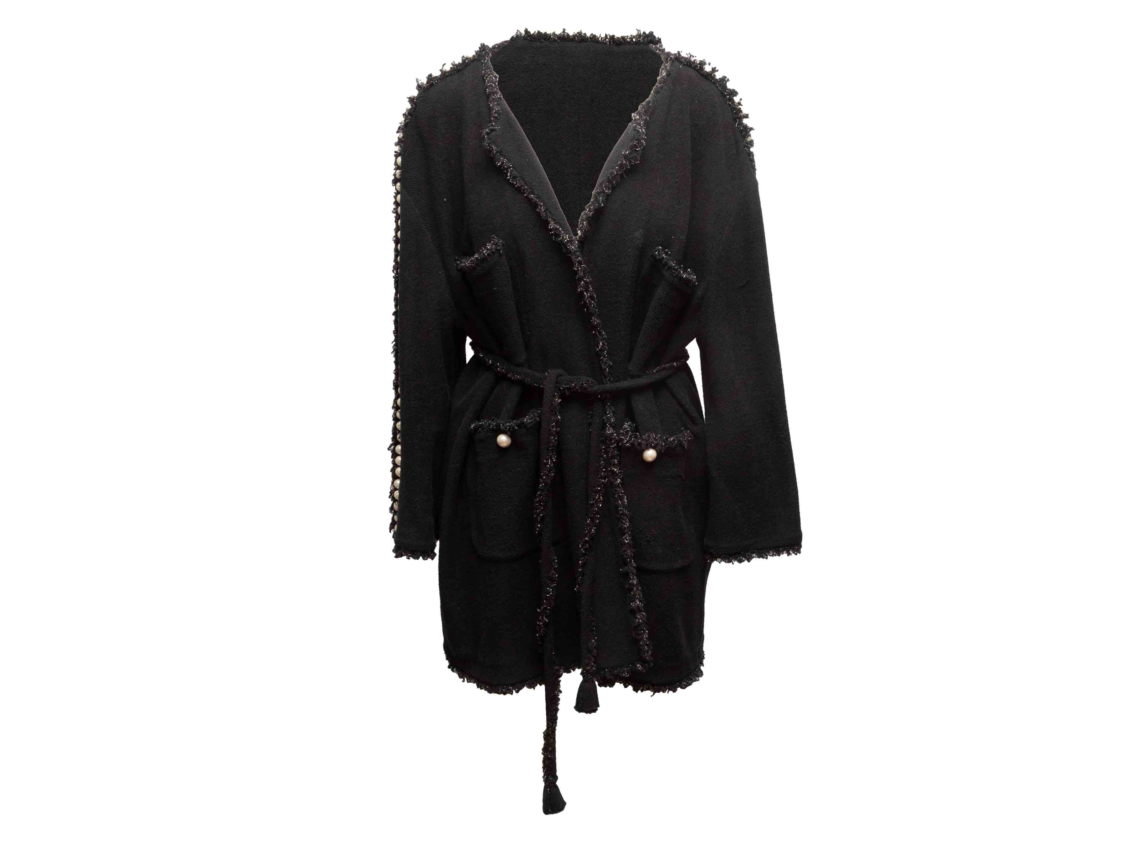 Product Details: Black knit cotton wrap coat by Chanel. Frayed metallic trim throughout. Faux pearl embellishments at sleeves and front pockets. Four front pockets. Sash tie closure at waist. 41" bust, 16.5" shoulder width, 25" sleeve length, 29.5" length.