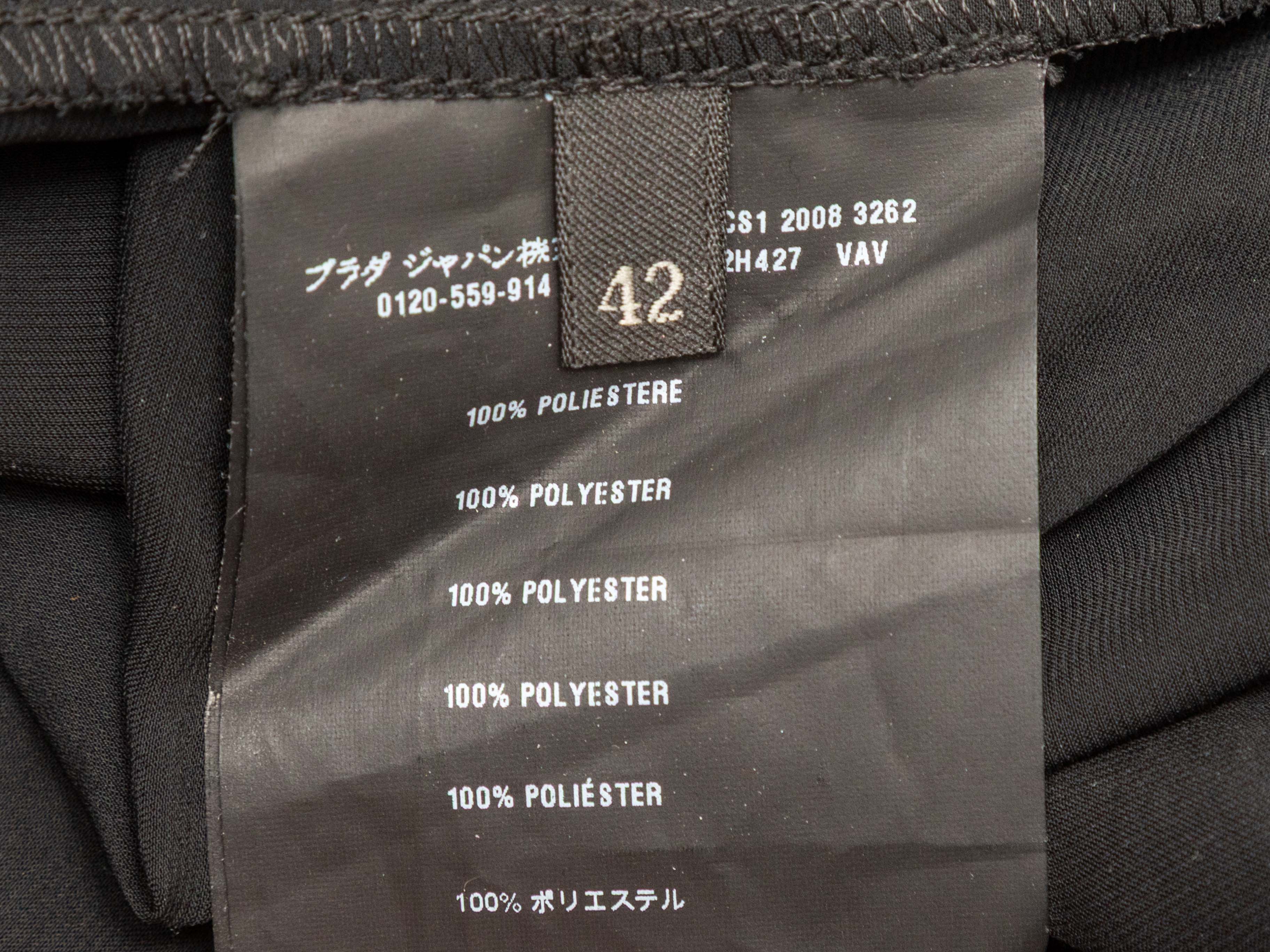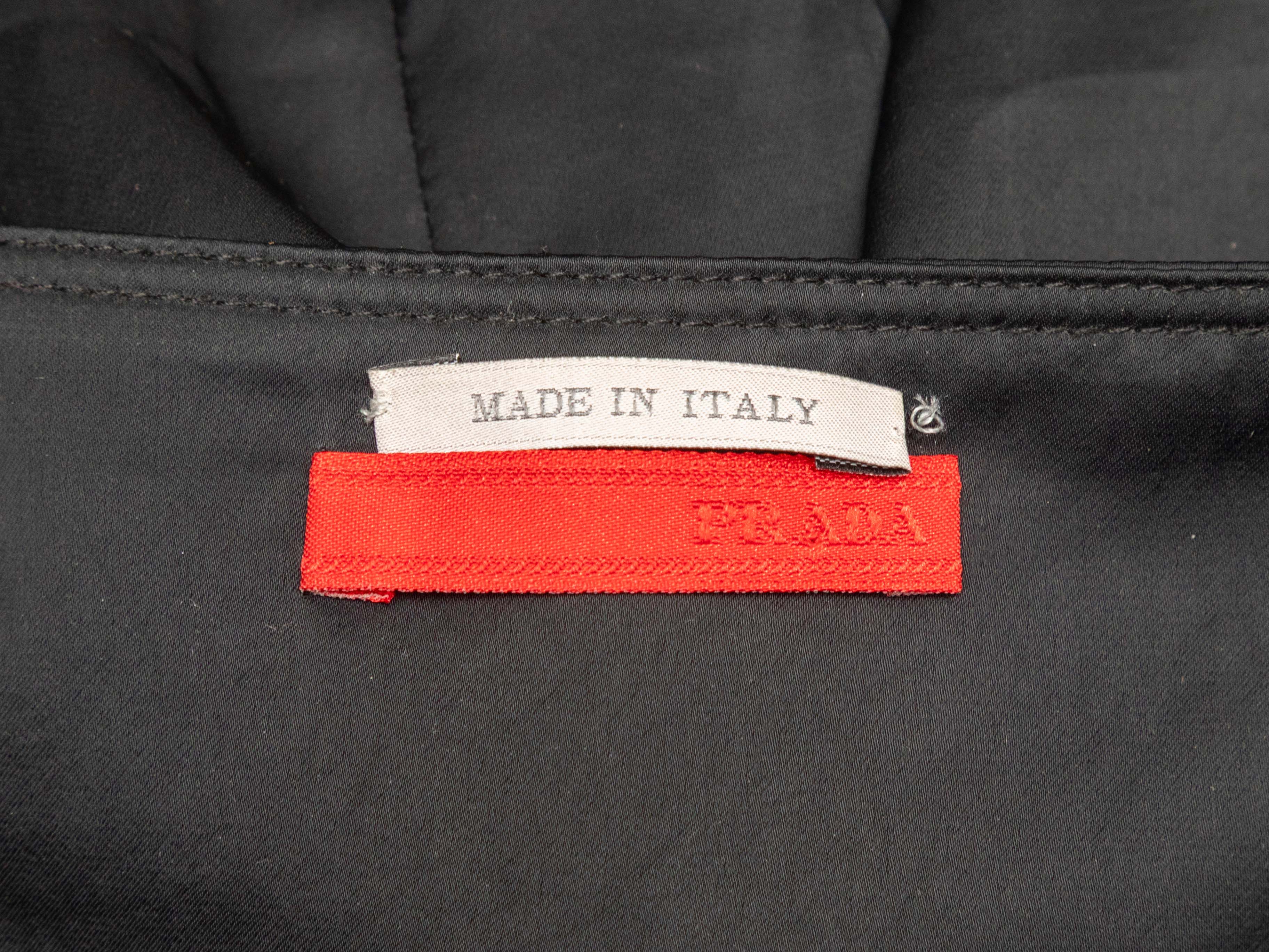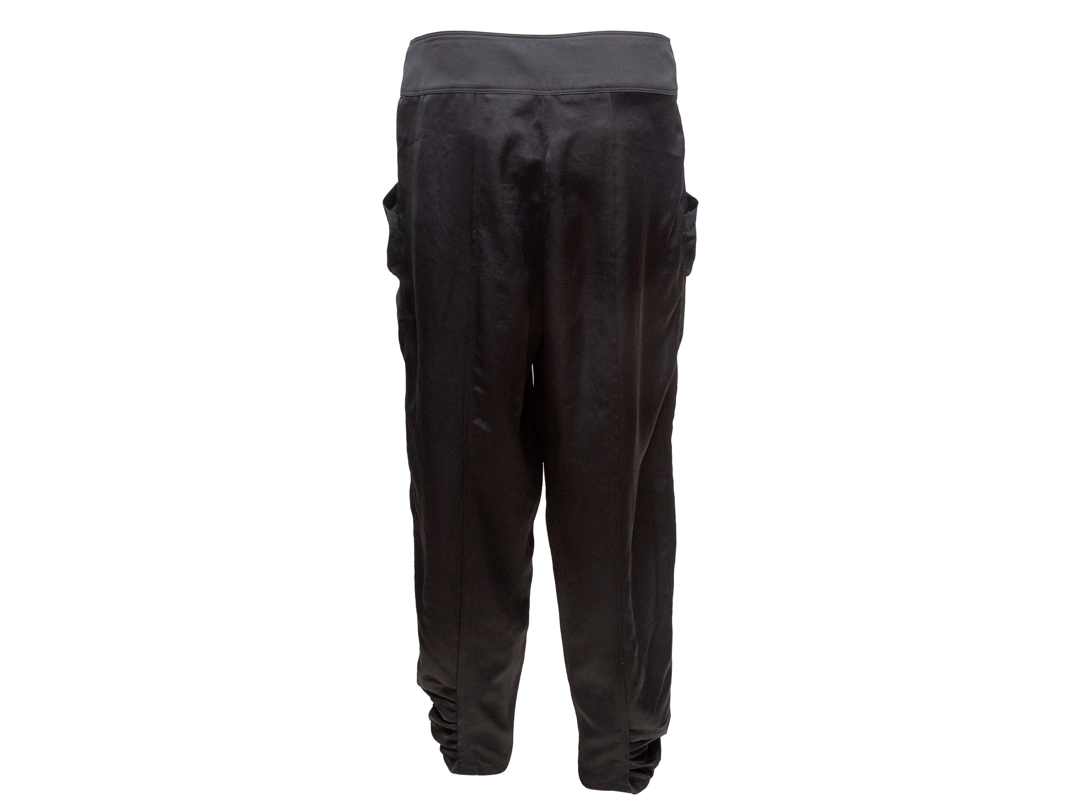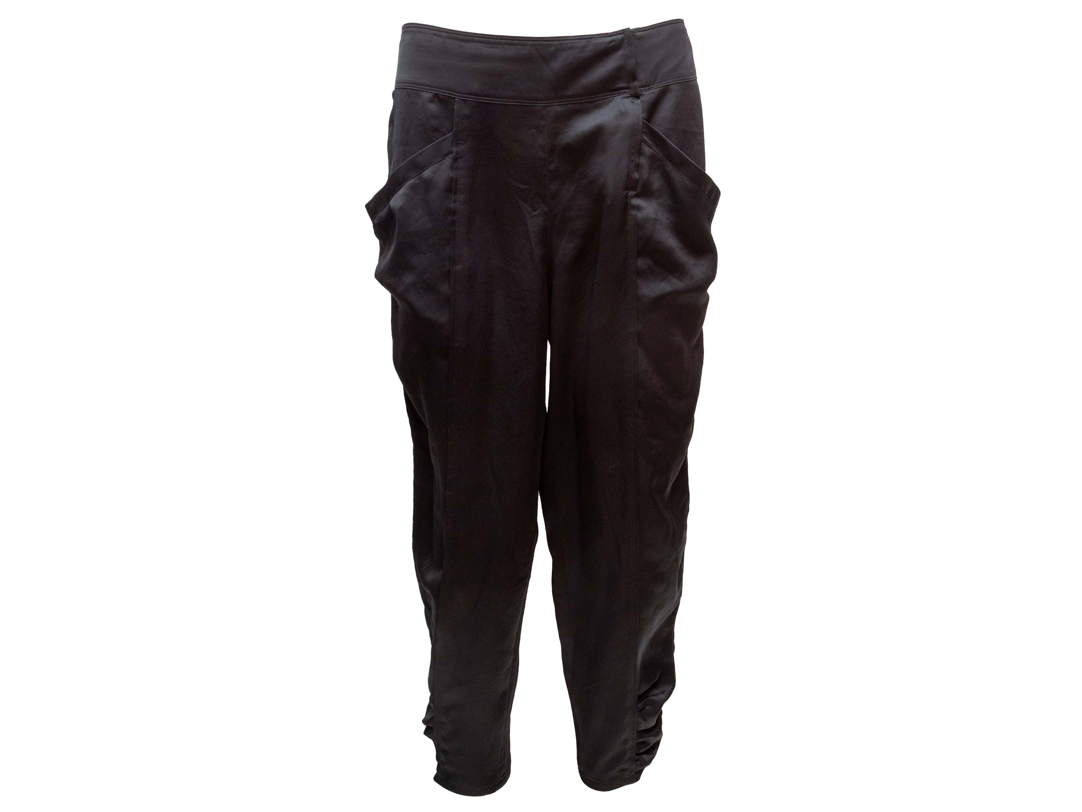 Product Details: Black satin capri pants by Prada. Dual hip pockets. Front waist closure. 31" waist, 39" hips, 23.5" inseam, 12.5" rise, 34.5" length.