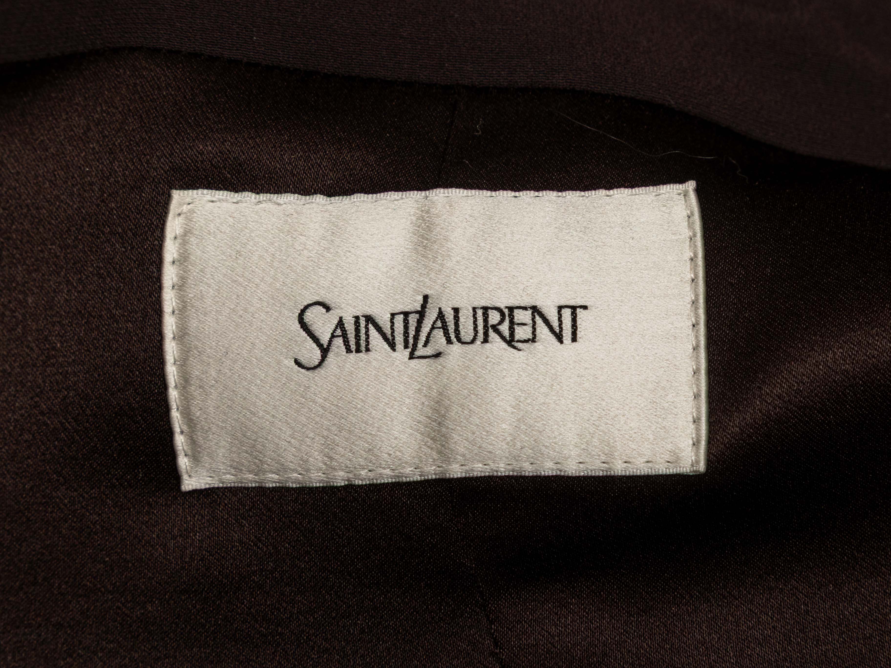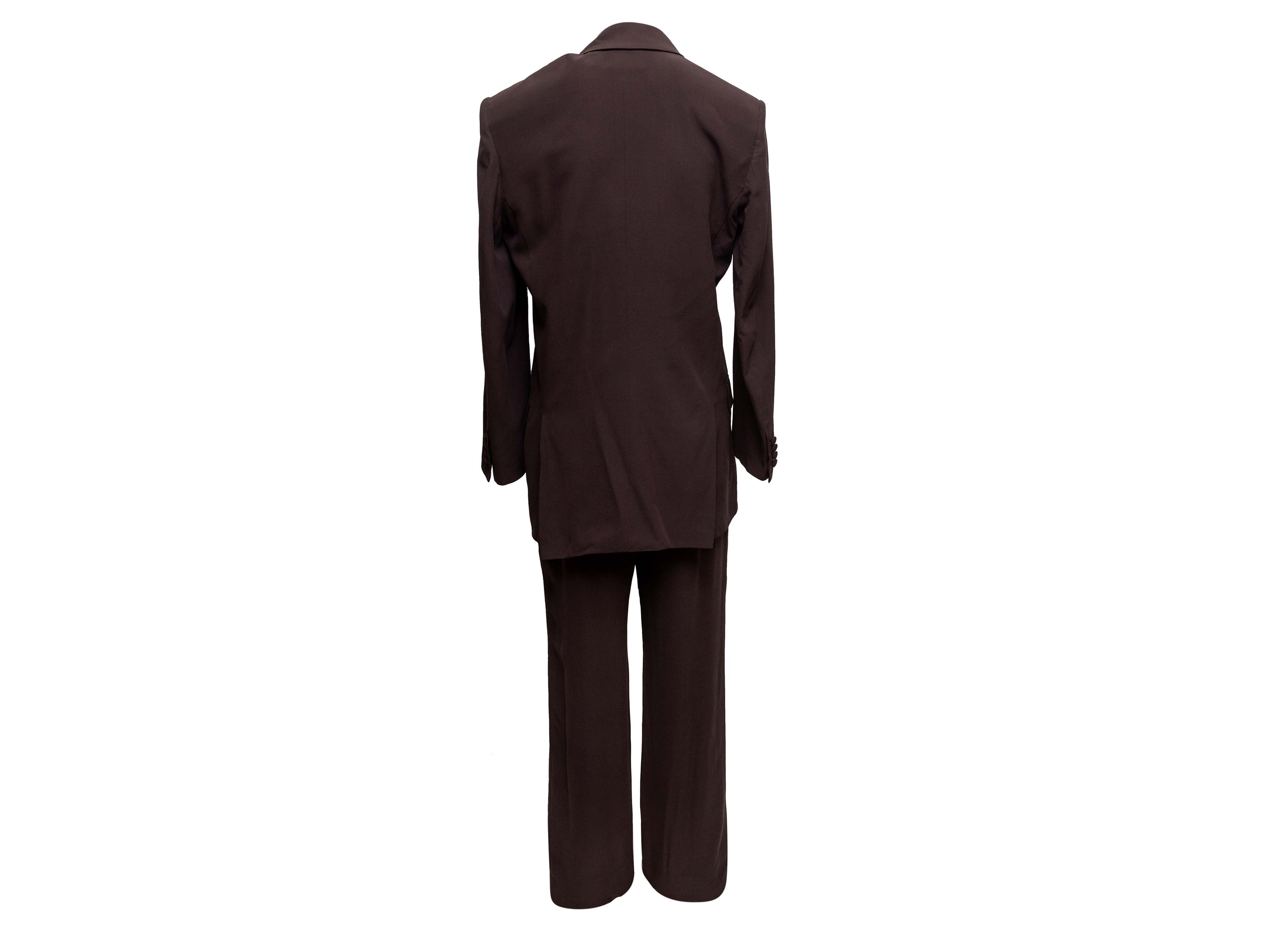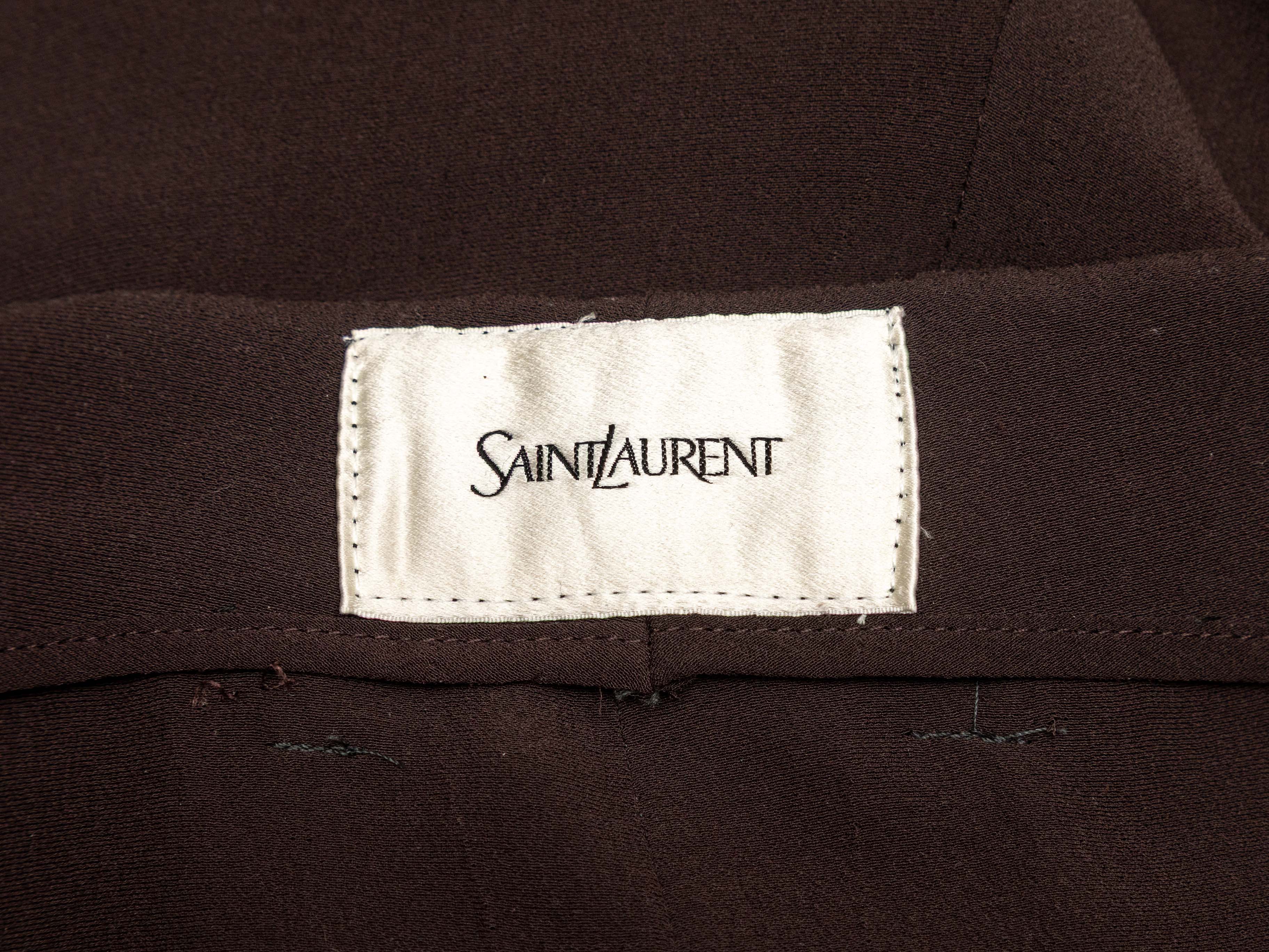 Product Details: Brown double-breasted silk pant suit by Saint Laurent. Blazer features notched collar, structured shoulders, three pockets, and front button closures. Pants feature four pockets and front zip closure. Blazer- 40" bust, 18.5" shoulder width, 24" sleeve length, 31" length; Pants- 28" waist, 39" hips, 31" inseam, 13" rise, 42.5" length.