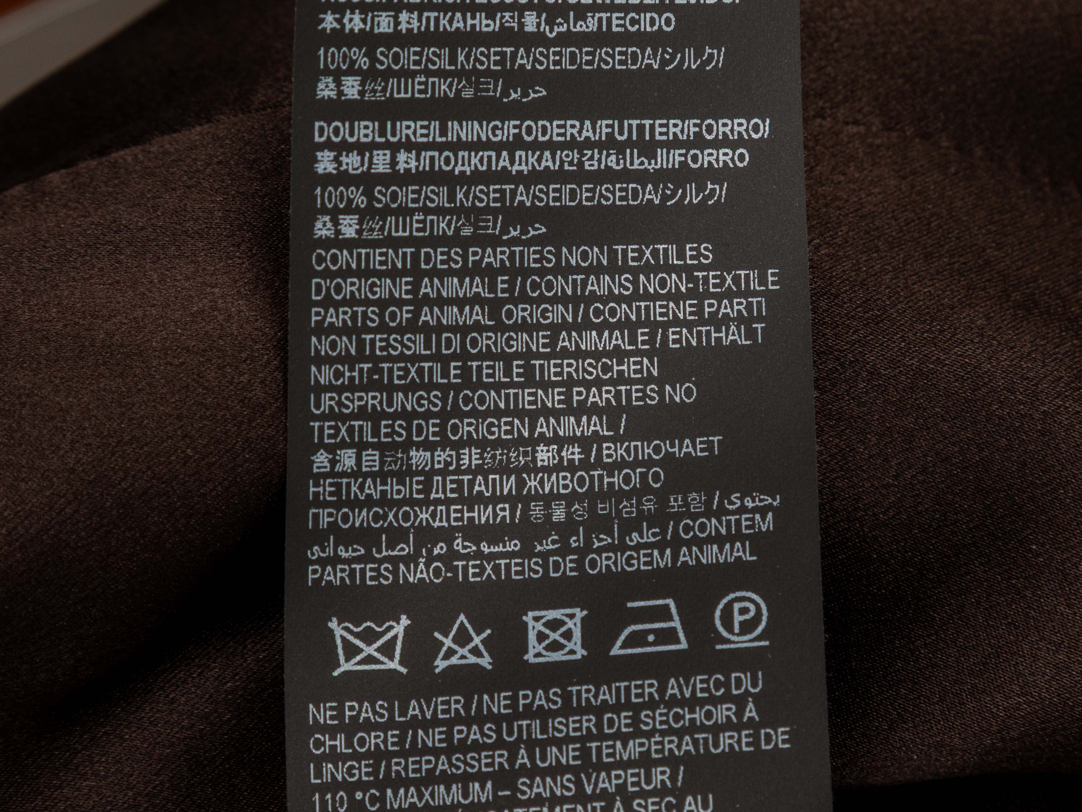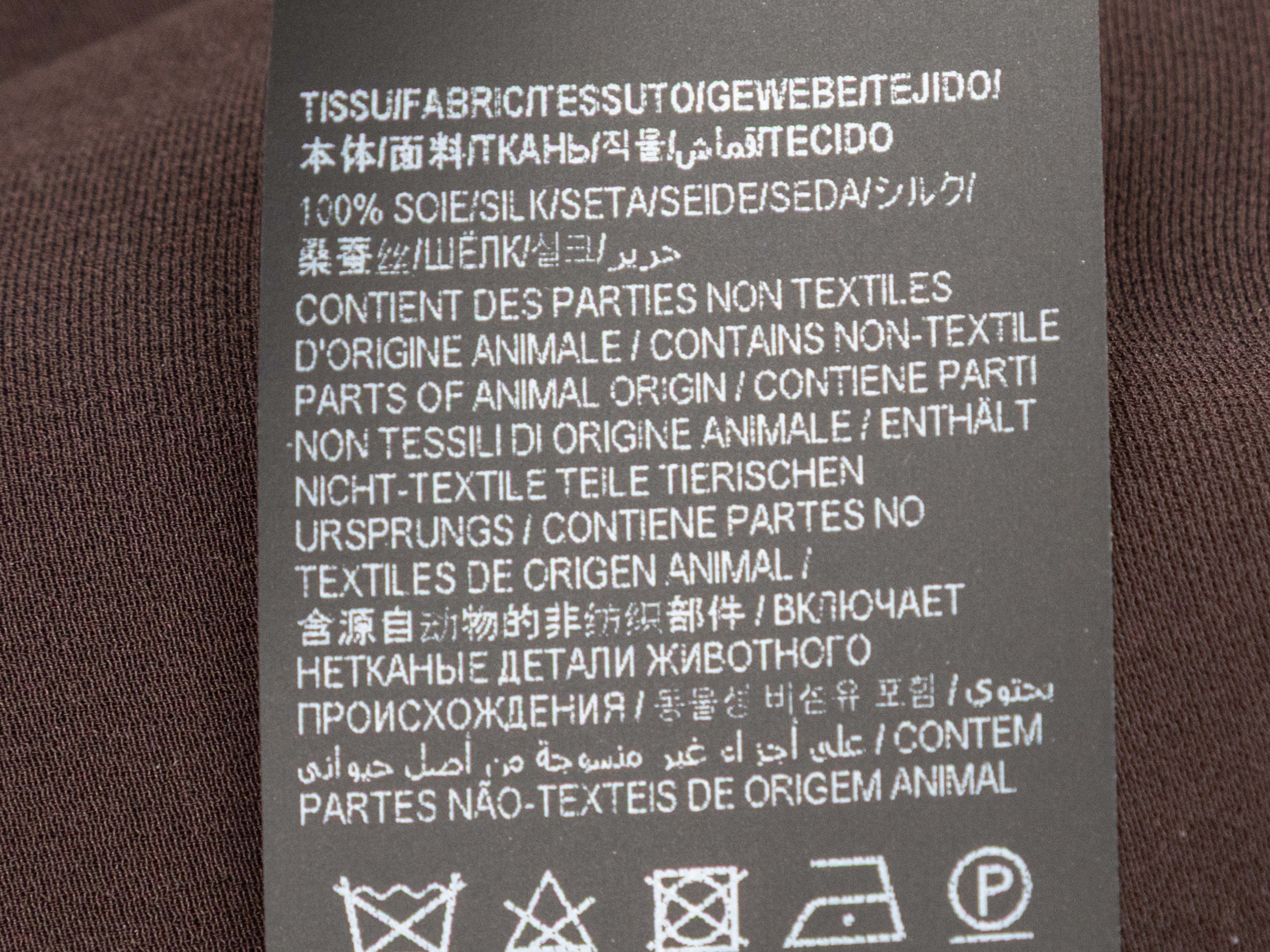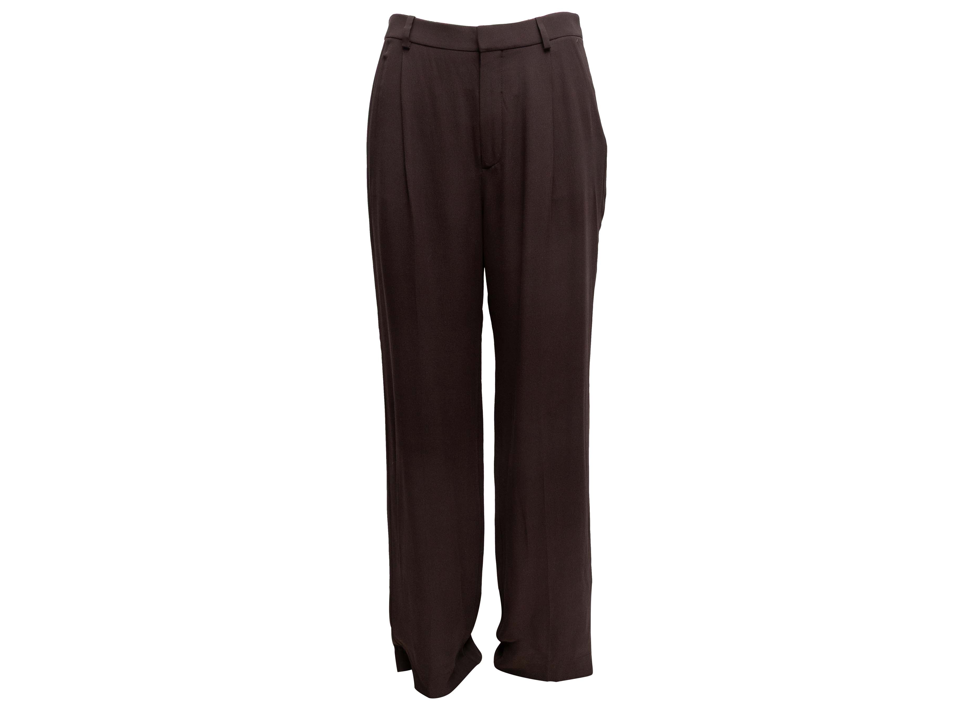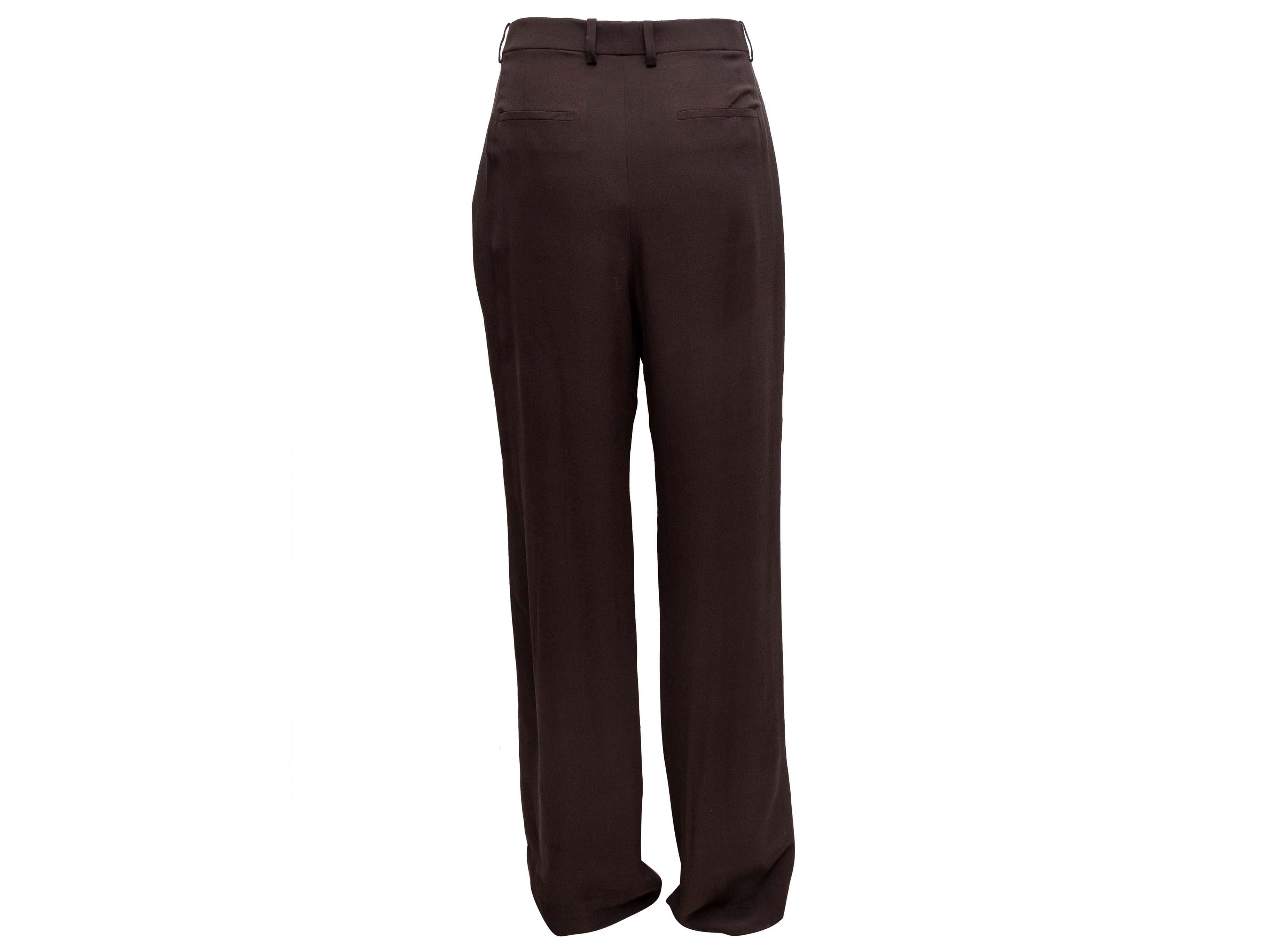 Product Details: Brown double-breasted silk pant suit by Saint Laurent. Blazer features notched collar, structured shoulders, three pockets, and front button closures. Pants feature four pockets and front zip closure. Blazer- 40" bust, 18.5" shoulder width, 24" sleeve length, 31" length; Pants- 28" waist, 39" hips, 31" inseam, 13" rise, 42.5" length.