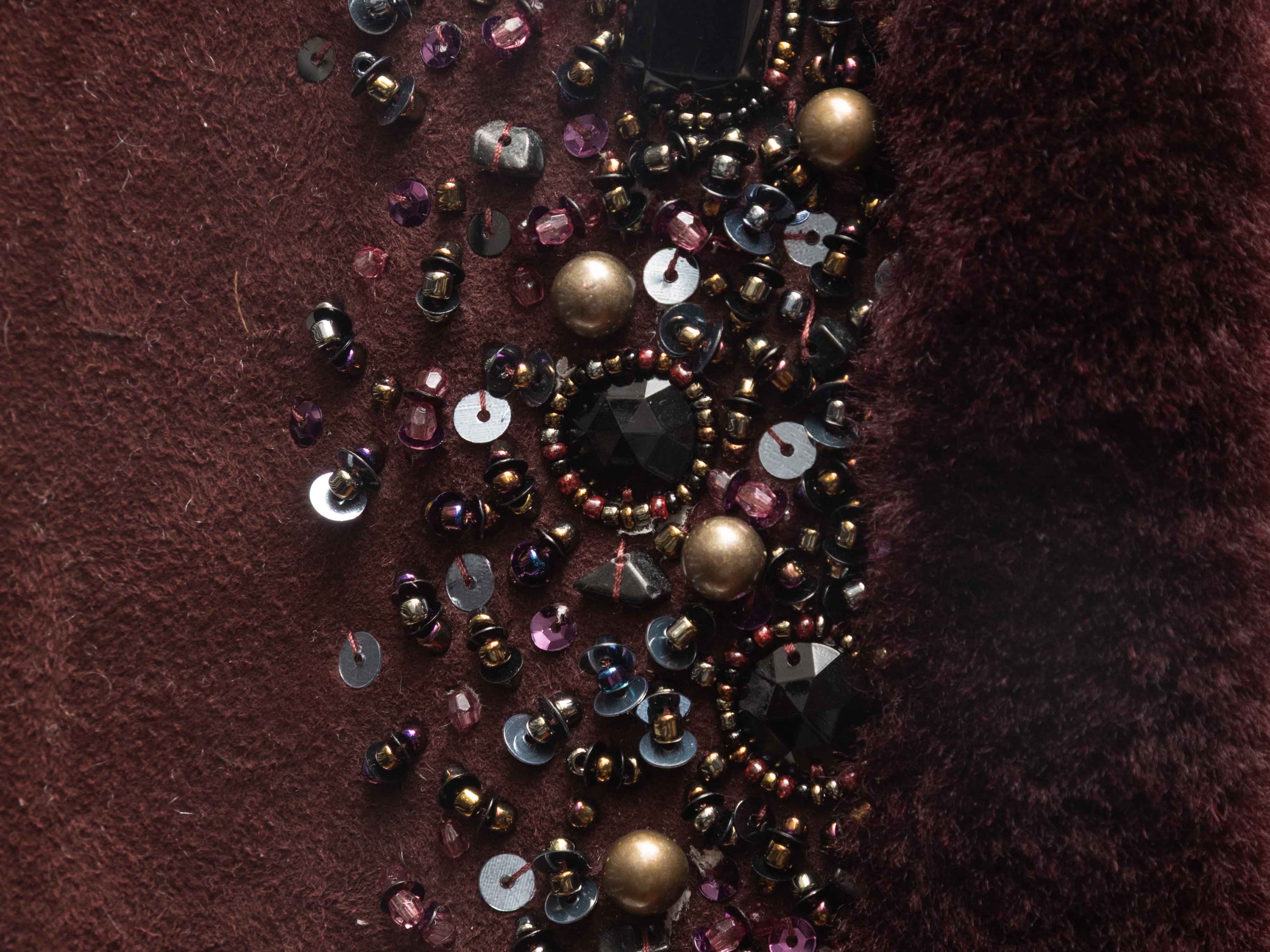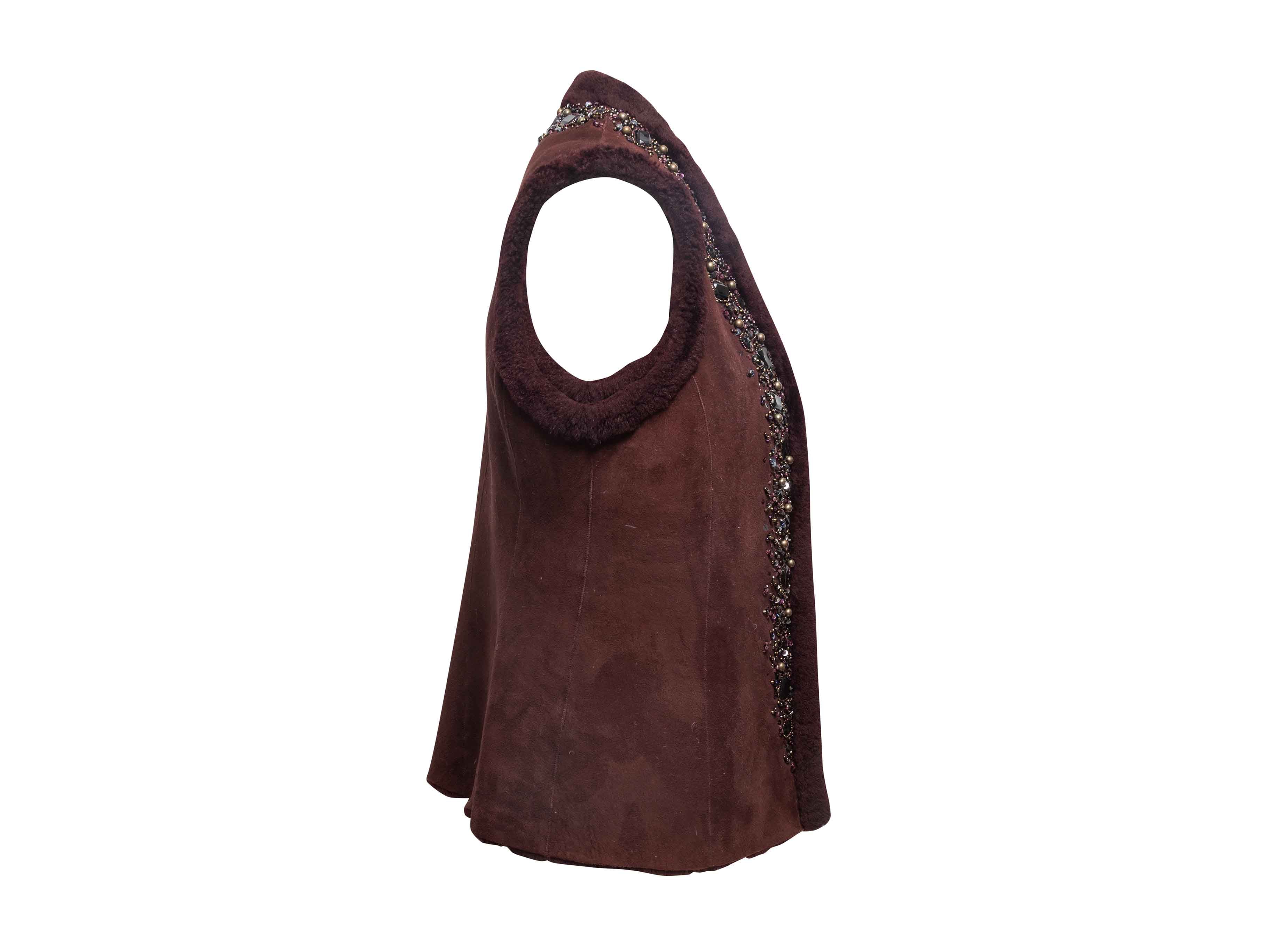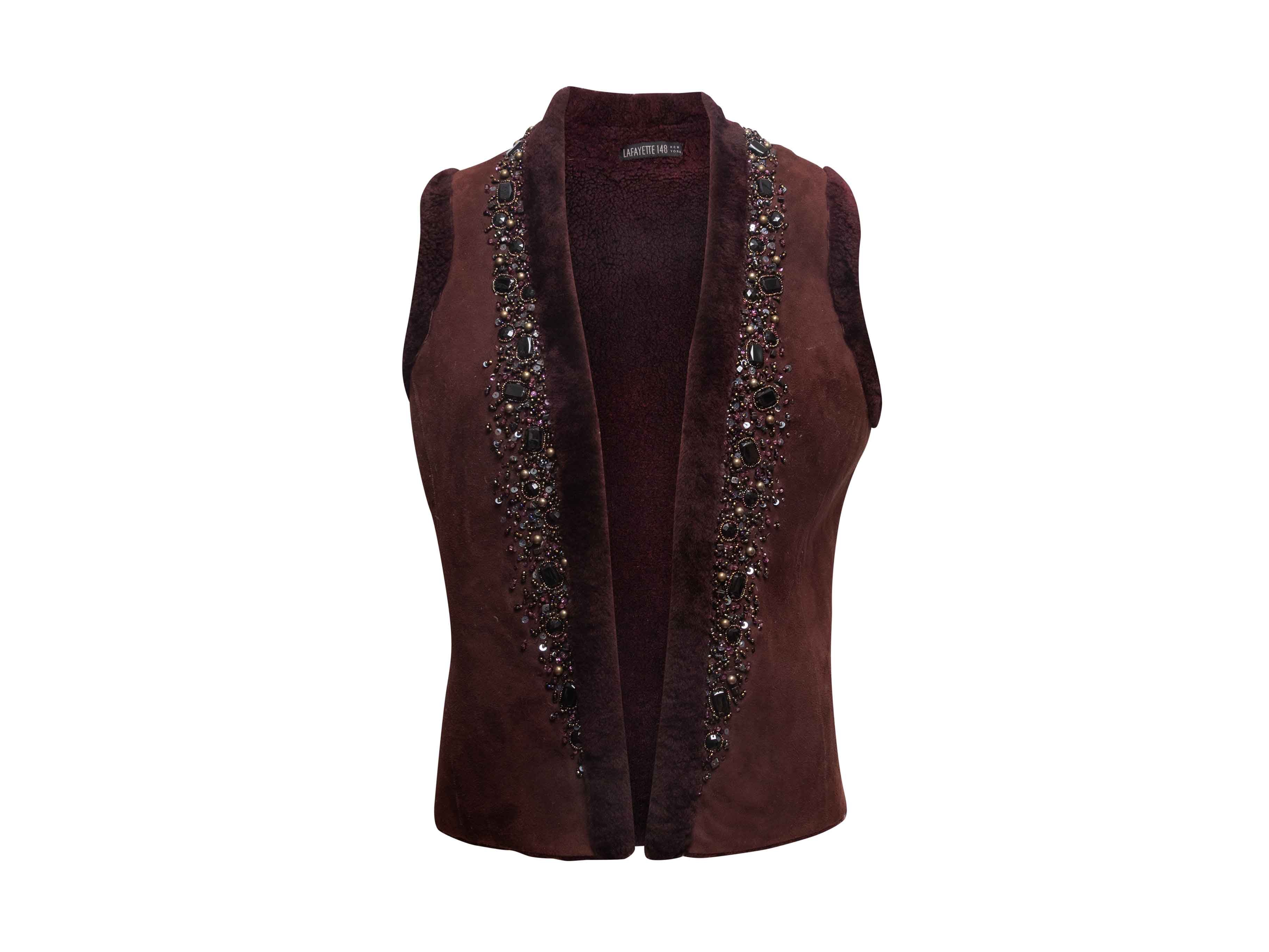 Product Details: Burgundy shearling open front embellished vest by Lafayette 148. Bead and sequin embellishments alonge neckline. 36" bust, 15.5" shoulder width, 25" length.