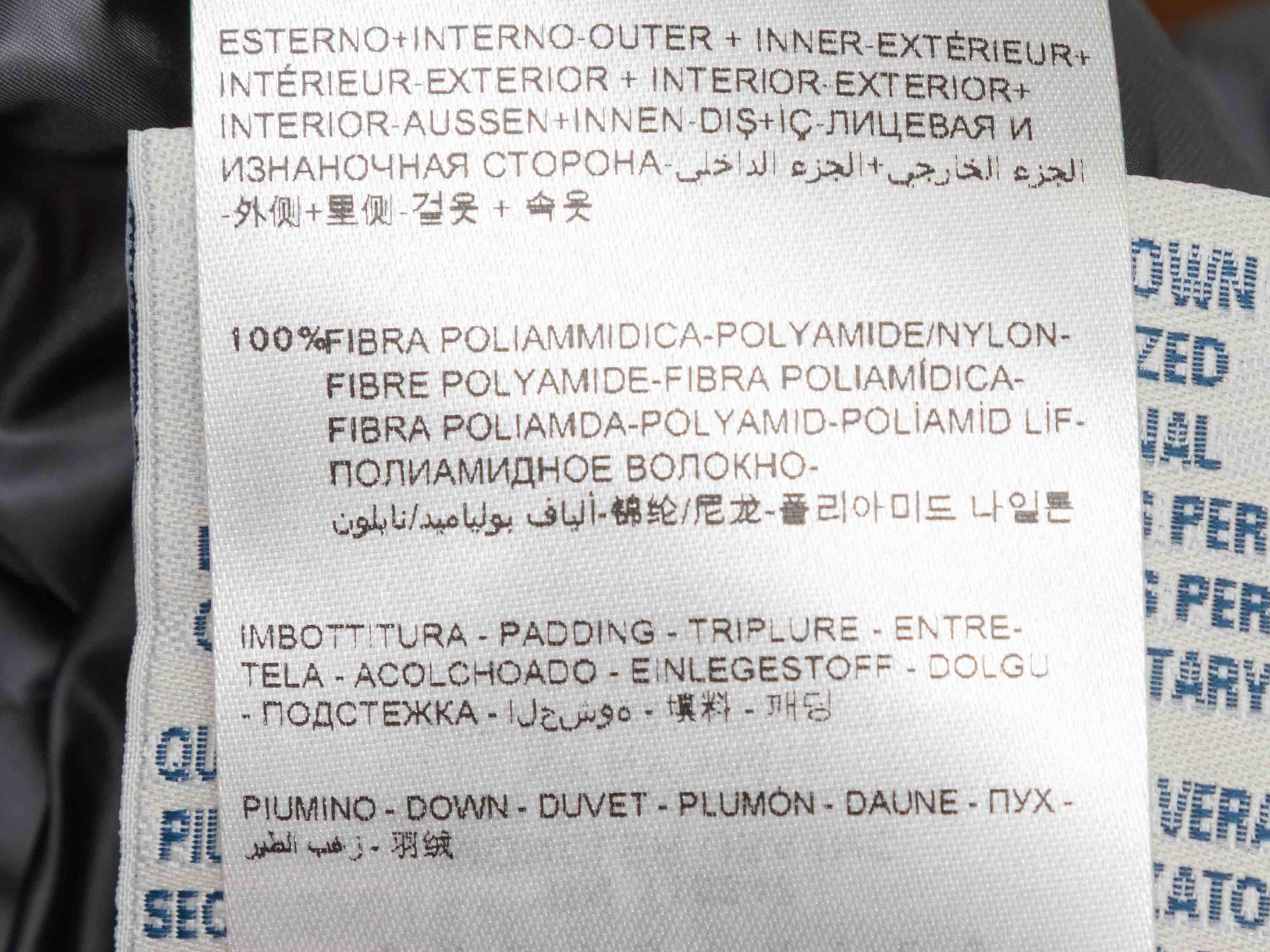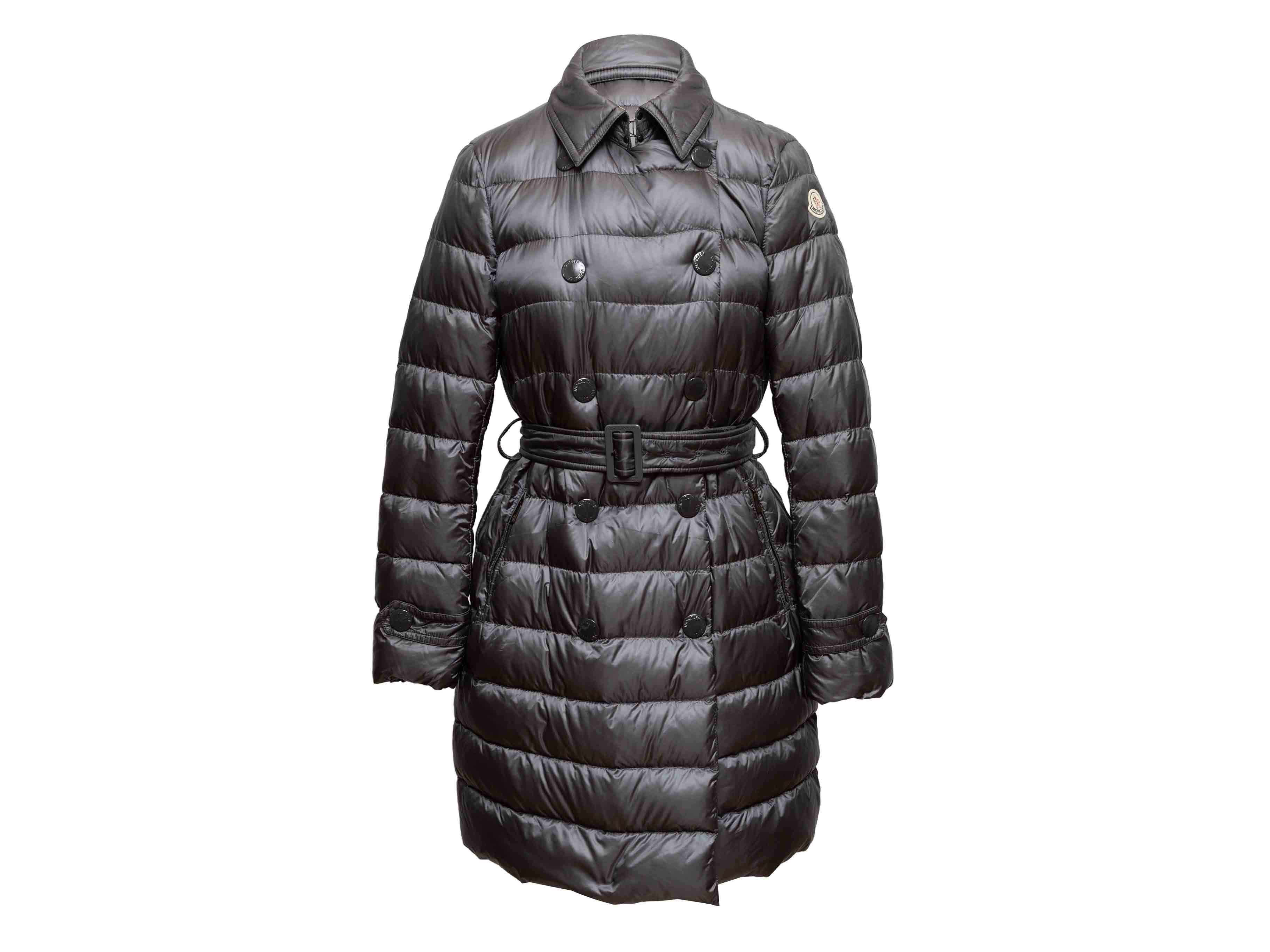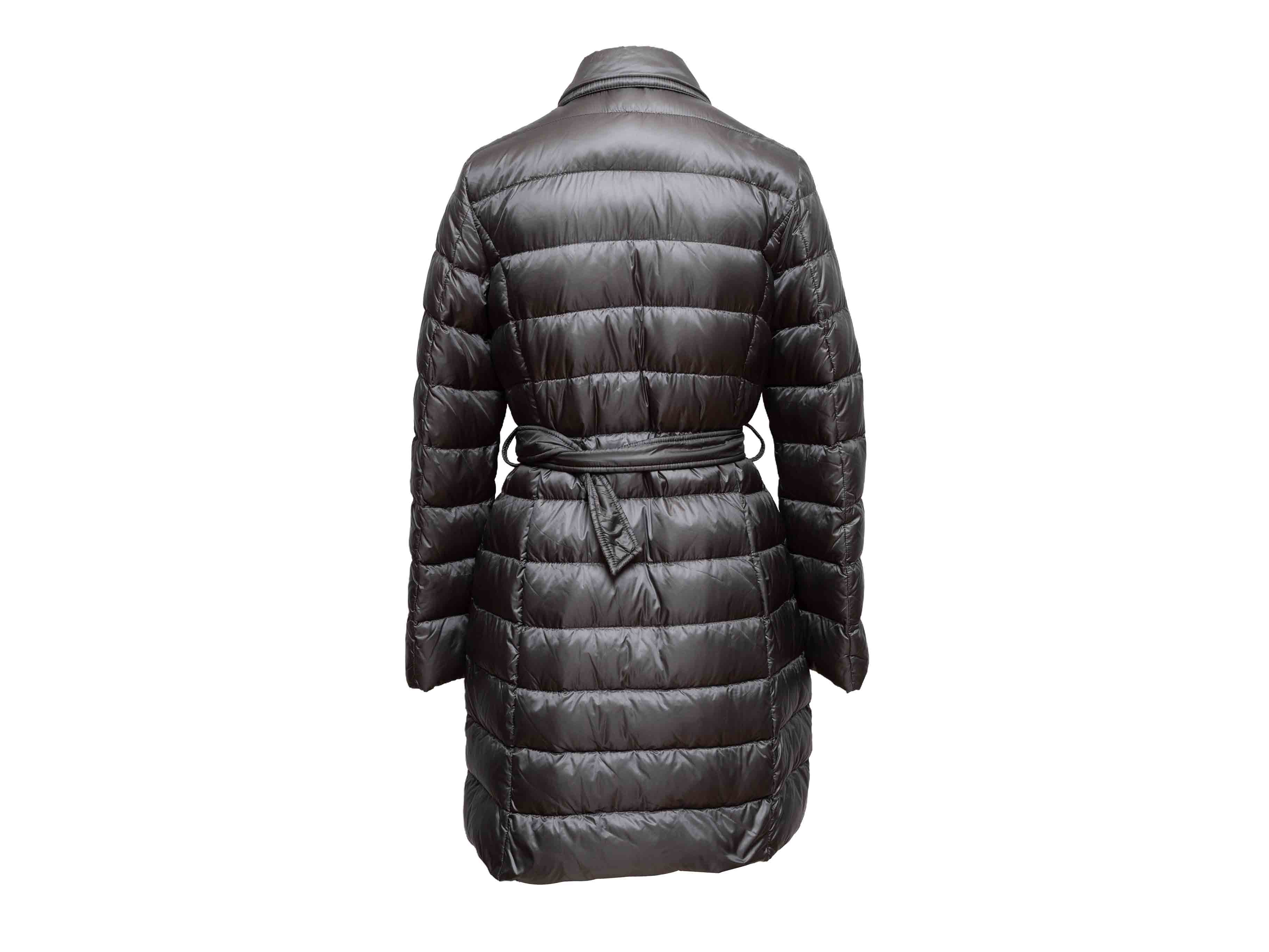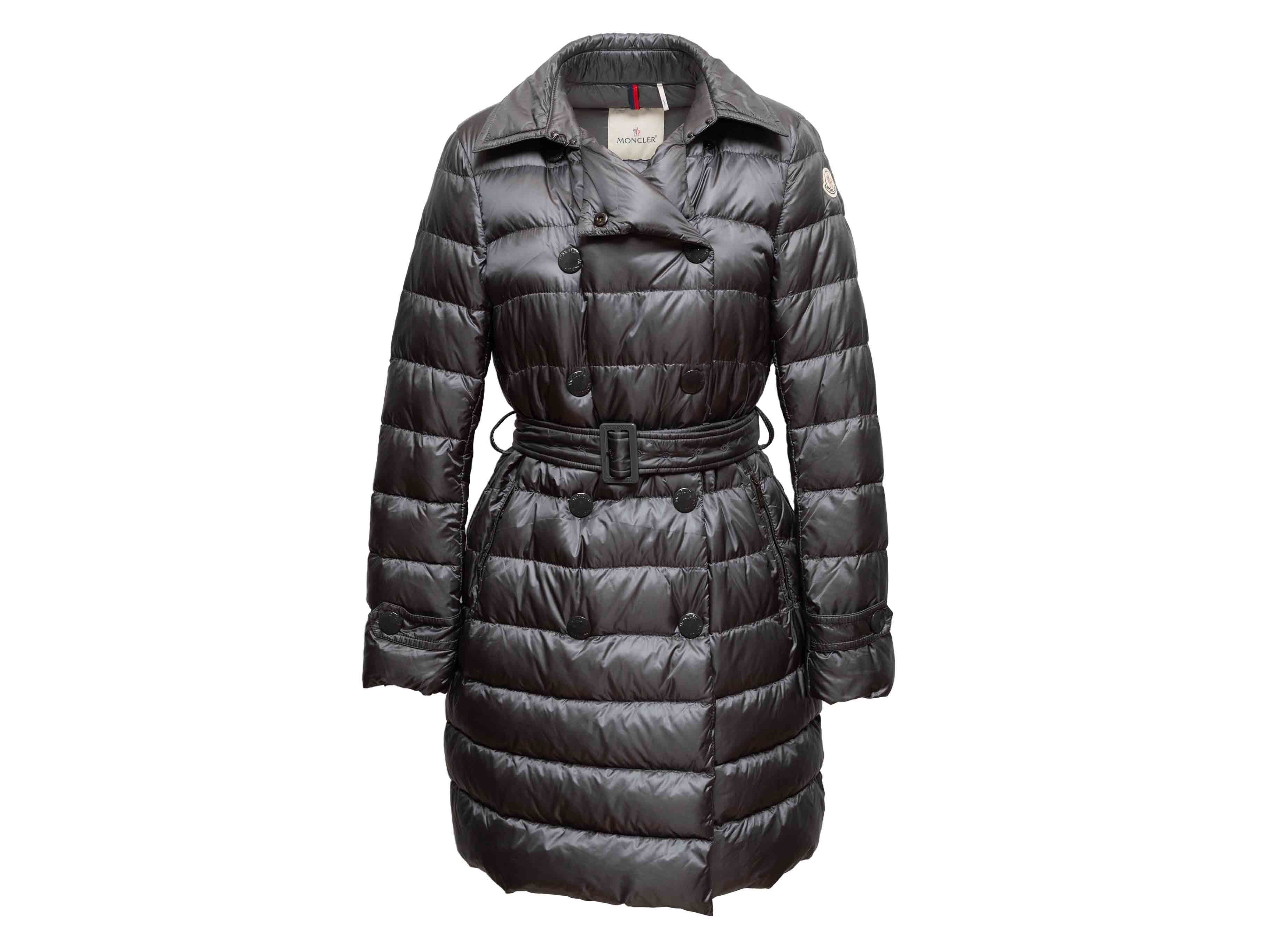 Product Details: Grey double-breasted down puffer coat by Moncler. Pointed collar. Dual hip pockets. Belt at waist. Front zip and snap closures. 41" bust, 16" shoulder width, 24" sleeve length, 36" length.
