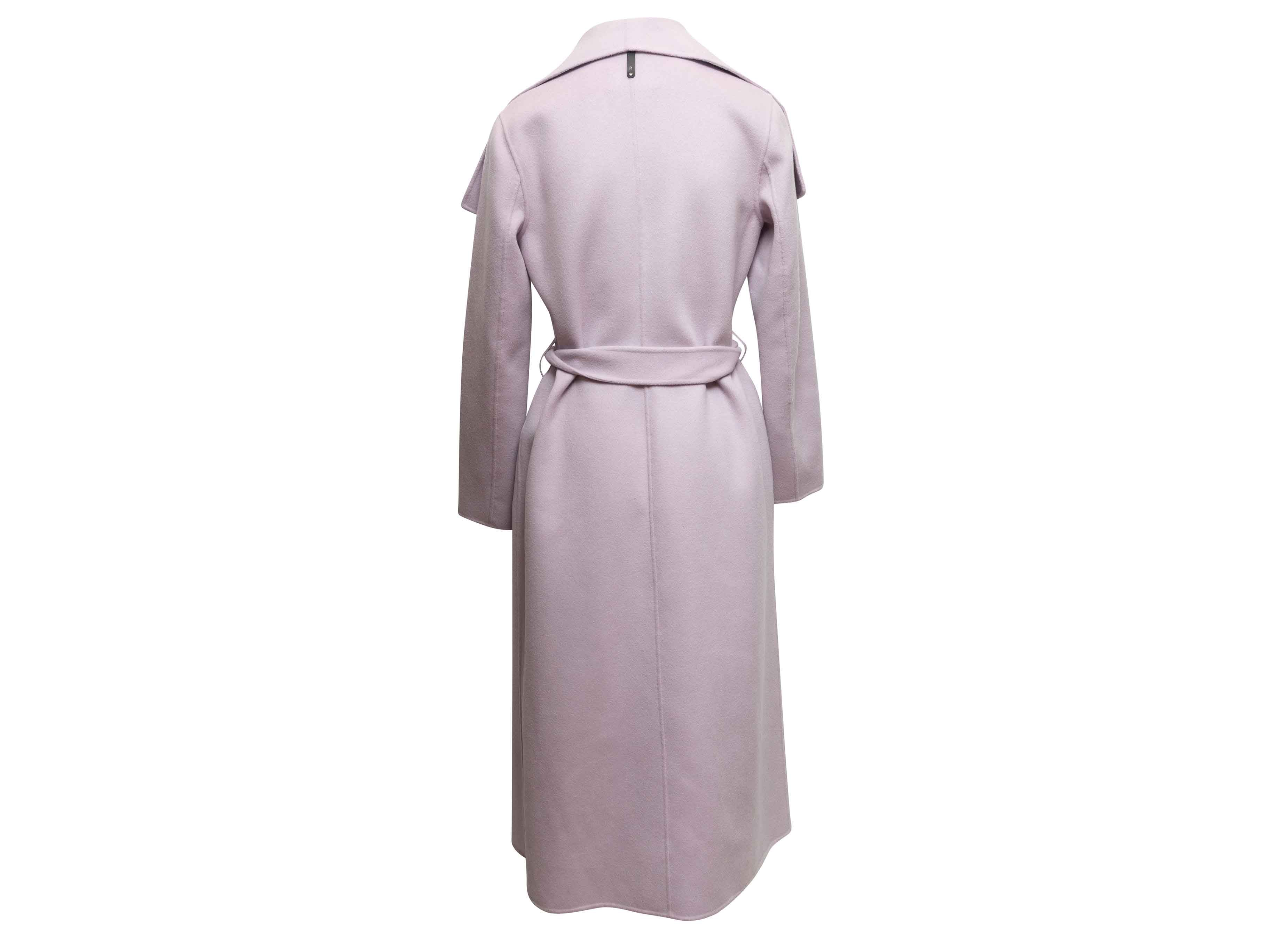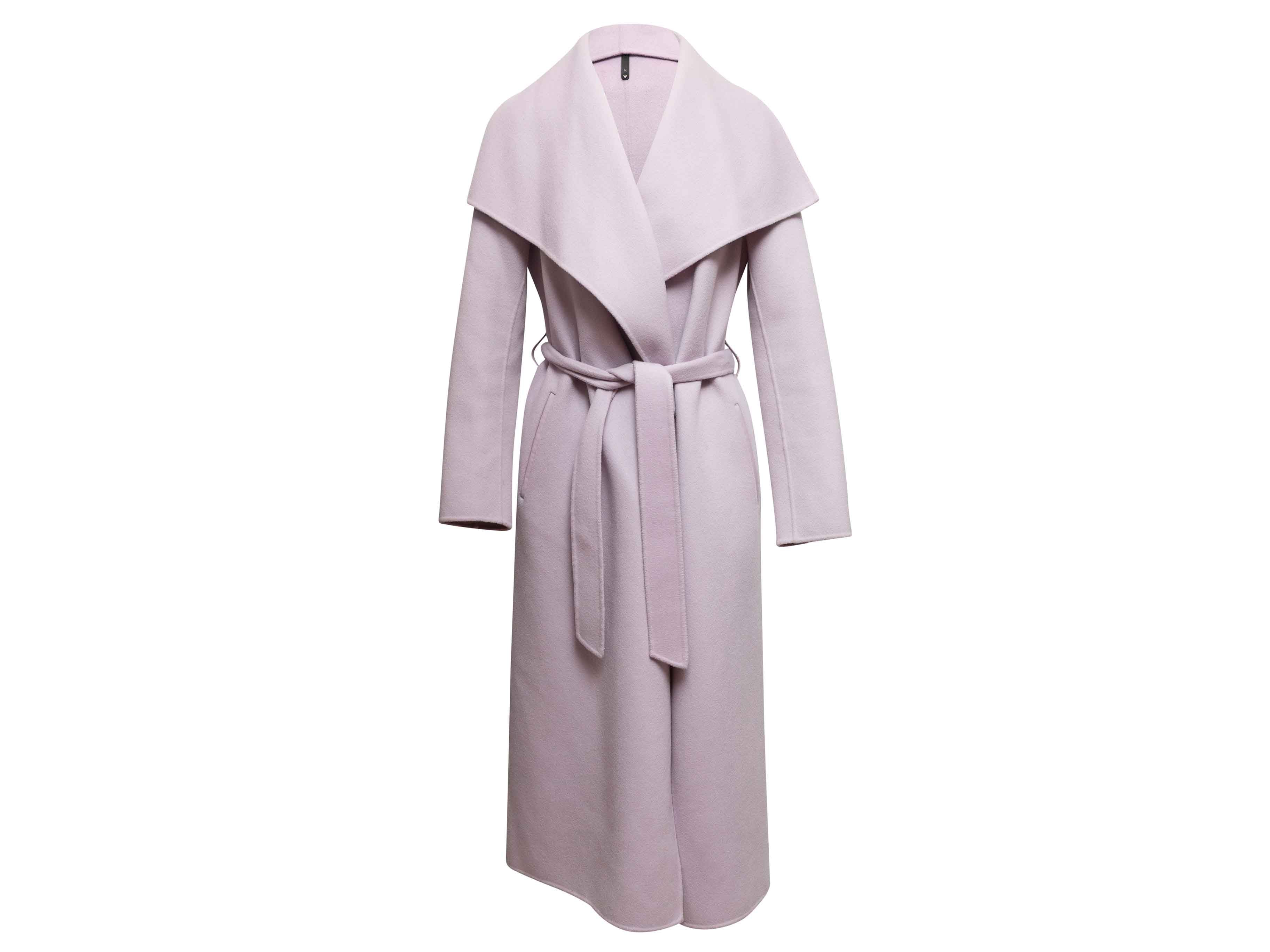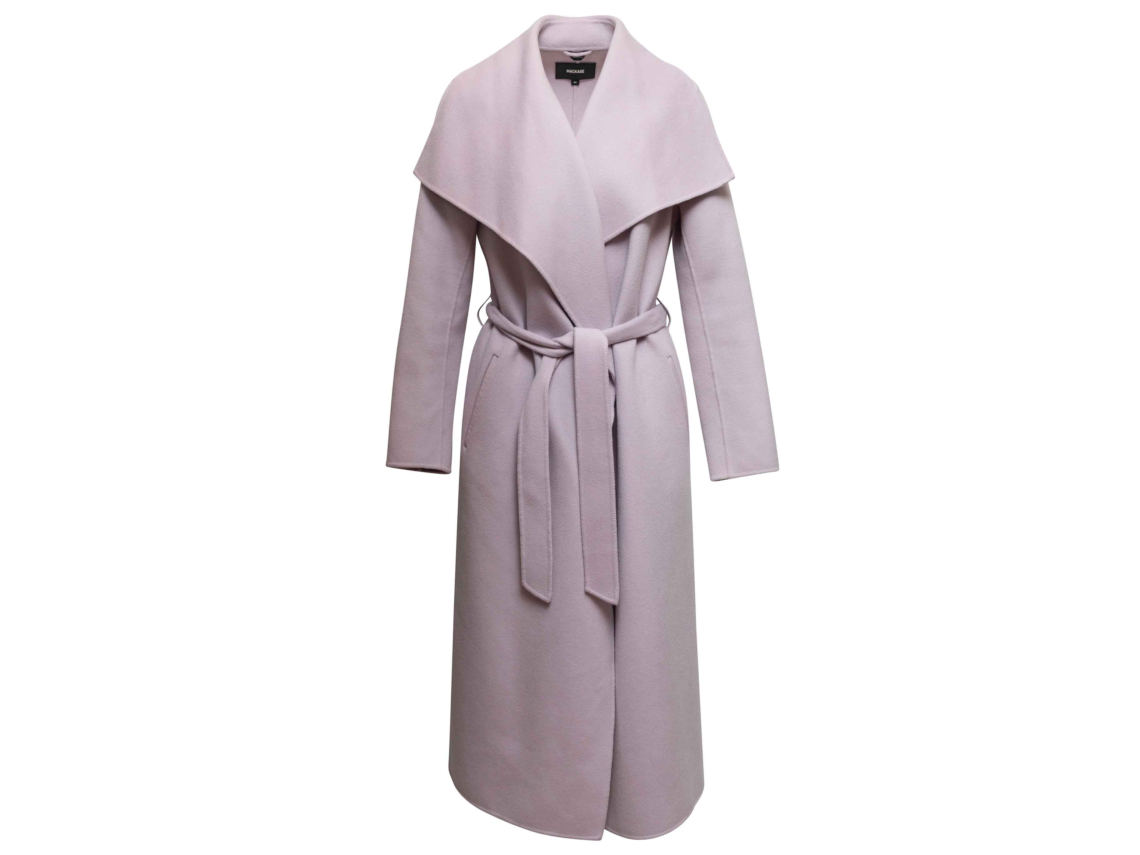 Product Details: Lilac wool leather-trimmed long coat by Mackage. Oversized collar. Dual hip pockets. Sash tie closure at waist. 34" bust, 17" shoulder width, 24" sleeve length, 50" length.